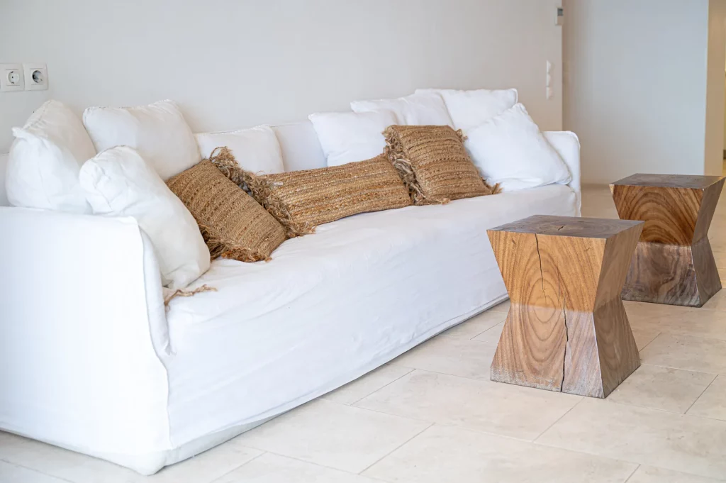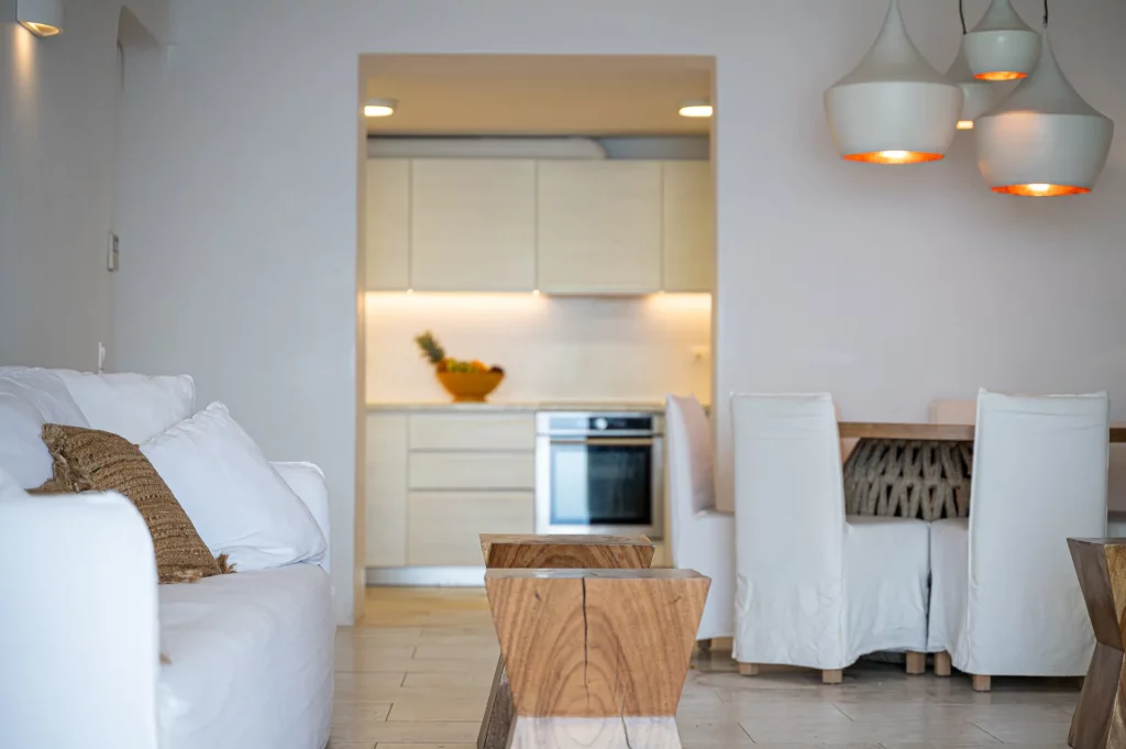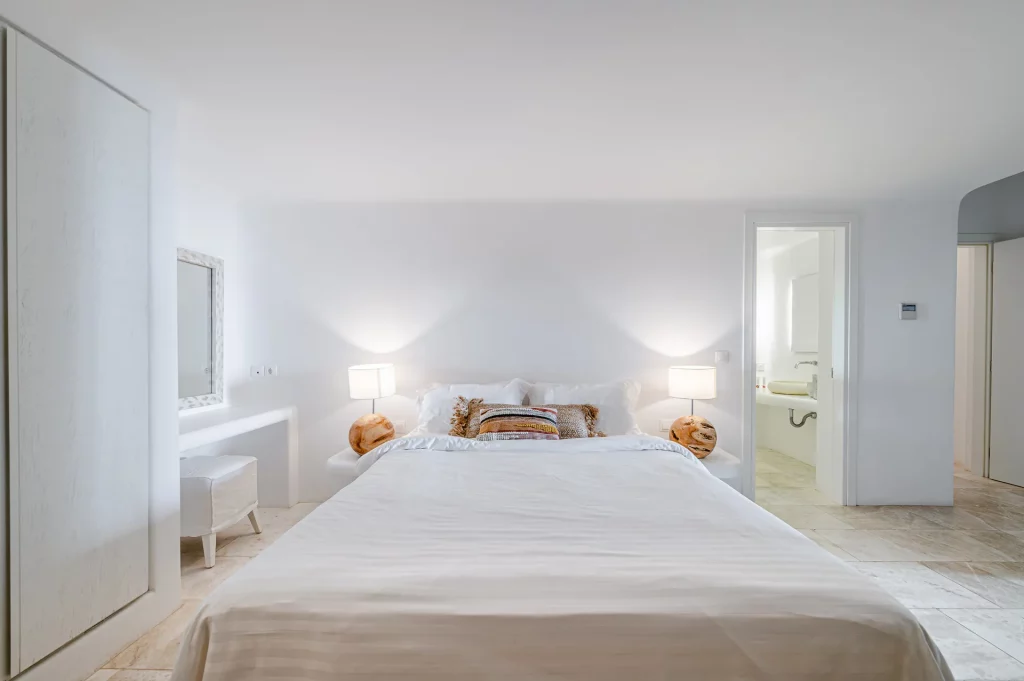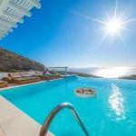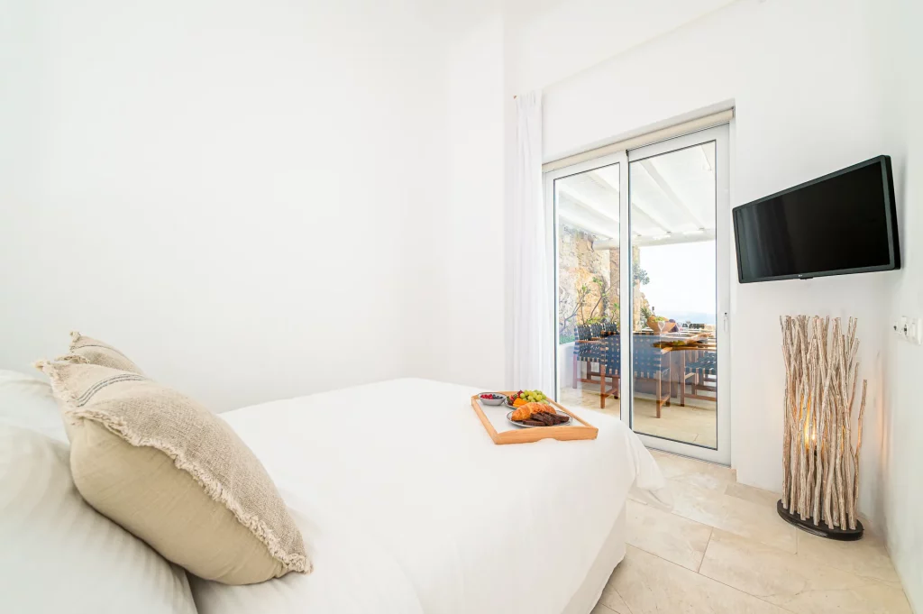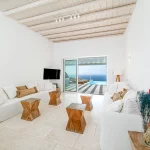 Inside, the villa features elegant finishes, natural tones, and custom furniture that reflect its luxurious yet inviting atmosphere. The open-plan layout includes a designer kitchen, two single sofa beds in the living room, and four en-suite bedrooms, two of which open directly to sea-view balconies. Perfect for groups or families of up to ten guests, Elesia Villa Helios is designed for stylish relaxation and unforgettable sunsets.