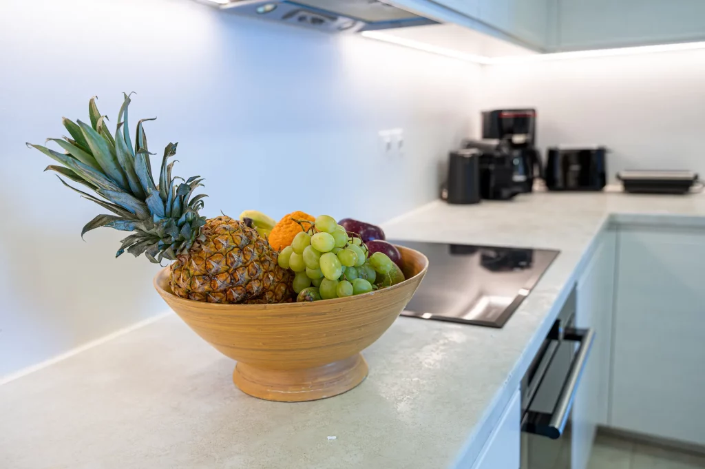 Open-plan fully equipped kitchen with modern appliances