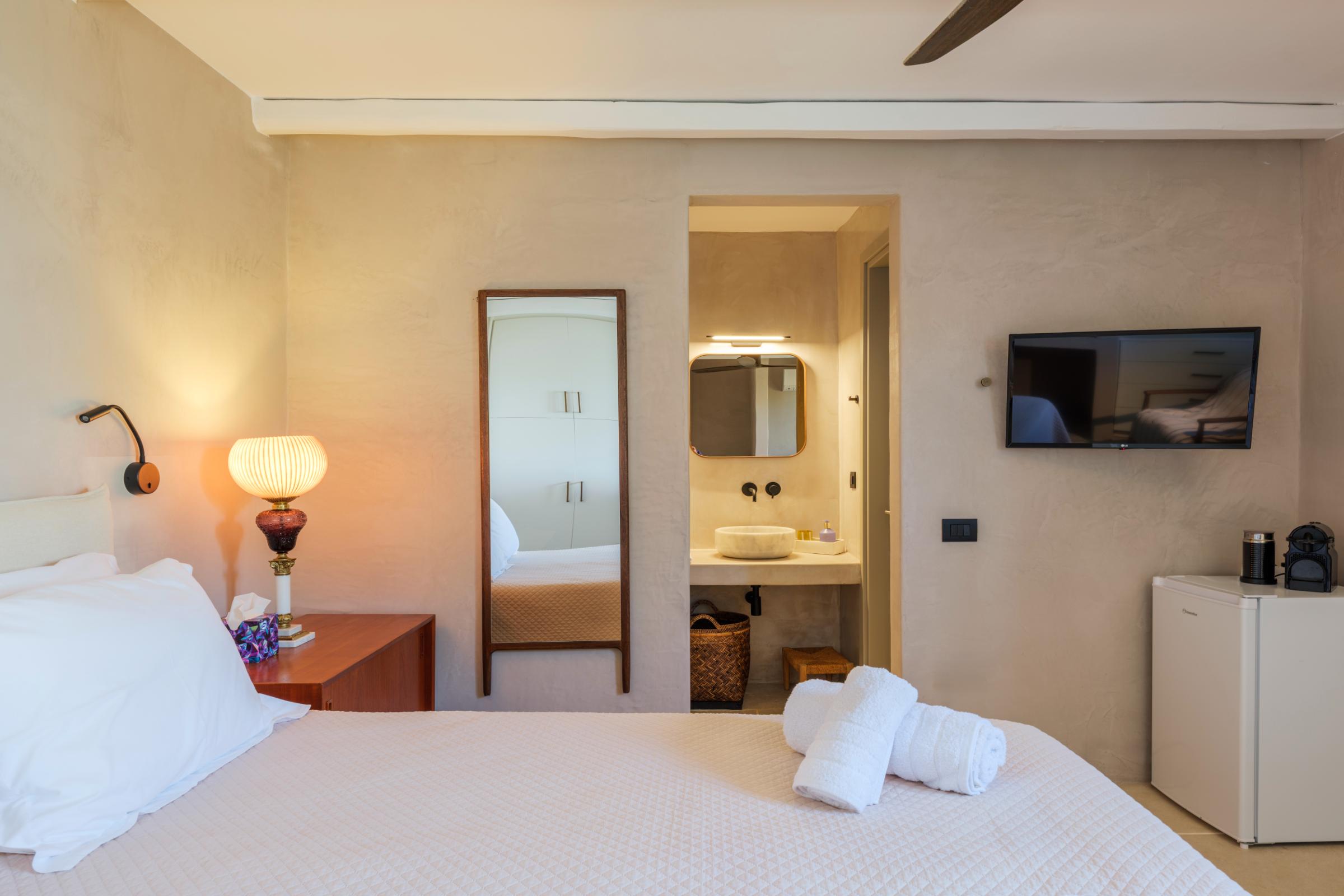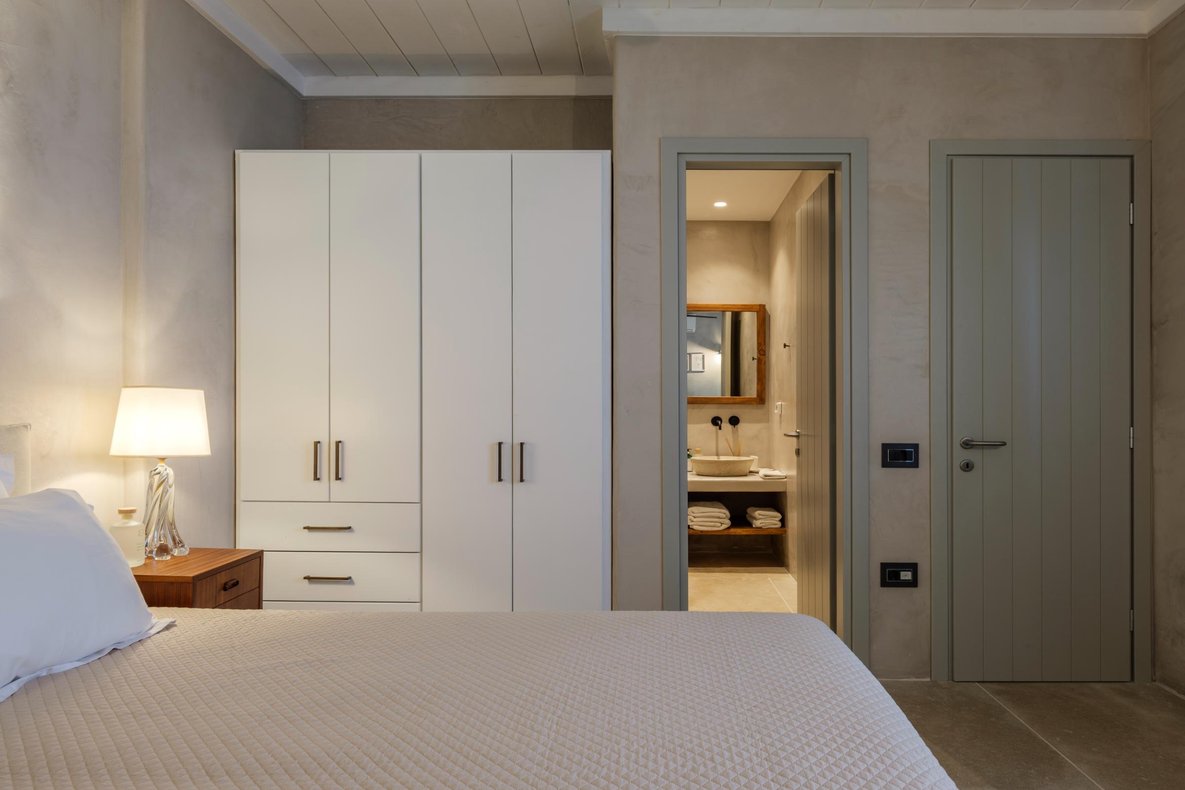 Designed for laid-back sophistication, the villa comfortably accommodates up to 10 guests across five beautifully appointed double bedrooms, each with its own en-suite bathroom. The upper level houses two sea-view bedrooms with shared balcony access, while the pool level offers two more ensuite bedrooms and an additional guest room with an independent entrance—perfect for added privacy.