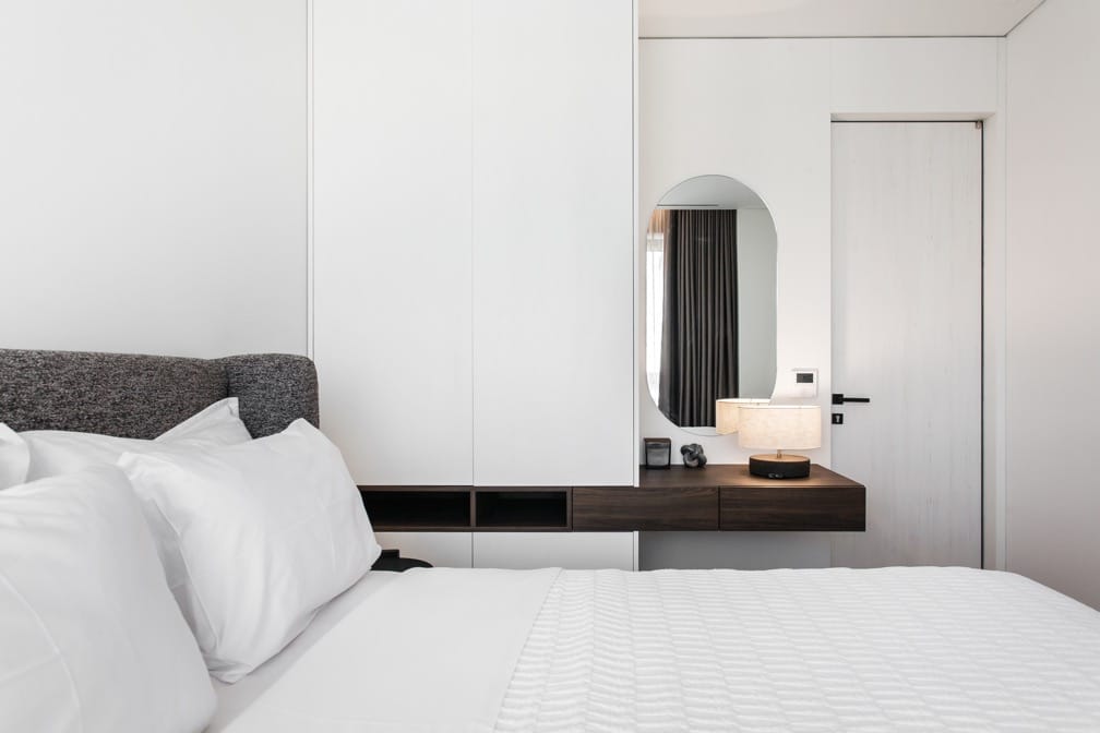 With open-plan design, high-end wooden flooring, and large windows that flood the space with natural light, this residence balances minimalism and comfort effortlessly. The living and dining areas connect seamlessly to the stylish kitchen, fully equipped for long-term stays. A private balcony wraps the apartment, offering panoramic views of the Aegean Sea and direct access from every bedroom.
