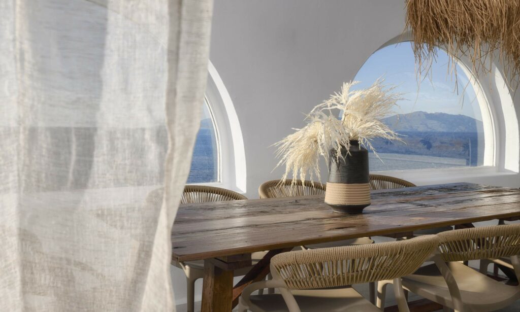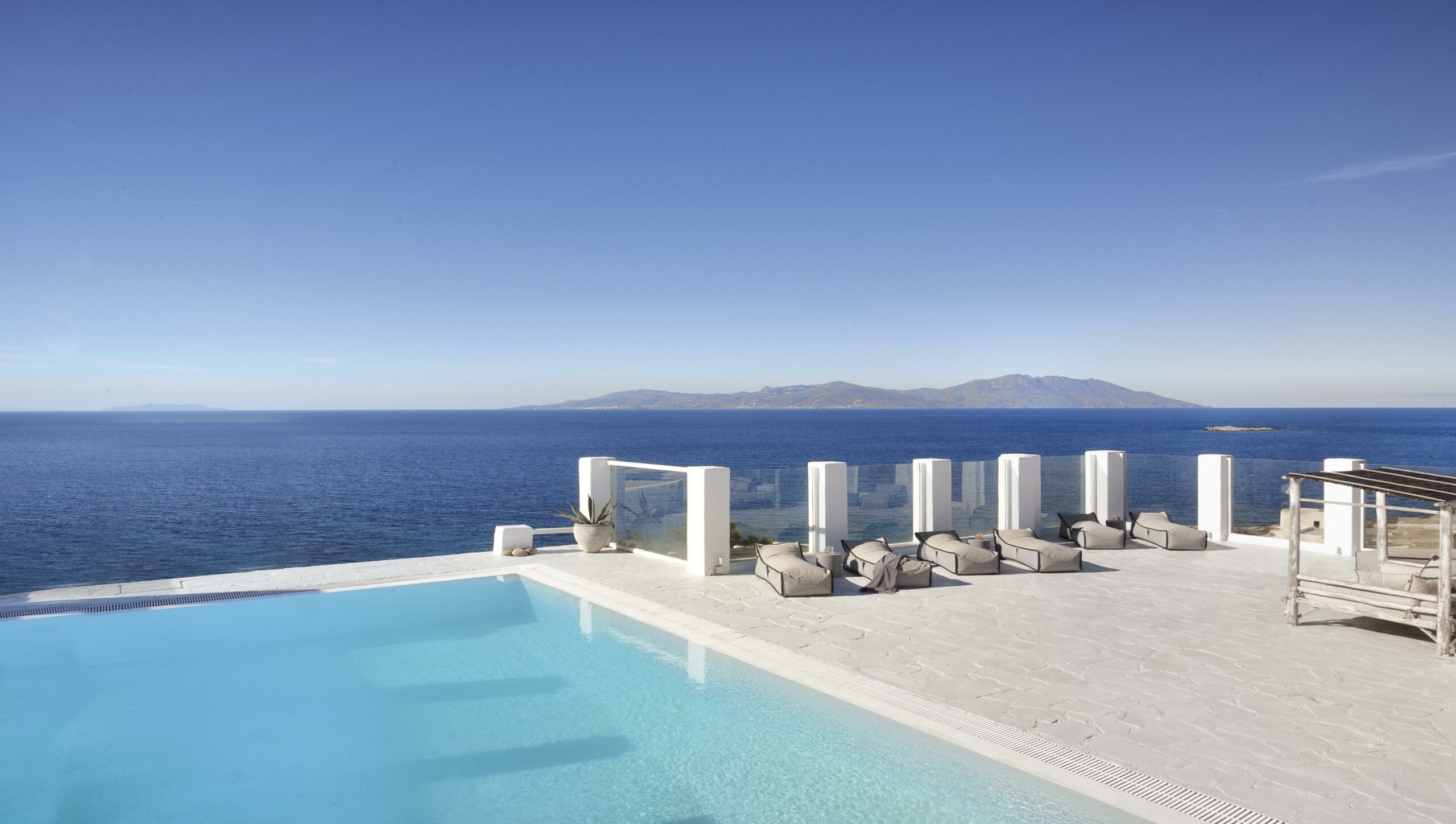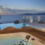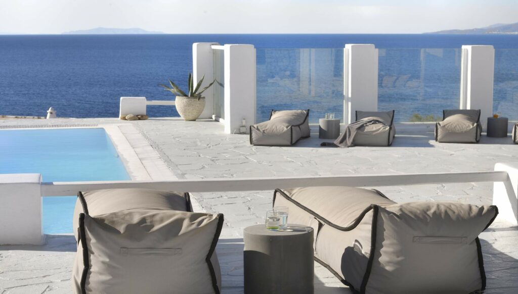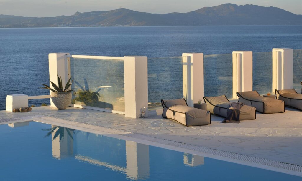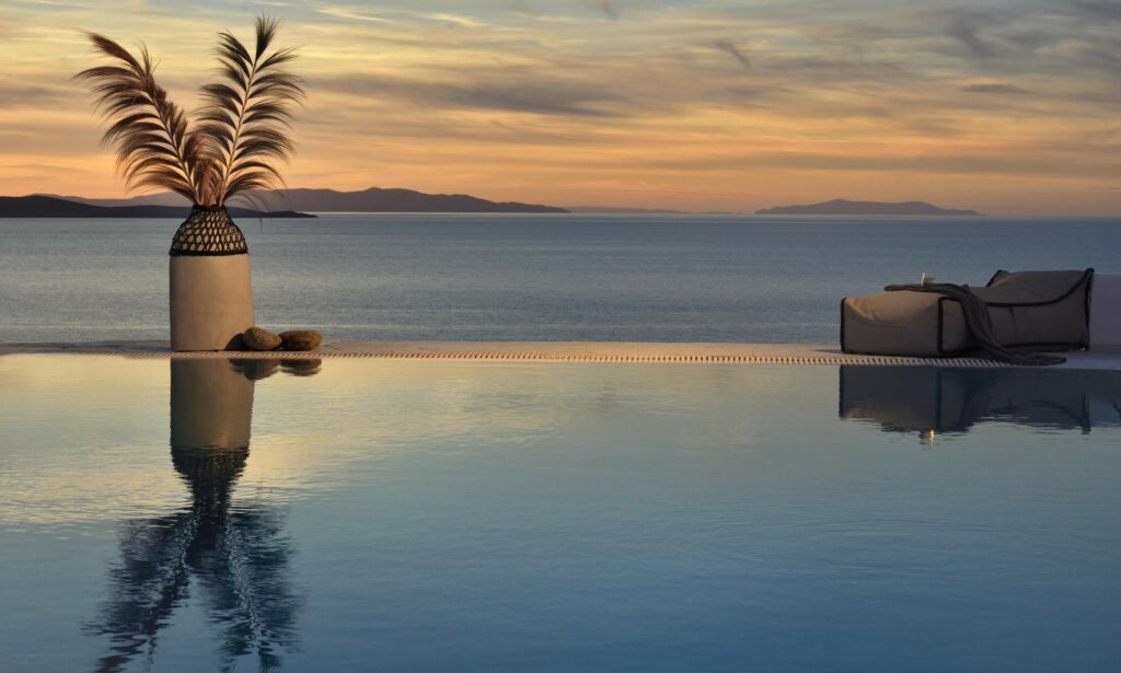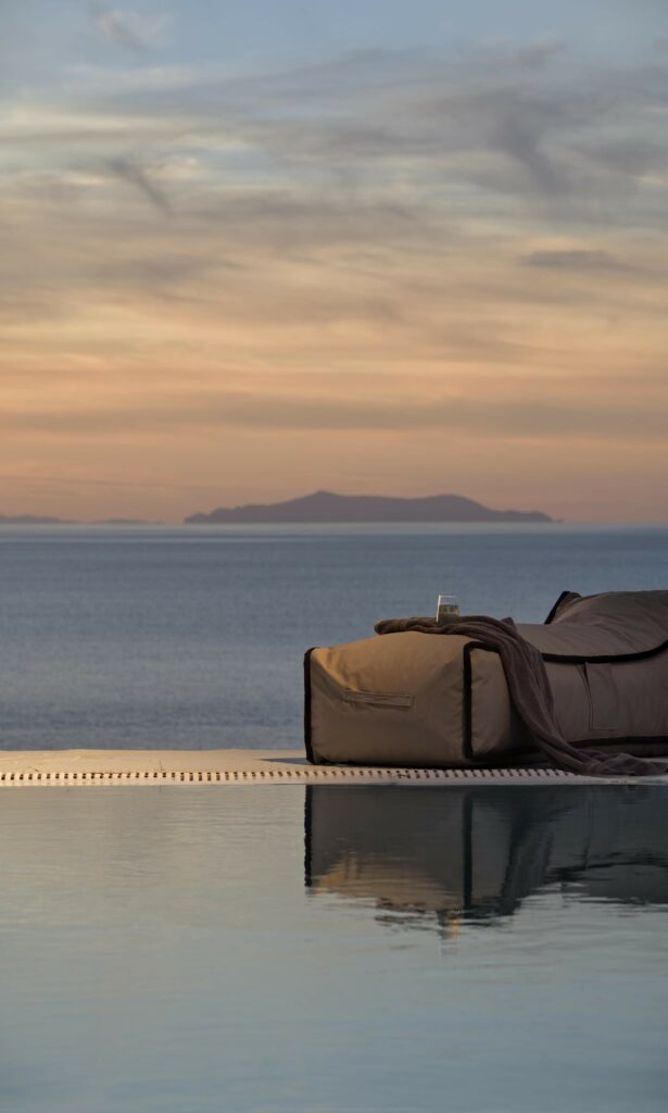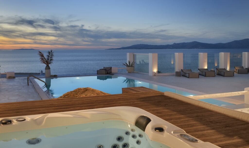 Outdoors, Villa Egeo offers a dreamy infinity pool, a tropical-style hot tub surrounded by rocks, shaded lounging and dining areas, and wide terraces for group yoga or relaxation. The views of Delos, the spiritual heart of the Cyclades, are unmatched—infusing the space with calming, uplifting energy.