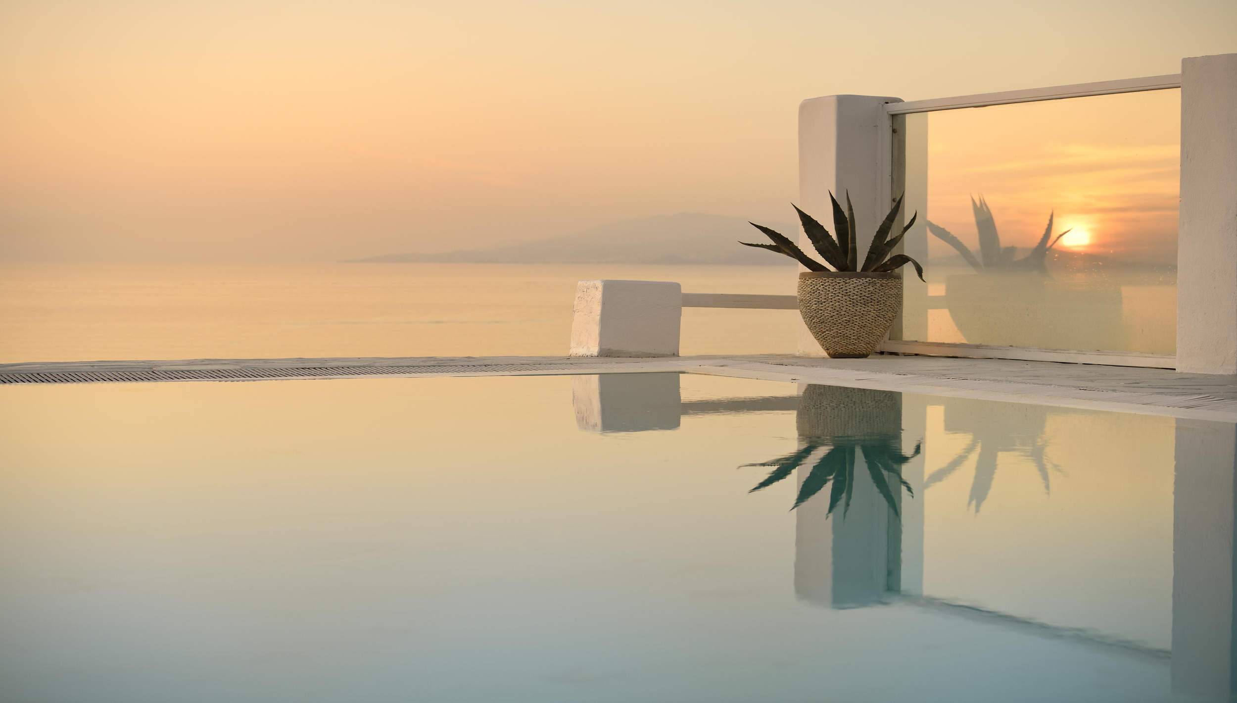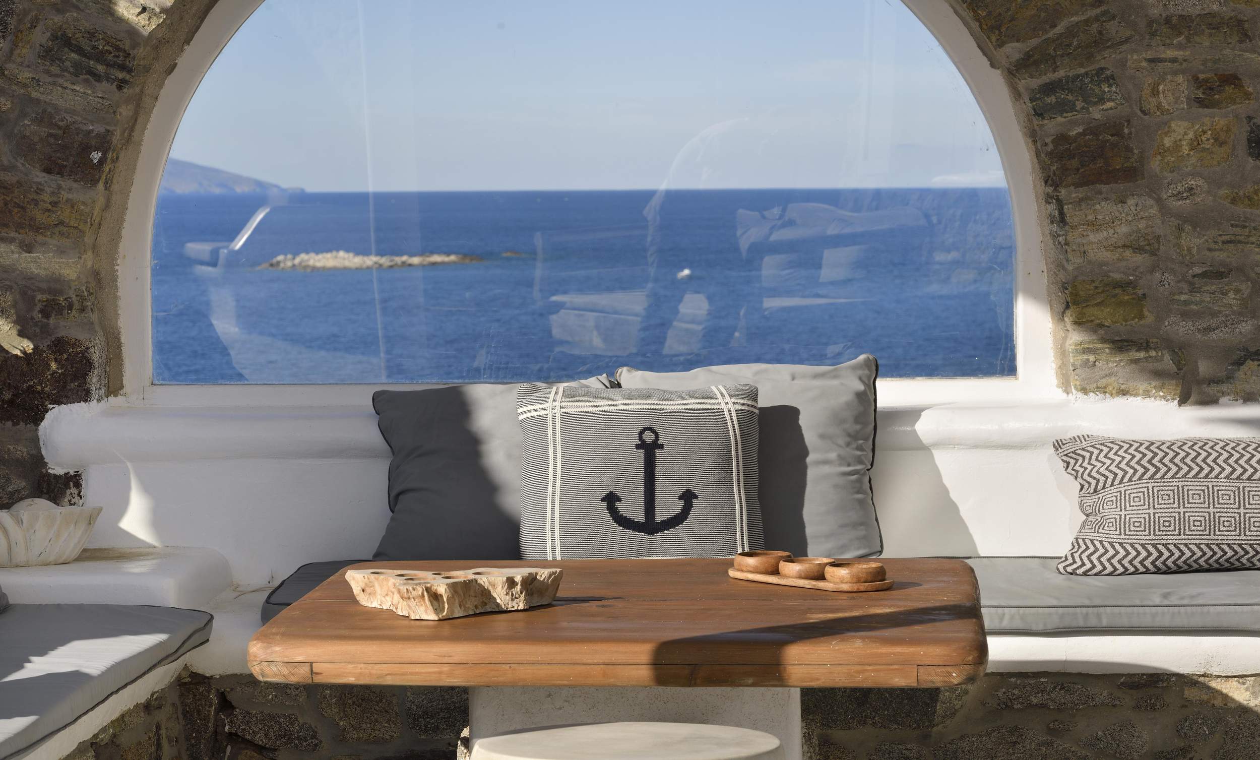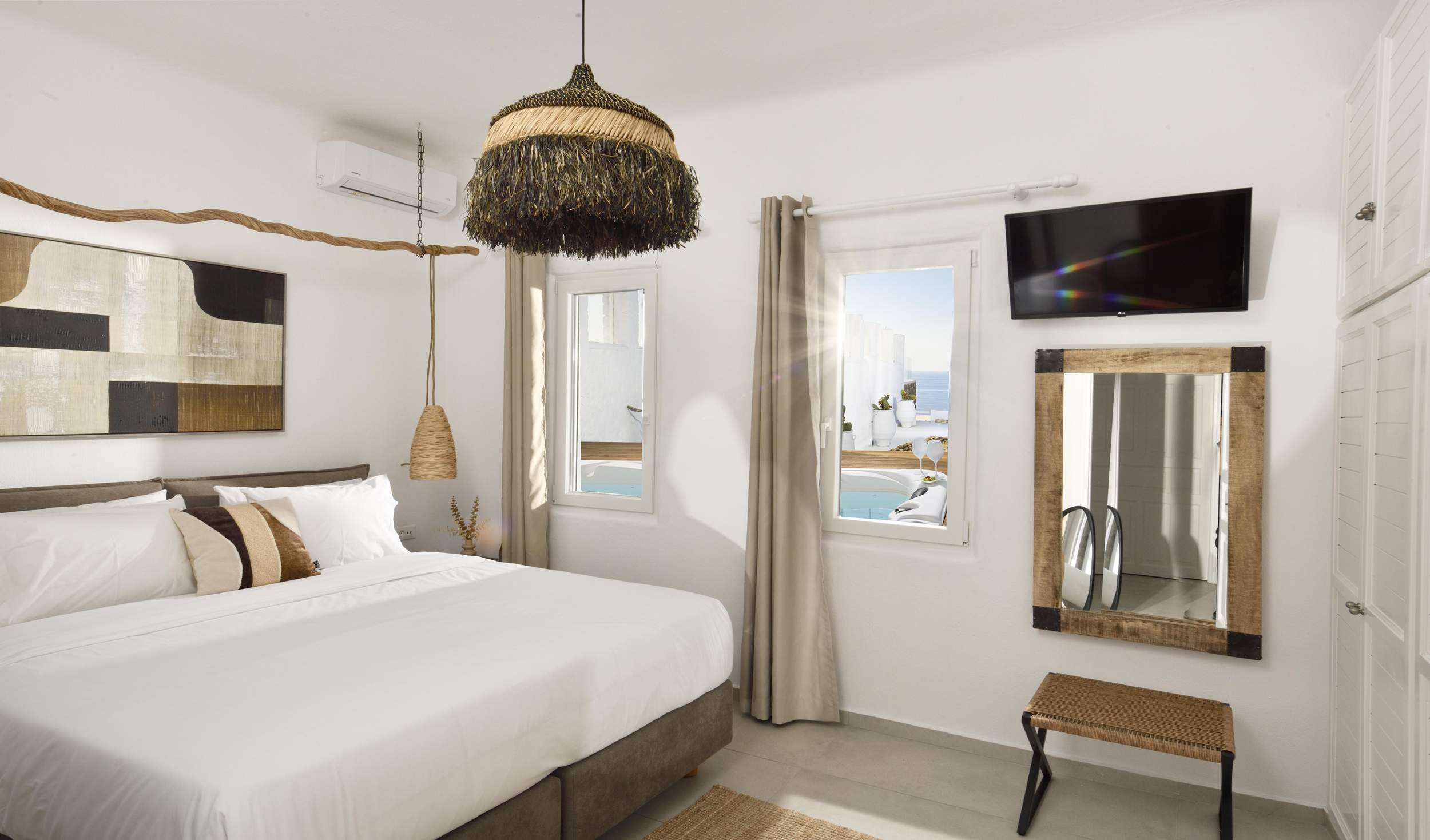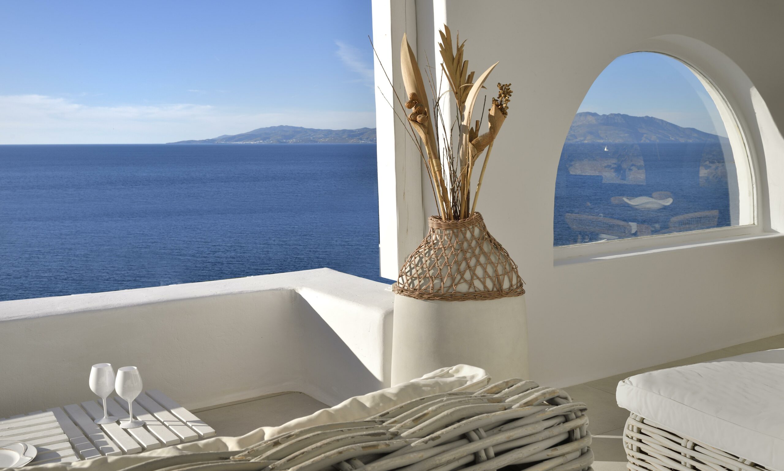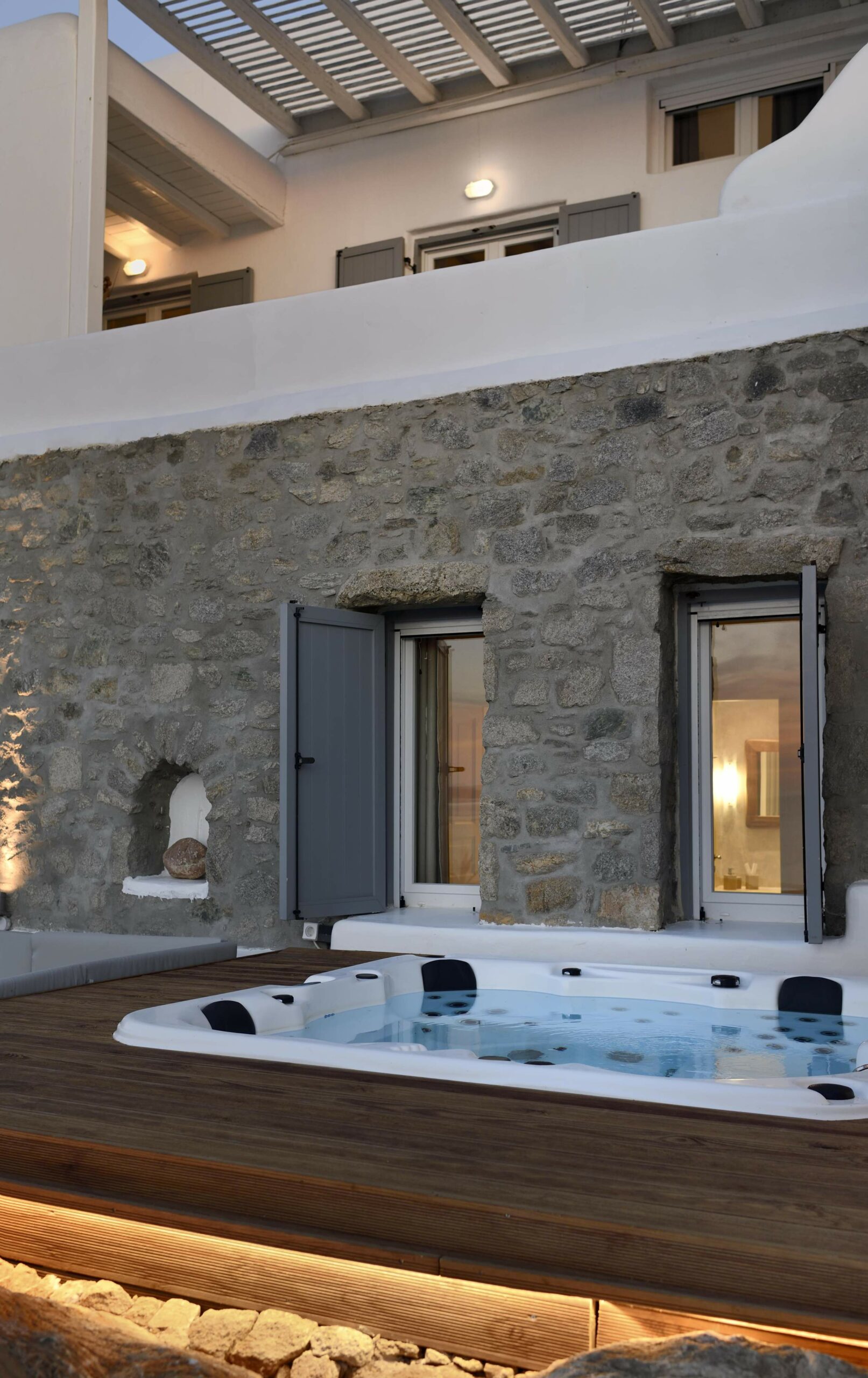 Outdoors, Villa Egeo offers a dreamy infinity pool, a tropical-style hot tub surrounded by rocks, shaded lounging and dining areas, and wide terraces for group yoga or relaxation. The views of Delos, the spiritual heart of the Cyclades, are unmatched—infusing the space with calming, uplifting energy.
