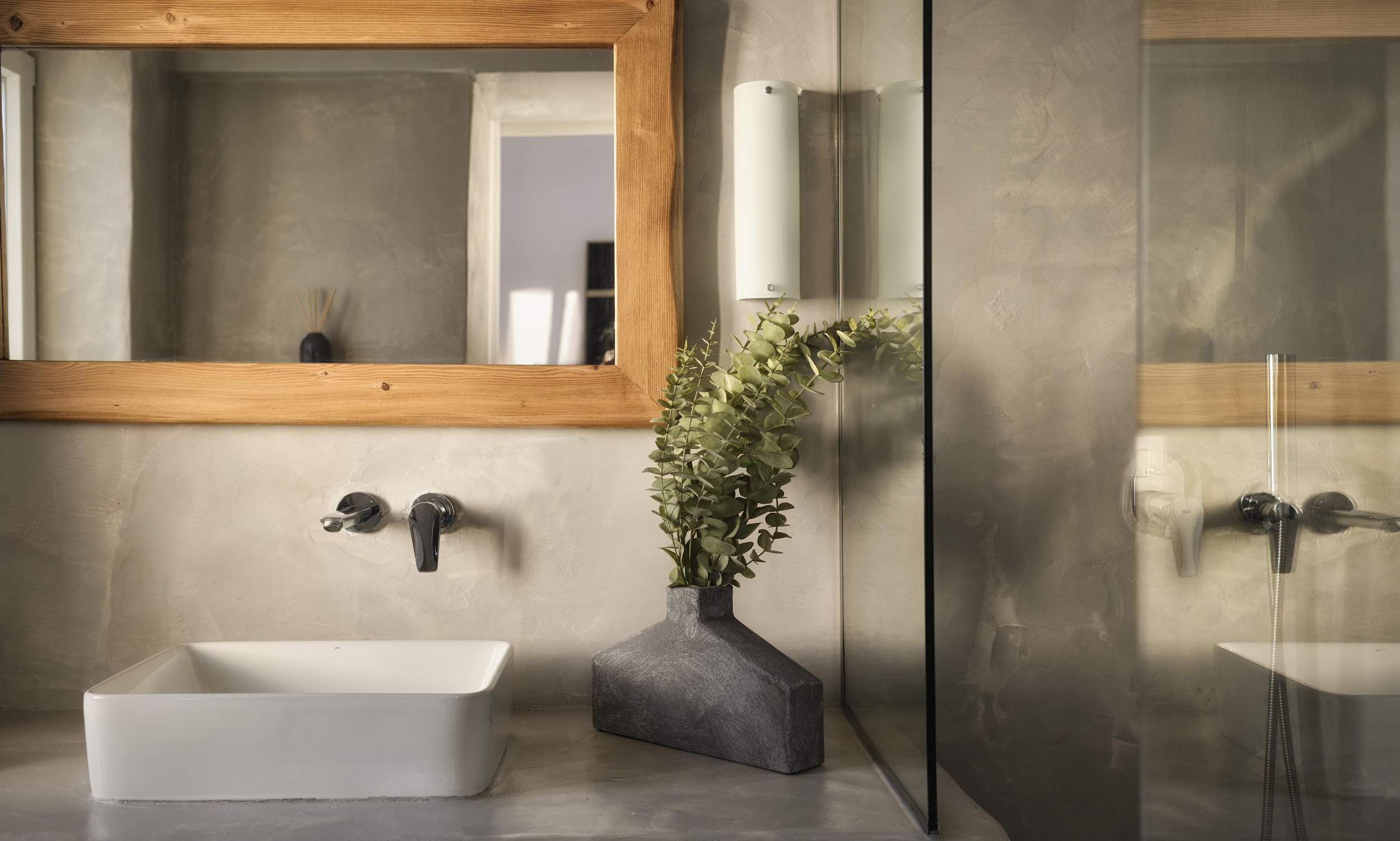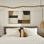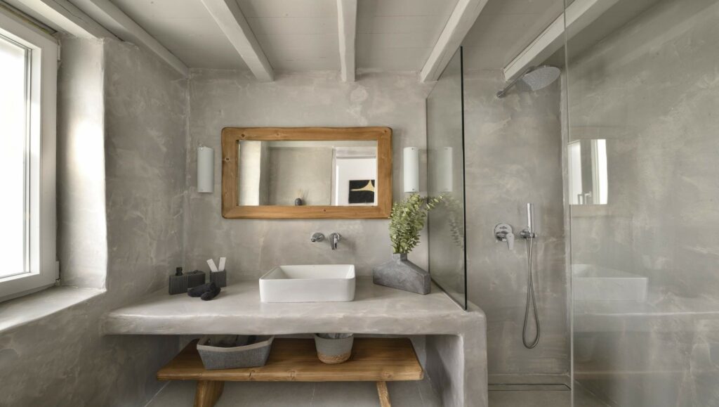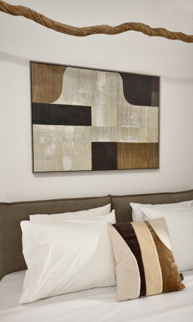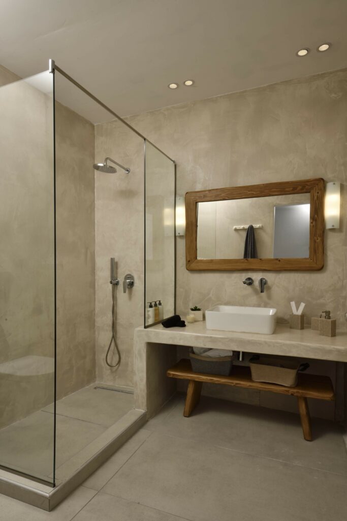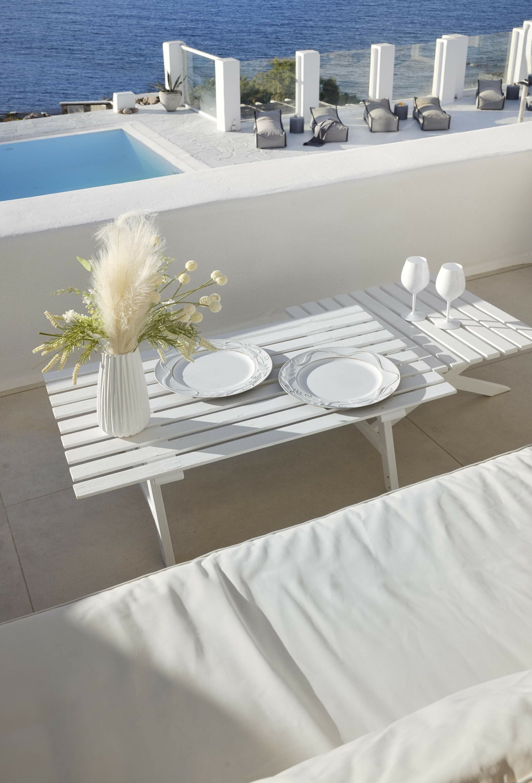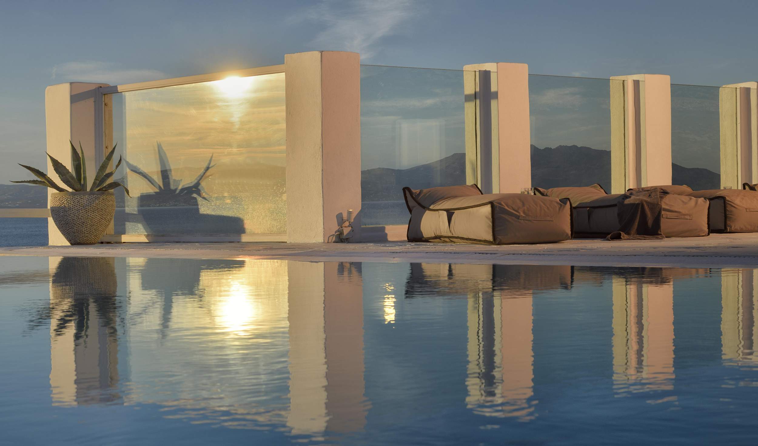 Outdoors, Villa Egeo offers a dreamy infinity pool, a tropical-style hot tub surrounded by rocks, shaded lounging and dining areas, and wide terraces for group yoga or relaxation. The views of Delos, the spiritual heart of the Cyclades, are unmatched—infusing the space with calming, uplifting energy.