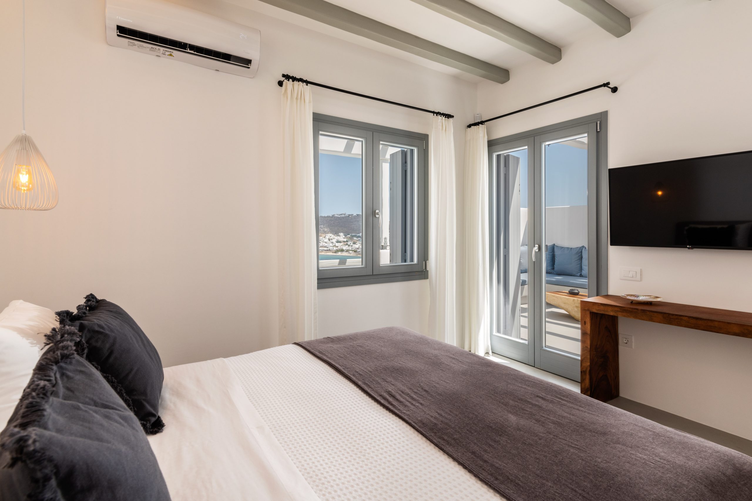 Master Bedroom: King-size bed, en-suite bathroom, double closet, direct access to an upper-level outdoor lounge area with views of Mykonos Town, Little Venice, Corfos, and Ornos bays