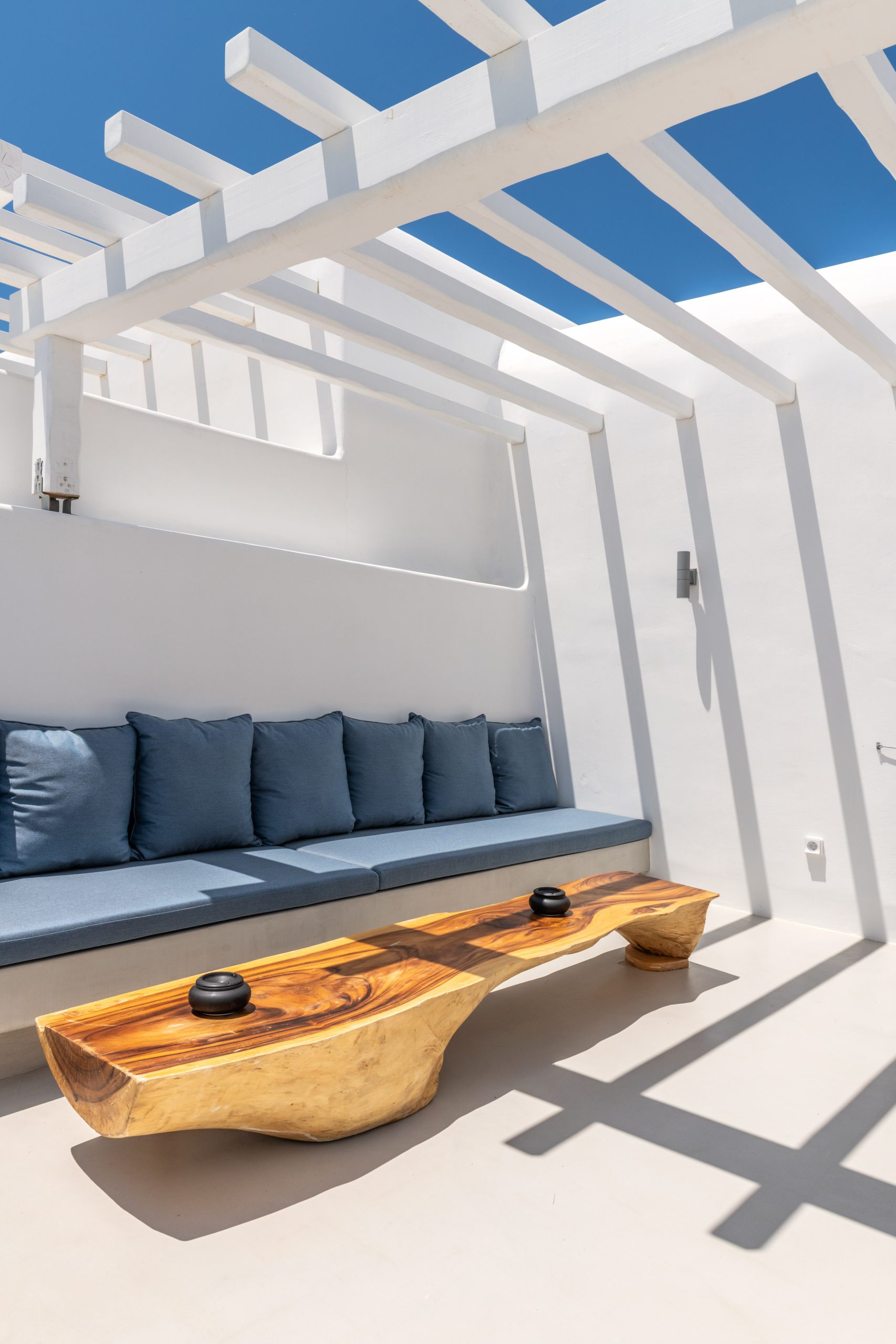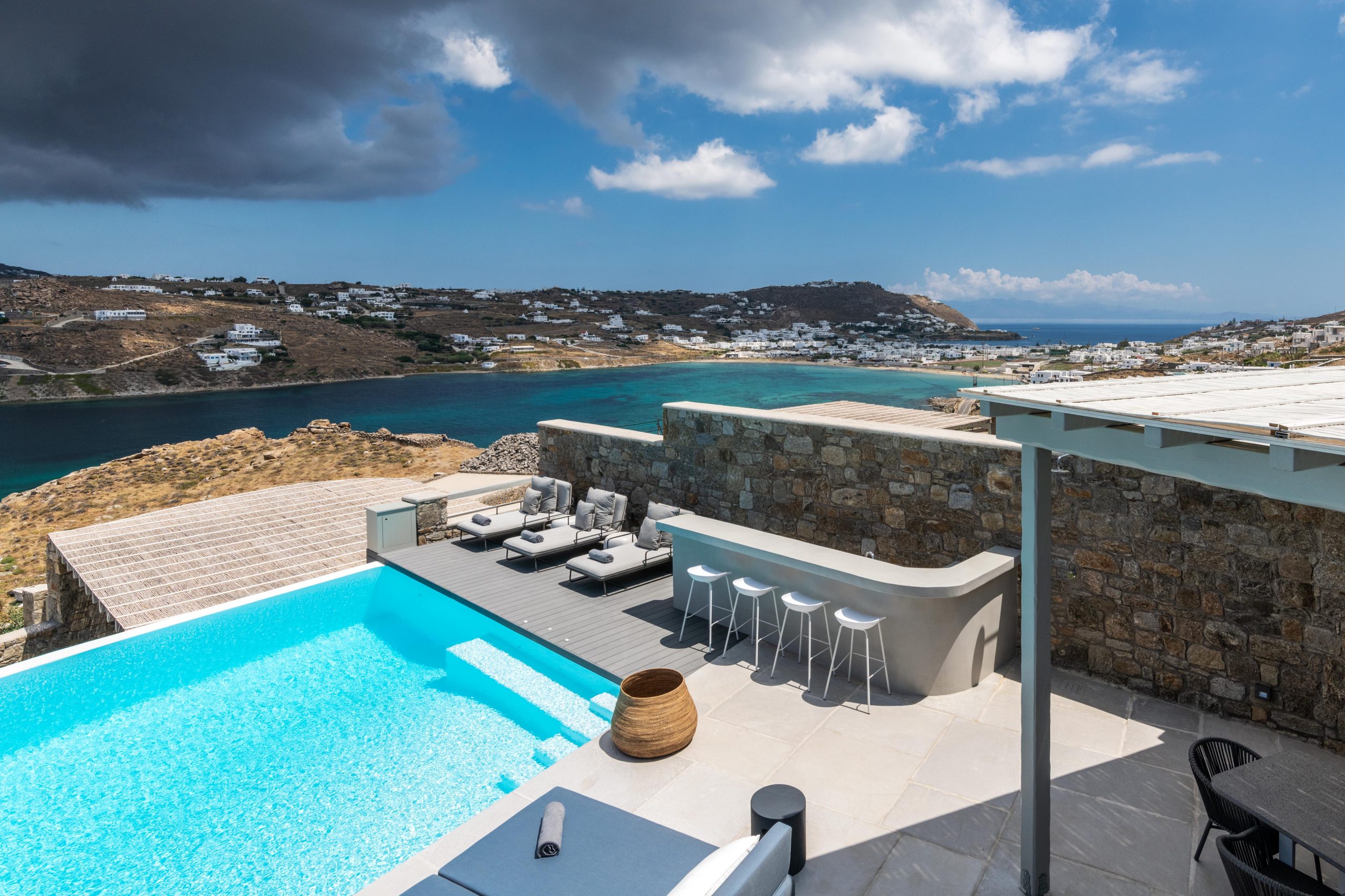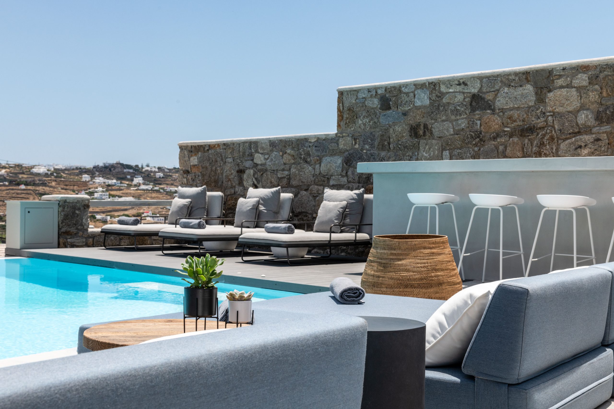 The villa features four stylish en-suite bedrooms, offering comfort and seclusion to each guest. Expansive terraces, a panoramic infinity pool, and inviting outdoor lounge areas create a dreamy setting for relaxing afternoons under the Mykonian sky.