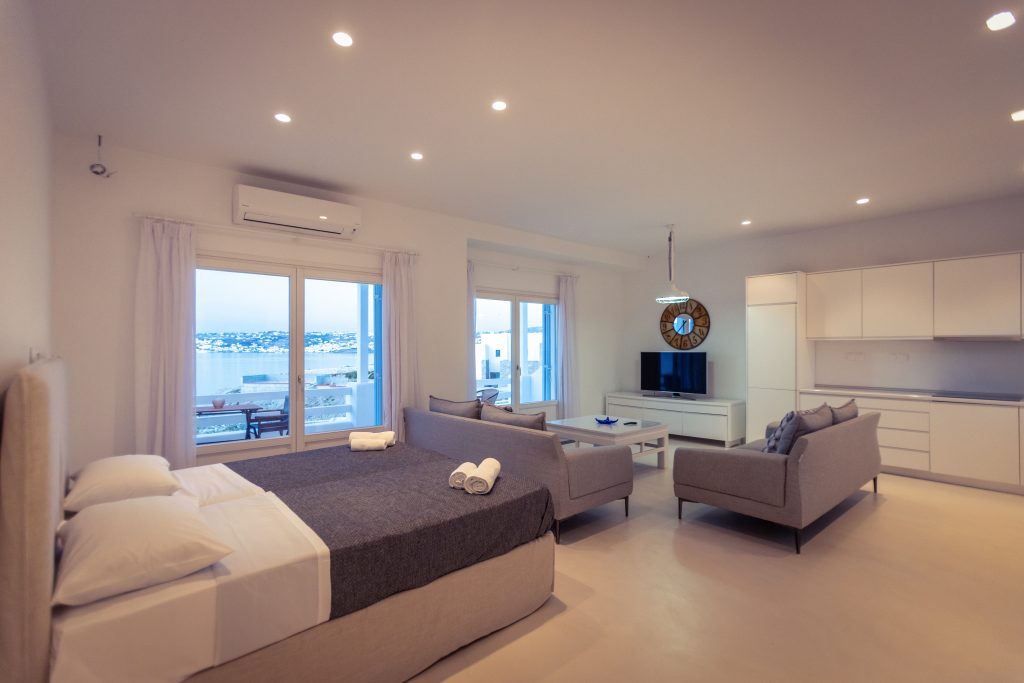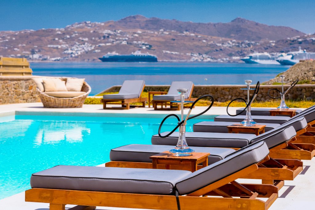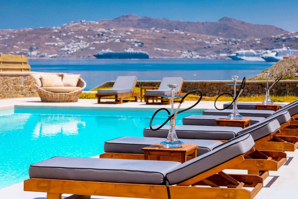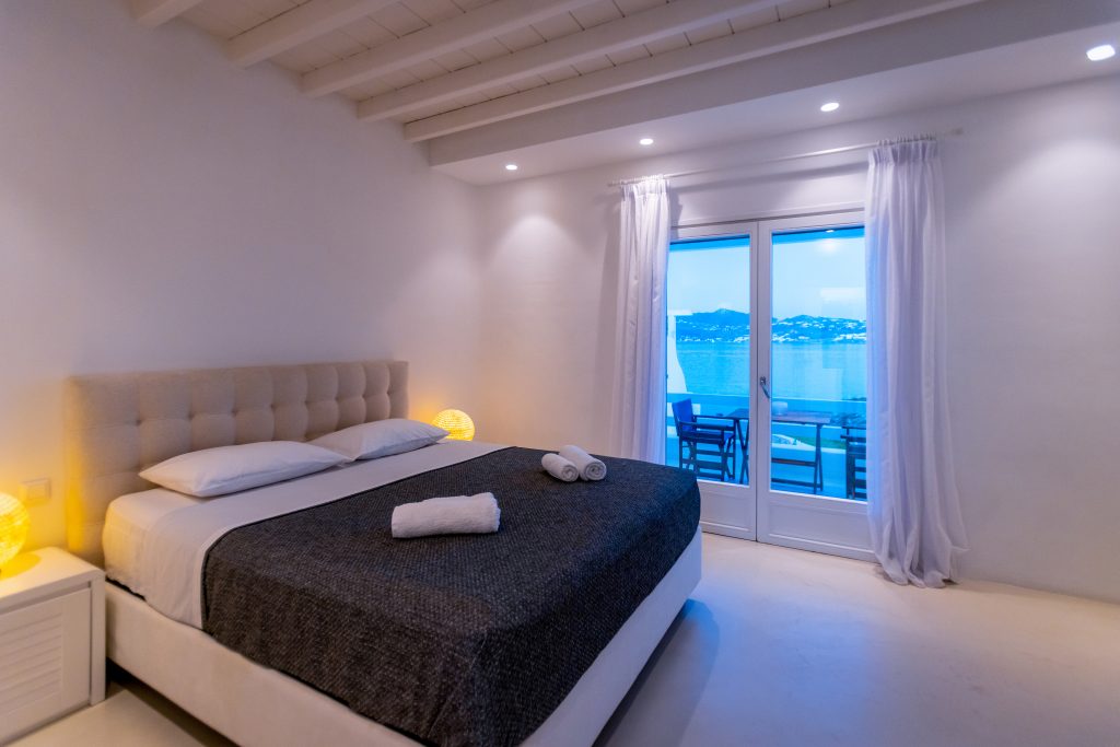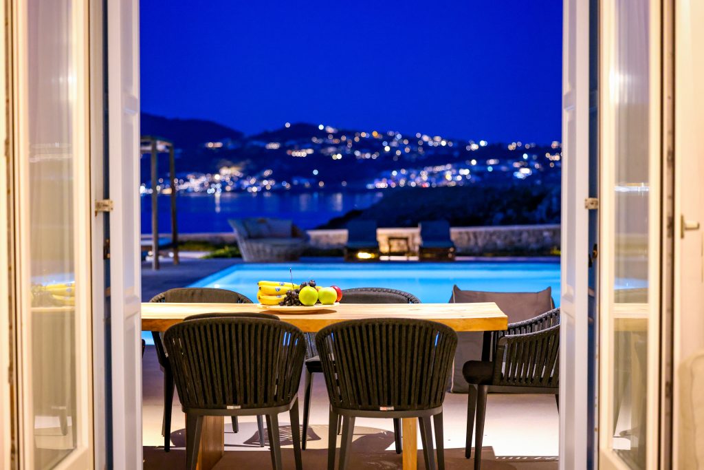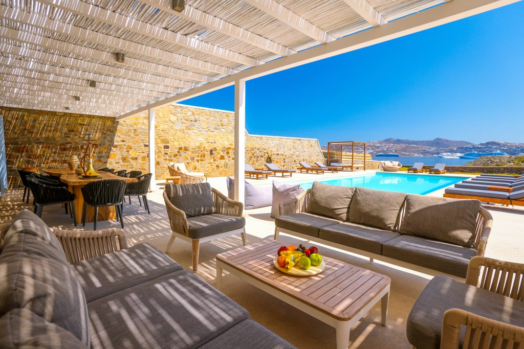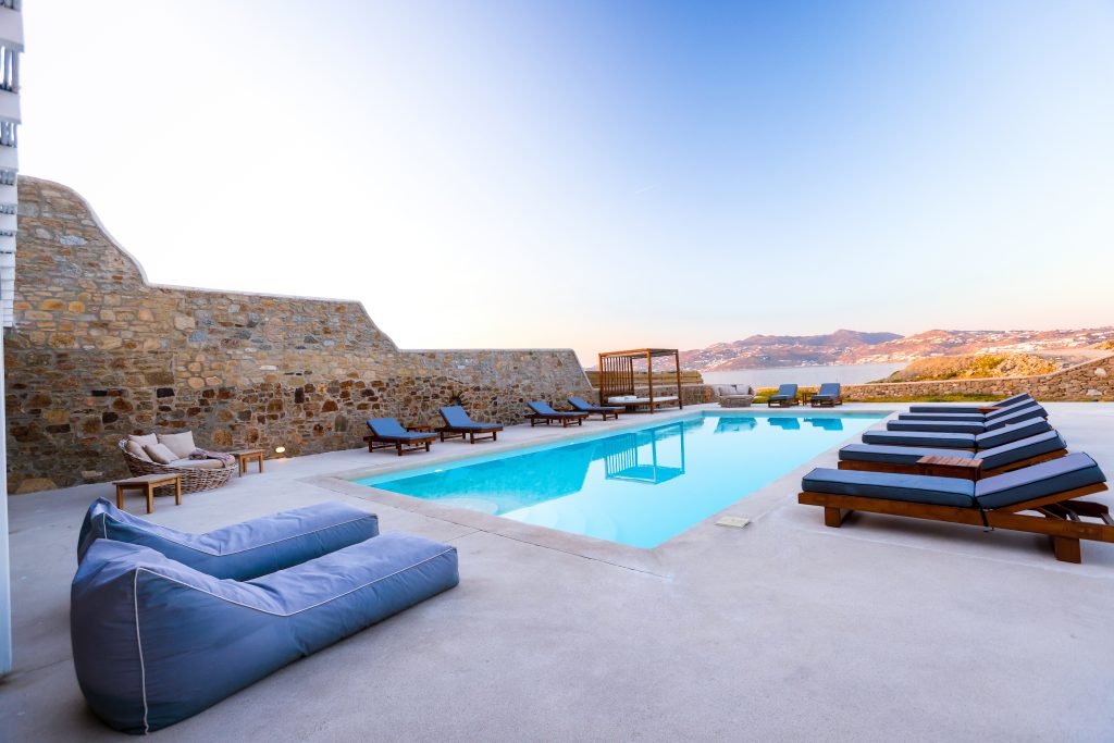 Outdoors, Villa Antheia is a private haven with direct beach access, an expansive pool deck, and luxurious lounge areas. Guests can unwind by the infinity pool, soak in the panoramic sea views, or enjoy al fresco meals in the shaded outdoor dining area. Whether you’re relaxing under the sun or hosting a sunset gathering, Villa Antheia ensures an unforgettable Mykonian experience.