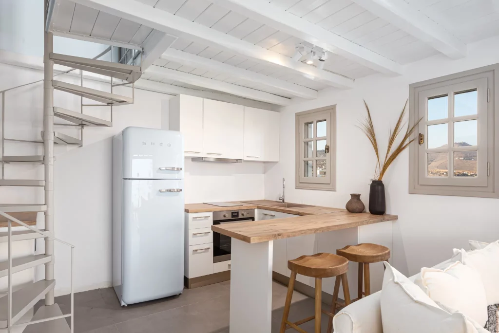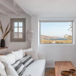 Step outside, and you’ll find a large balcony with breathtaking views of the Aegean Sea. It’s the ideal spot to savor your morning coffee or toast the vibrant Mykonos sunsets with a refreshing drink. Guests also have access to a shared pool, perfect for soaking up the sun while enjoying the stunning surroundings.