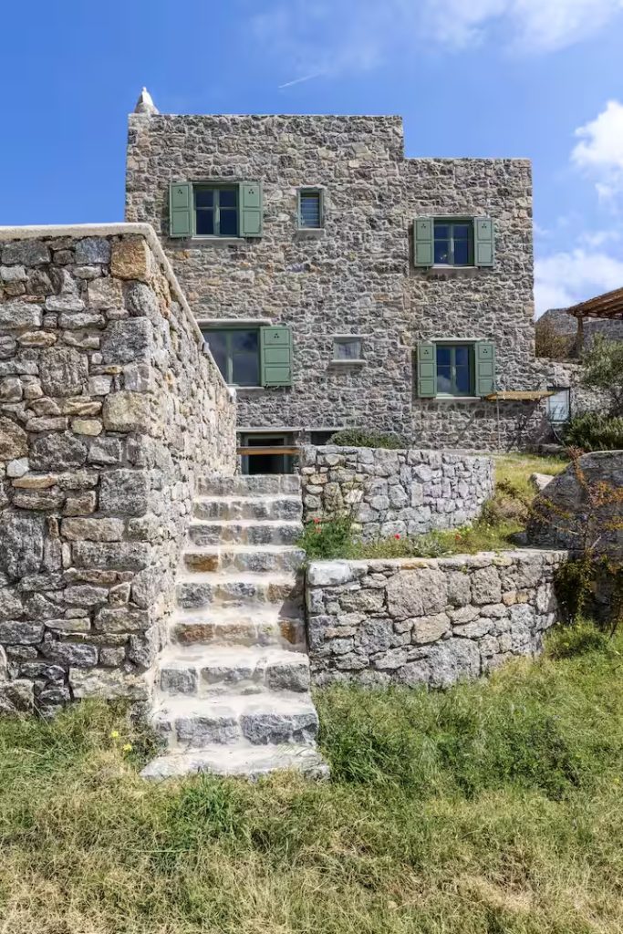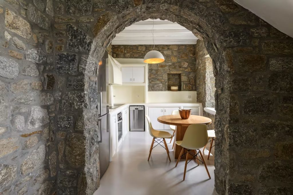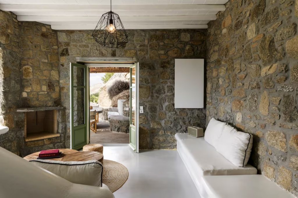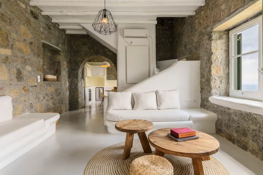 The villa features traditional whitewashed architecture accented by dry-stone walls and is split across two levels plus a separate guest house. The interiors are bright and inviting, centered around a stylish open-plan kitchen and living room with a fireplace. Outdoors, the private infinity pool and multiple lounge and dining areas provide the perfect setting for alfresco living.