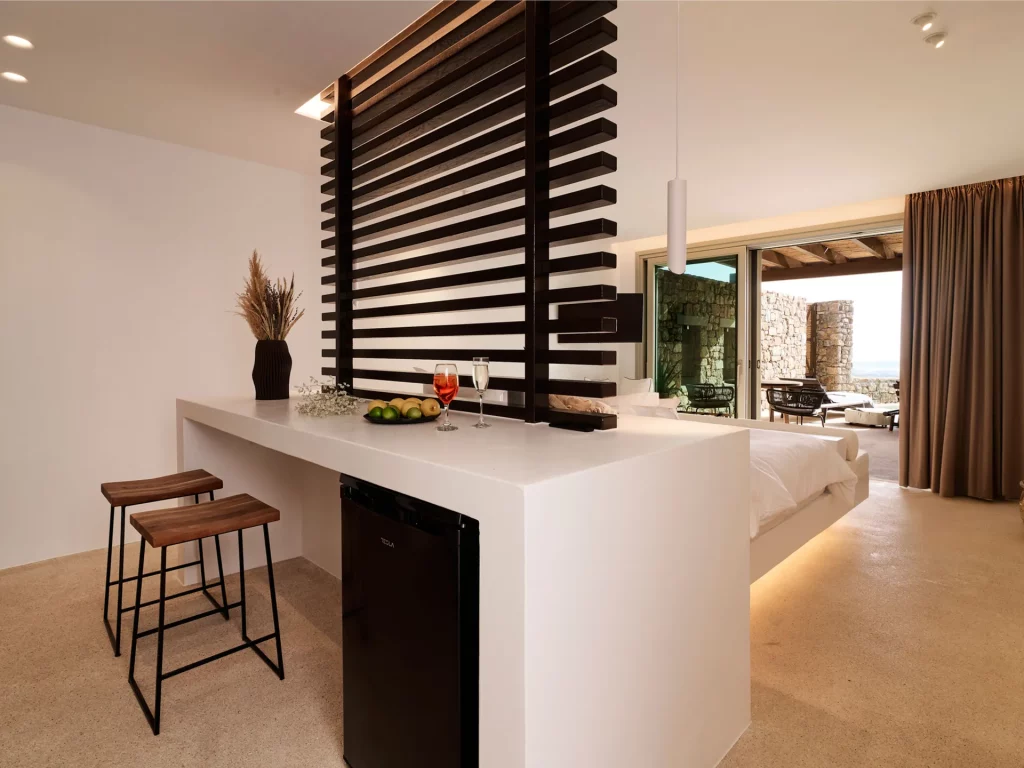 The villa’s expansive 50-square-meter outdoor terrace is a private sanctuary, featuring a stunning private pool, inviting guests to unwind while taking in the endless blue horizon. Thoughtfully designed with a focus on privacy, this newly built villa provides the perfect escape for couples or solo travelers looking for an exclusive Mykonian experience.