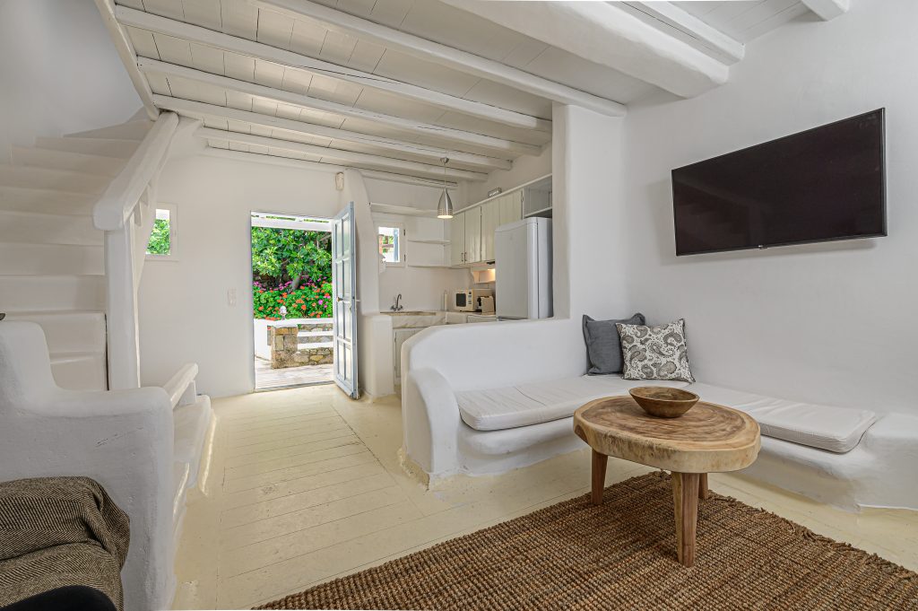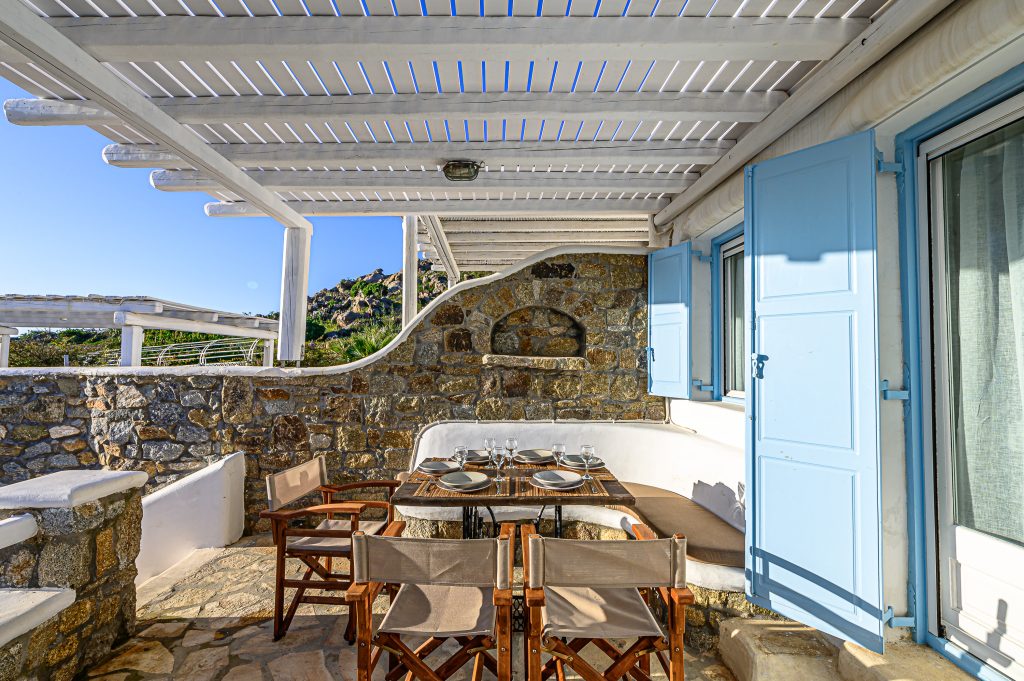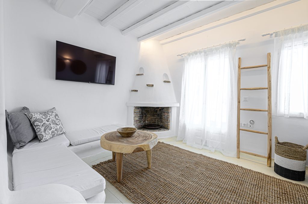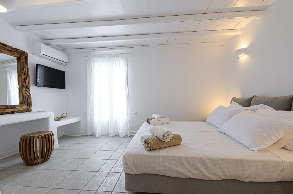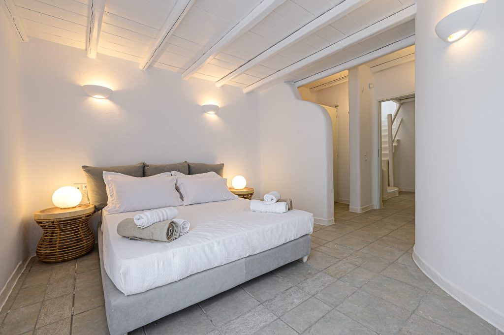 The middle floor’s French doors lead to a balcony that enhances the living experience with al fresco dining opportunities. Situated close to Mykonos Town, Villa Crest combines the serenity of a private retreat with convenient access to the island’s renowned beaches and vibrant nightlife, ensuring an unforgettable stay.