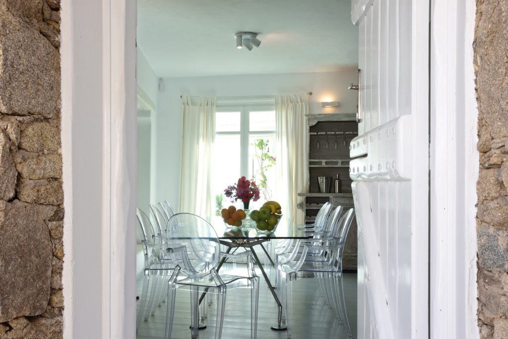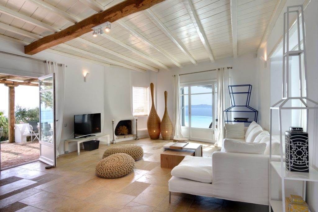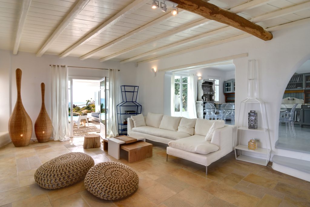 The main part of this Mykonos luxury villa is comprised of a large living room area, equally welcoming exuding a soothing ambiance and understated luxury, with white and touches of earthy tones and minimal furnishing, a large dining table, as well as a kitchen which has been fully equipped with modern appliances, All of which have direct access to the outdoor spaces of the villa and the gorgeous swimming pool.