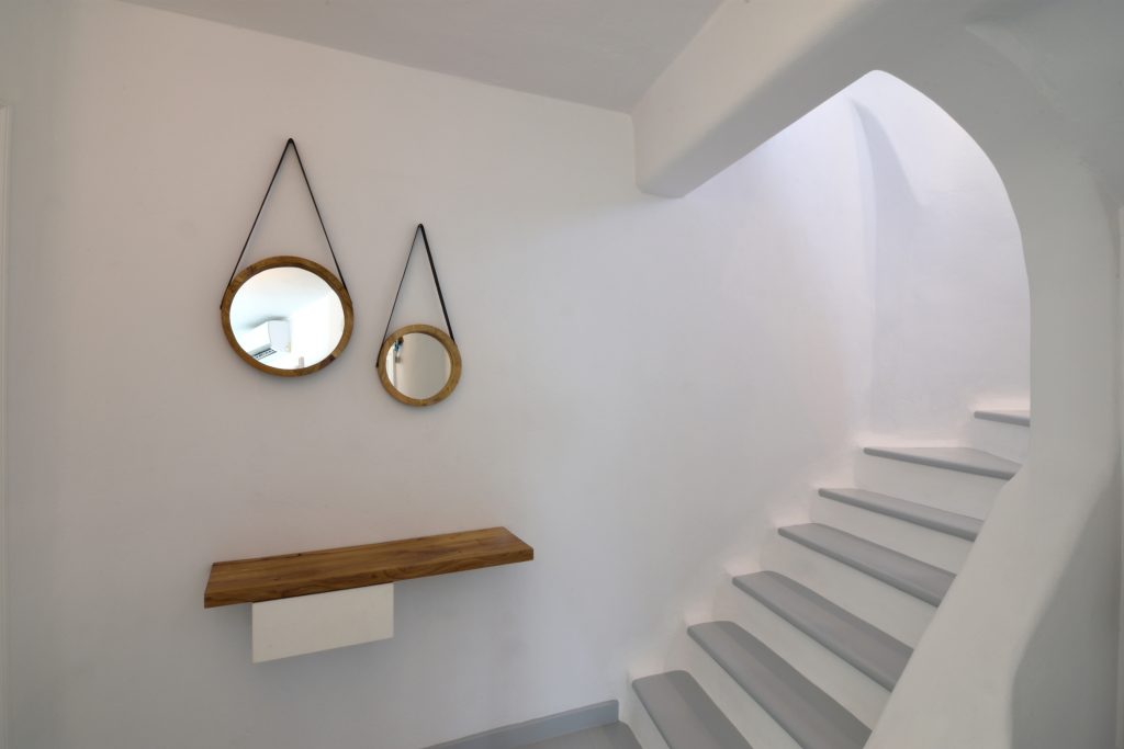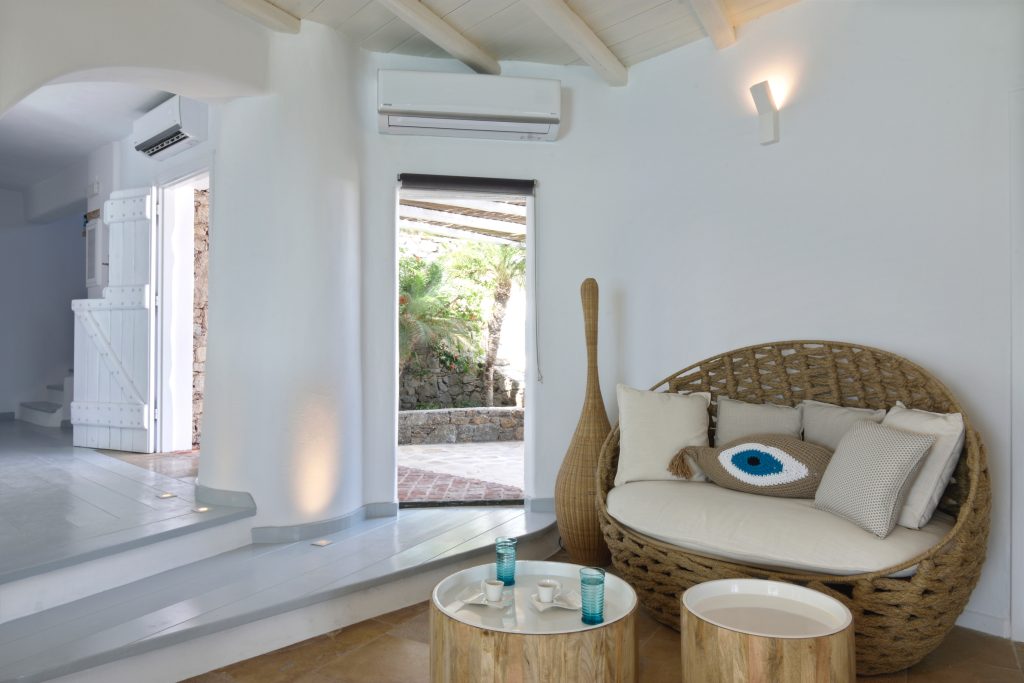 Harmoniously blending with the striking landscape, the architecture of the Villa honors traditional Cycladic structure, designed concerning natural materials and highlighted by a lush garden. Whitewashed walls, natural stone, and wood are combined with the elaborately appointed interiors of the villa evoking Mykonos’s timeless beauty.