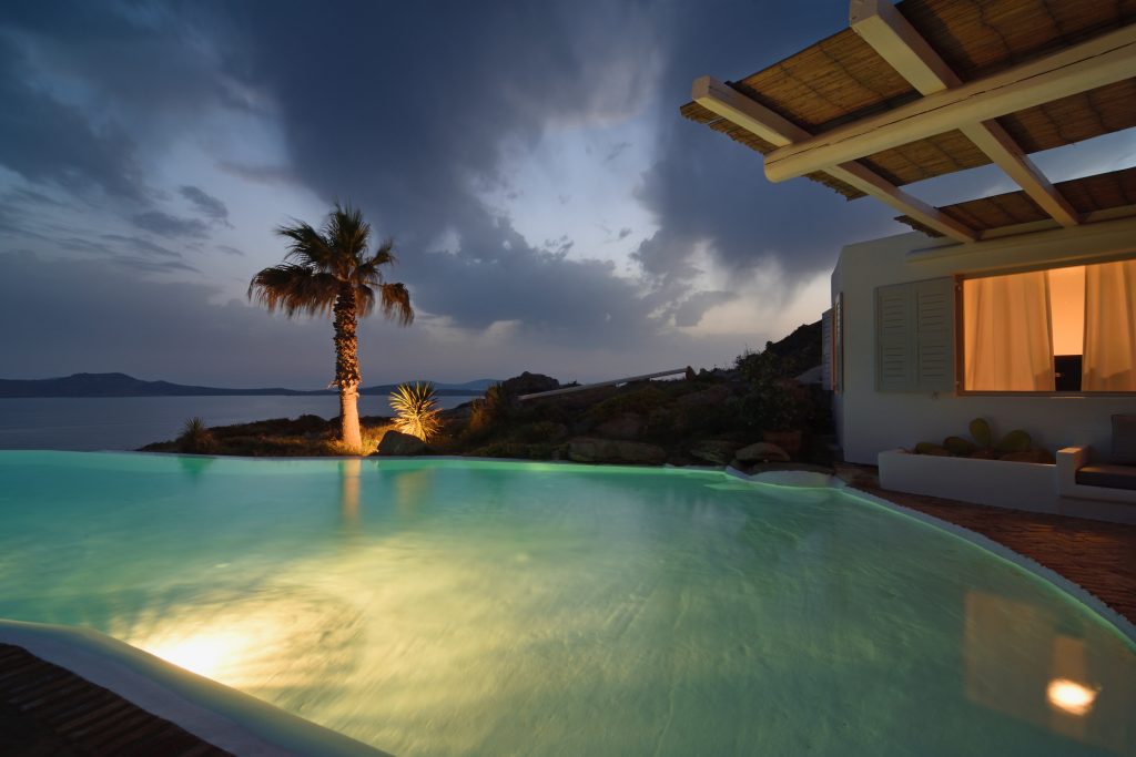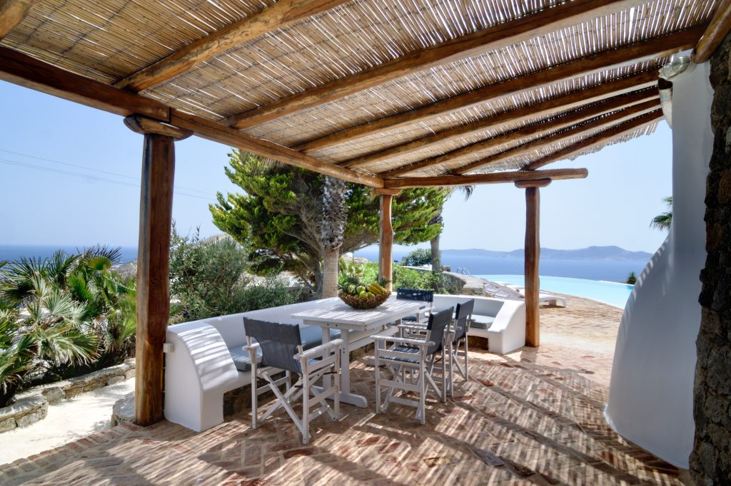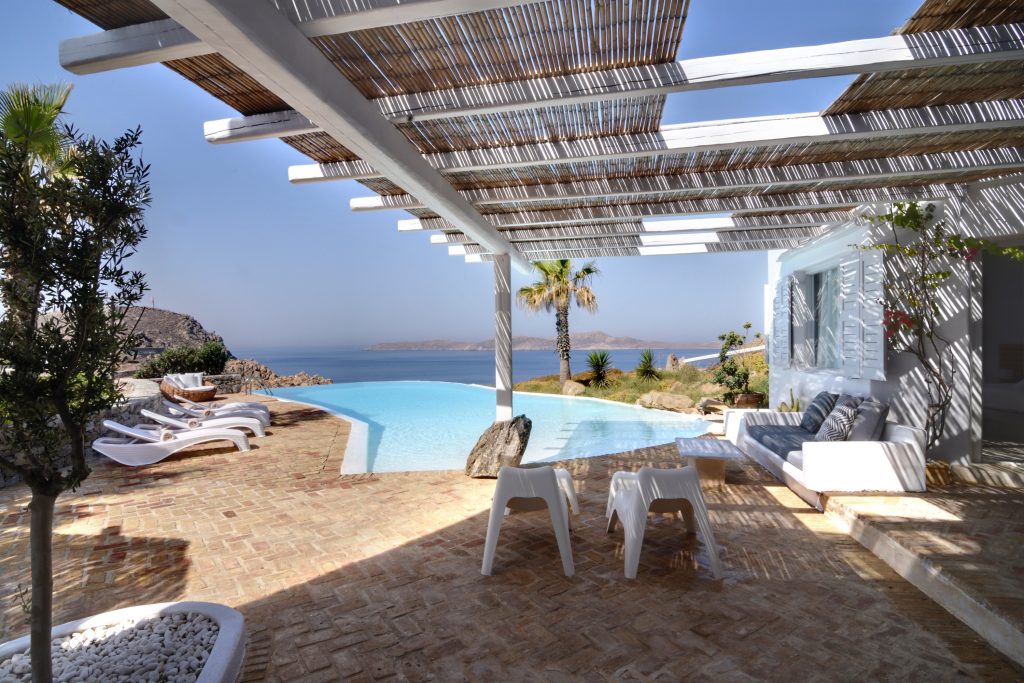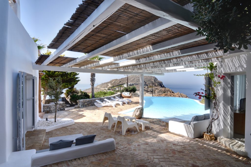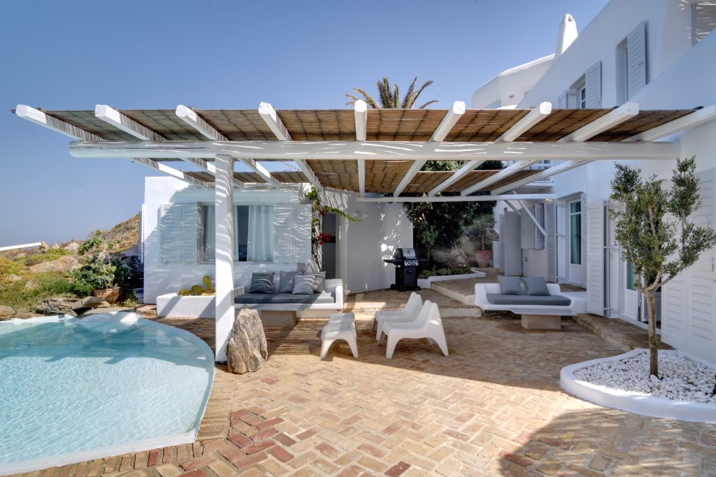The spacious 22-meter length and 70 square meters size infinity pool of the villa operates with an overflowing system that mentally connects with the endless blue of the sea, lending itself to unforgettable moments of relaxation under the sun of Mykonos. A few steps away from the pool, a row of pergolas shade the two large outdoor seating and dining areas, making it idyllic for a romantic dinner or a cocktail evening with the residents. The extraordinary grounds of this villa harmoniously combine the elements of nature with the fully-grown trees encircling the spacious infinity swimming–pool creating thus a heavenly environment.