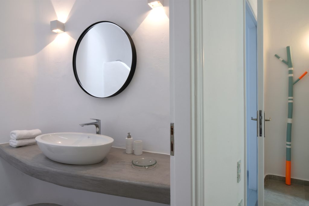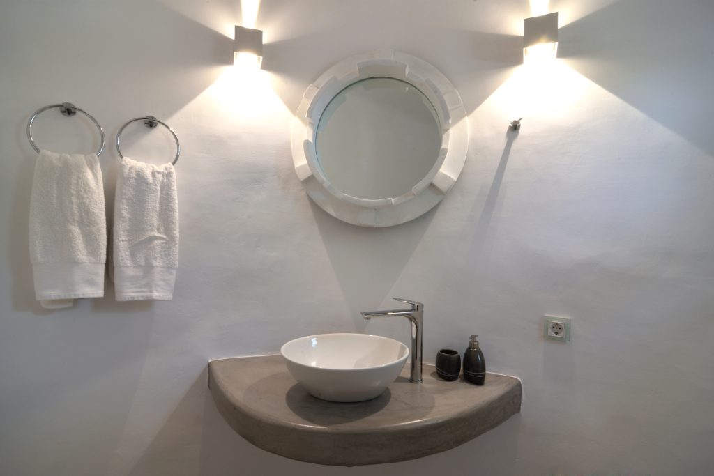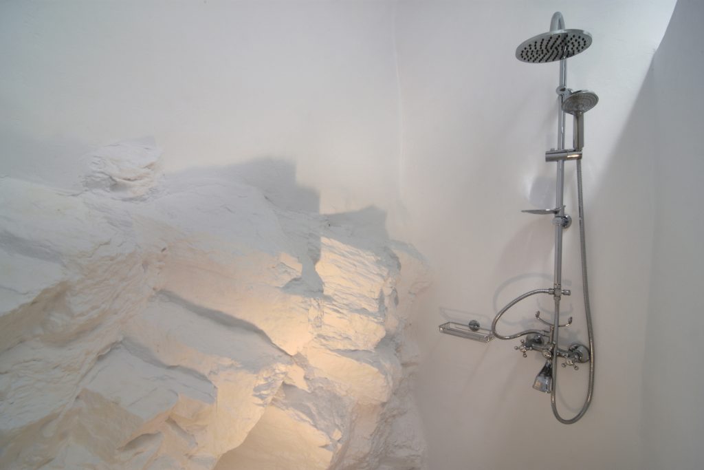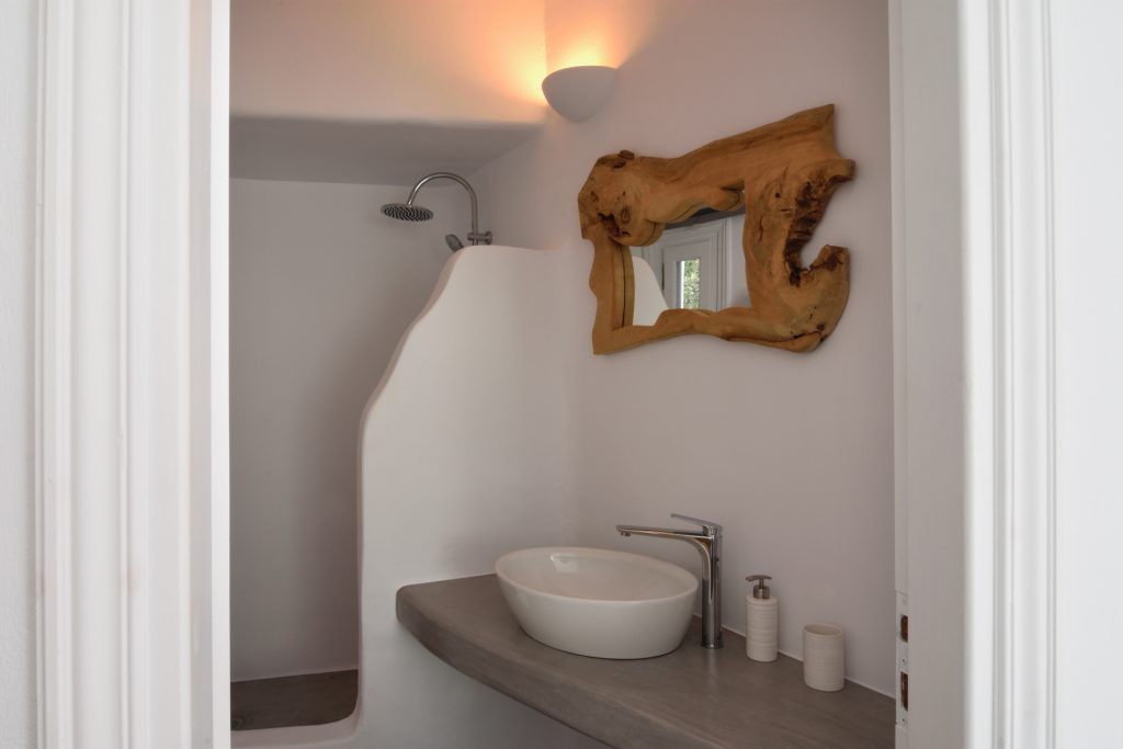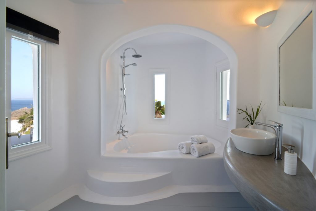 The villa consists of 4 bedrooms and 5 bathrooms in total. In the main house, there are 3 beautifully decorated master bedrooms with bathrooms enjoying the magnificent view of the pool and the Aegean archipelago, and 1 more which is a guesthouse with direct access to the swimming pool and sea views. Another attractive element is the bedroom downstairs which is built from rock-painted white. All 4 bedrooms have en-suite bathrooms, air-conditioners, smart TV, Wi-Fi internet, and silent refrigerators with glass doors (mini-bars).