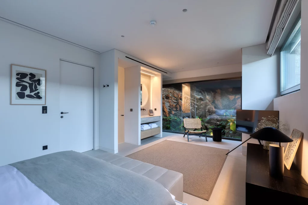 Each bedroom is a sanctuary, featuring king-size beds, premium linens, eco-friendly materials, and en-suite bathrooms with luxury toiletries and soft robes. The expansive living areas are flooded with natural light through floor-to-ceiling windows, offering guests mesmerizing views of the sea.