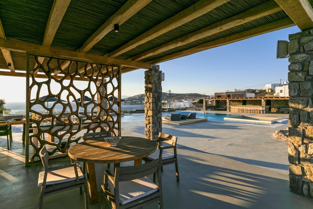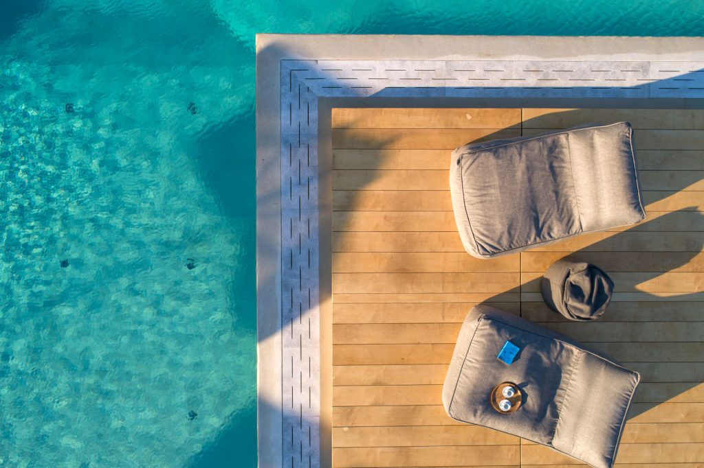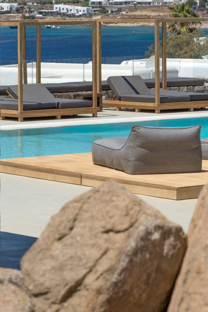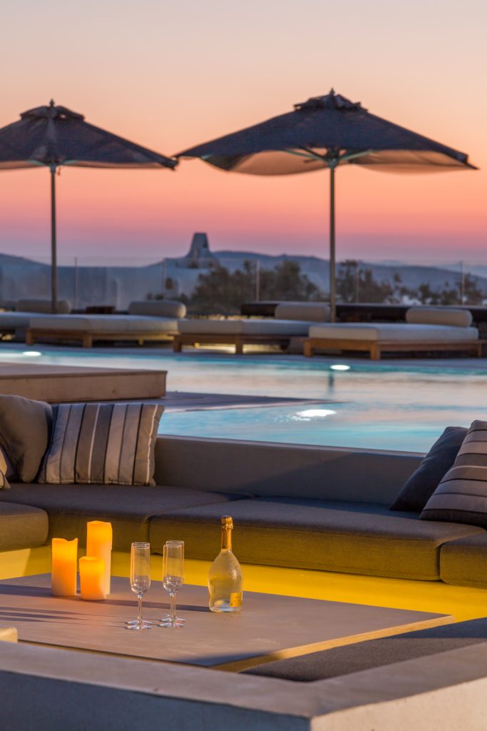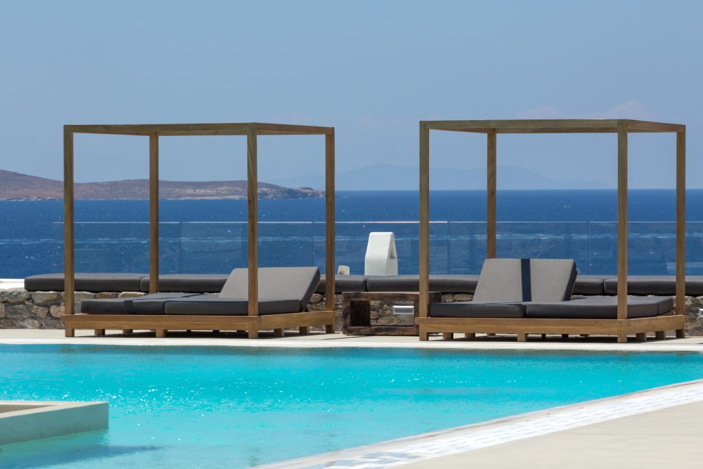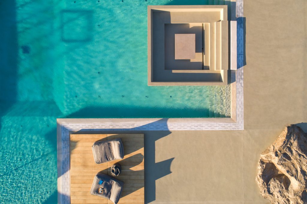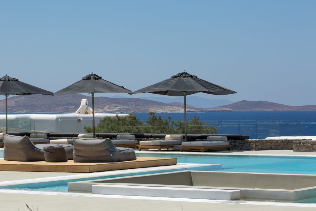 Pool bar and multiple lounge areas with panoramic Aegean views