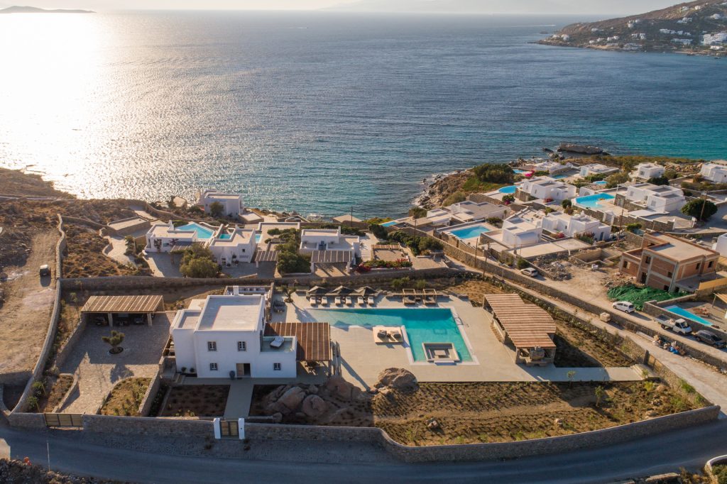 This newly unveiled villa, inspired by the Greek islands, offers a modern 350 m2 interior and an expansive outdoor space with a "Beach Entry" pool, pool bar, and lounging areas. It sits on a 4,000 m2 property with stunning Aegean Sea views and includes a private gym and massage room for guest relaxation.