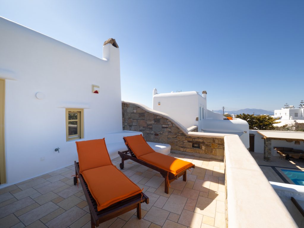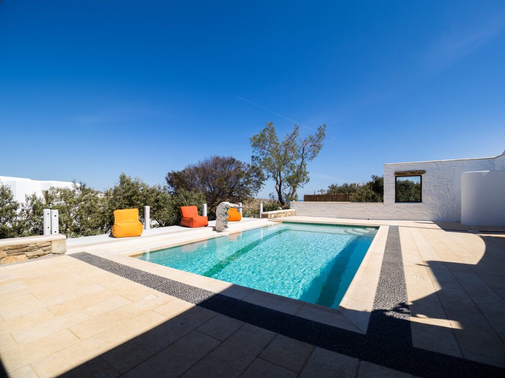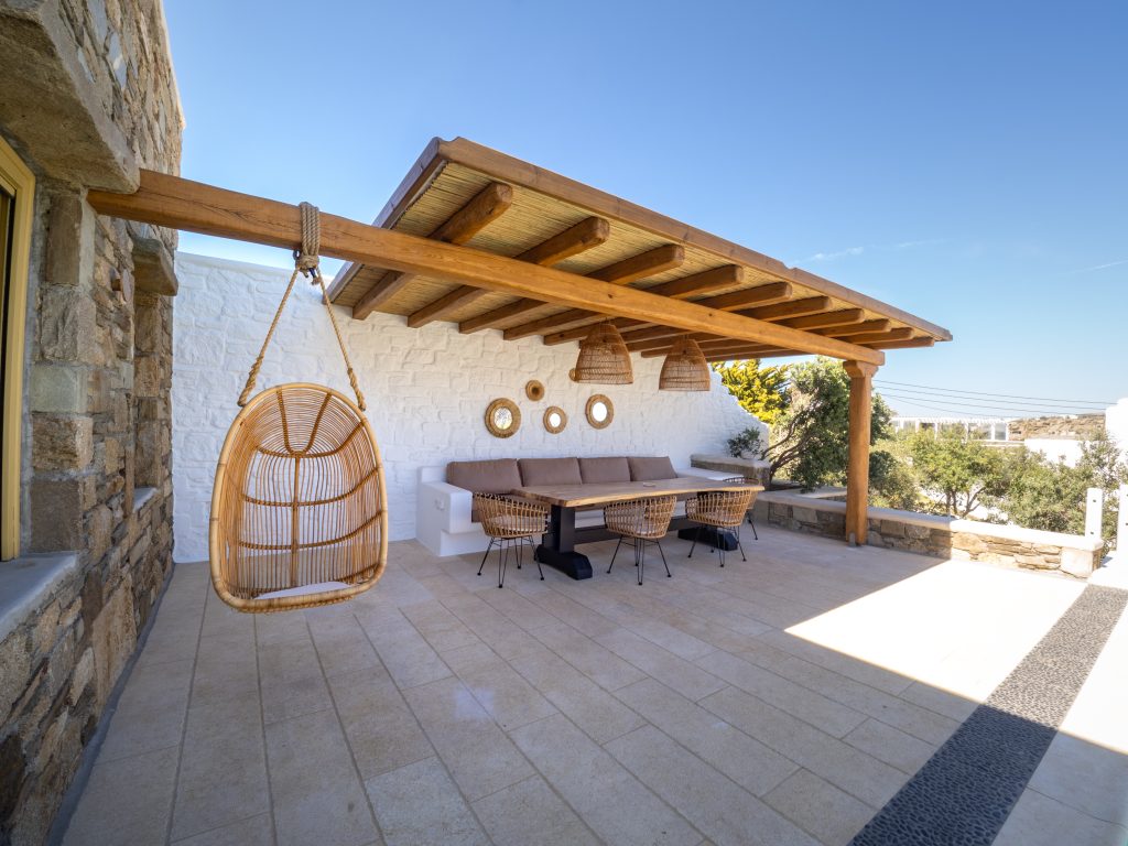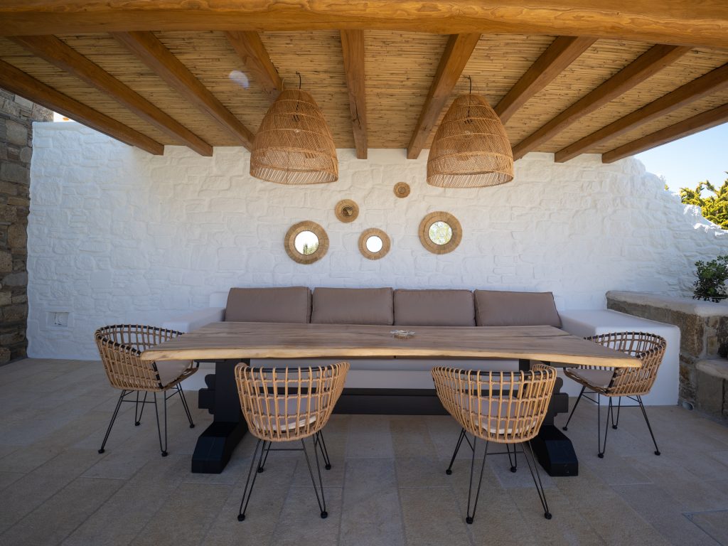 Step outside to a private oasis, where a sparkling swimming pool awaits, surrounded by a spacious terrace and an alfresco dining area—perfect for savoring the Mykonian sun and breathtaking island ambiance. The villa also offers a lush garden and private parking, providing convenience and exclusivity.