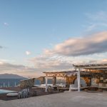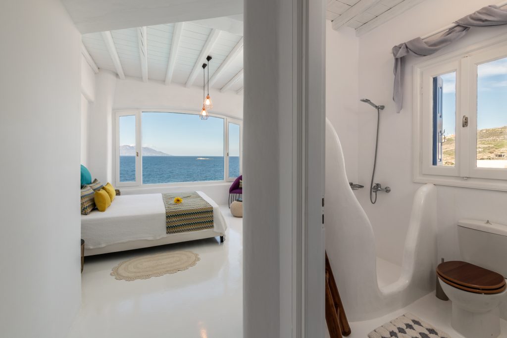Master bedroom with panoramic pool, sea, and Mykonos Town views