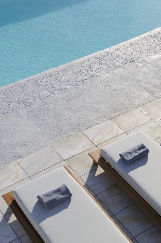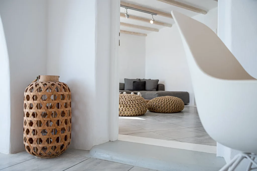 The interior of the villa reveals a sophisticated elegance, with a soothing color palette and minimal chic furnishing. The main part of this Mykonos luxury villa is comprised of an amazing living room area with designer furniture, an ensuite bathroom, and a kitchen that has been fully equipped with modern appliances and direct access to the exquisite grounds. A most pleasant feeling is created by the naturally shaped rocks surrounding the living room area along with unobstructed sea views.
