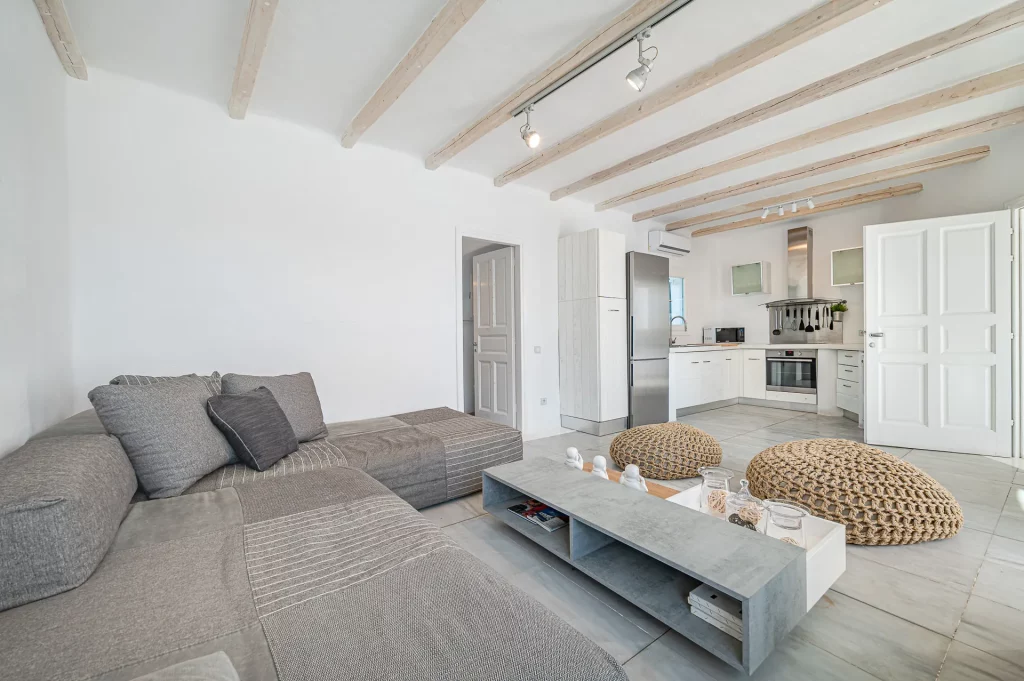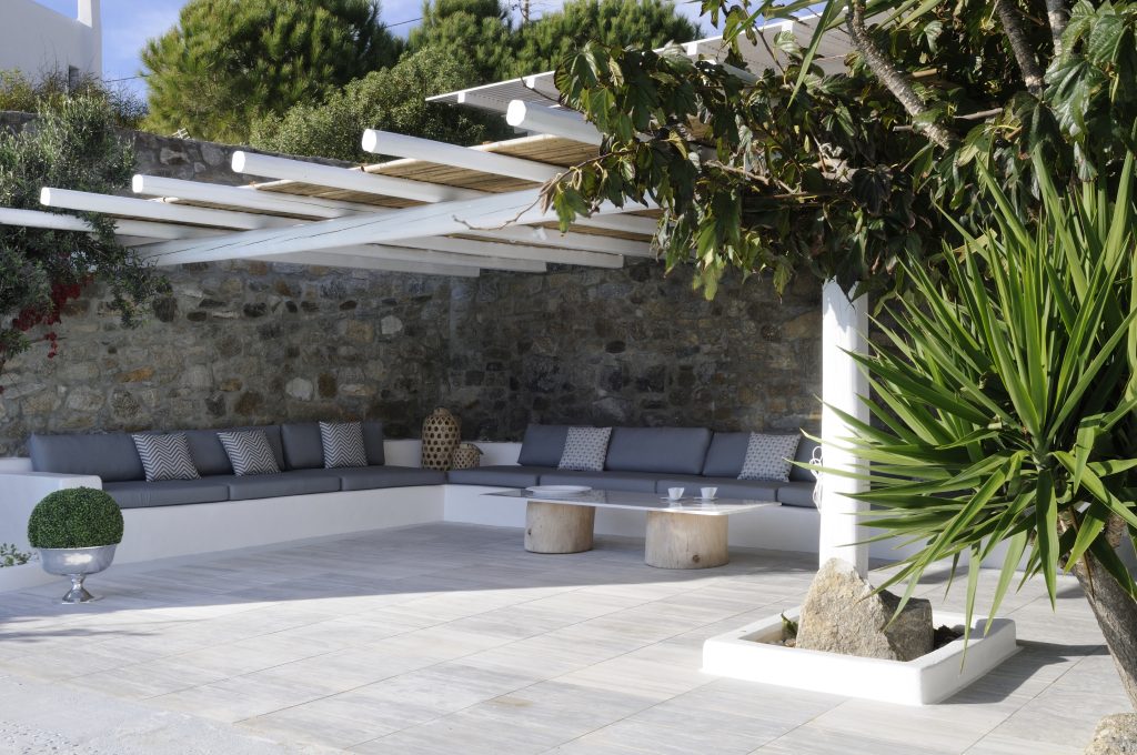 The Cycladic Mykonian architecture of this beautiful villa, in combination with the modern furniture, creates an elegant result as well as an impressive atmosphere.