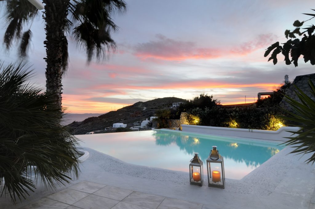 The spacious 90square meters infinity pool overlooking the Aegean sea dominates the grounds together with the sizeable dining area as well as a large seating are with beautiful pergolas that provide shade predispose the guests to enjoy ideal moments of relaxation during the day or organize a romantic dinner or a cocktail event with the residents in the evening. The extraordinary grounds of this villa harmoniously combine the elements of nature with the fully-grown trees encircling the spacious infinity swimming–pool creating thus a heavenly environment. There is also an additional 6 square meters of shallow pool designed for kids.