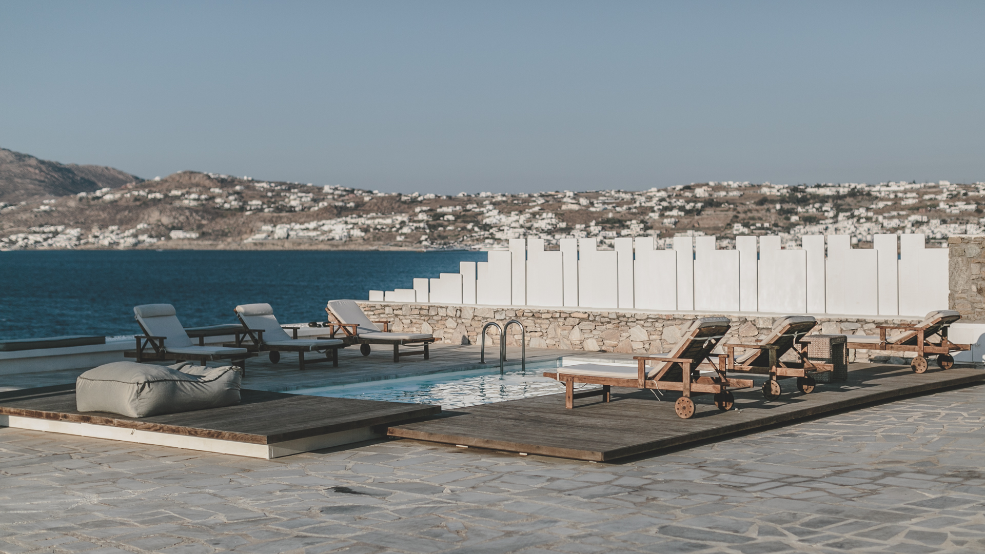 Private swimming pool with panoramic views of Ornos Bay and Baos Island