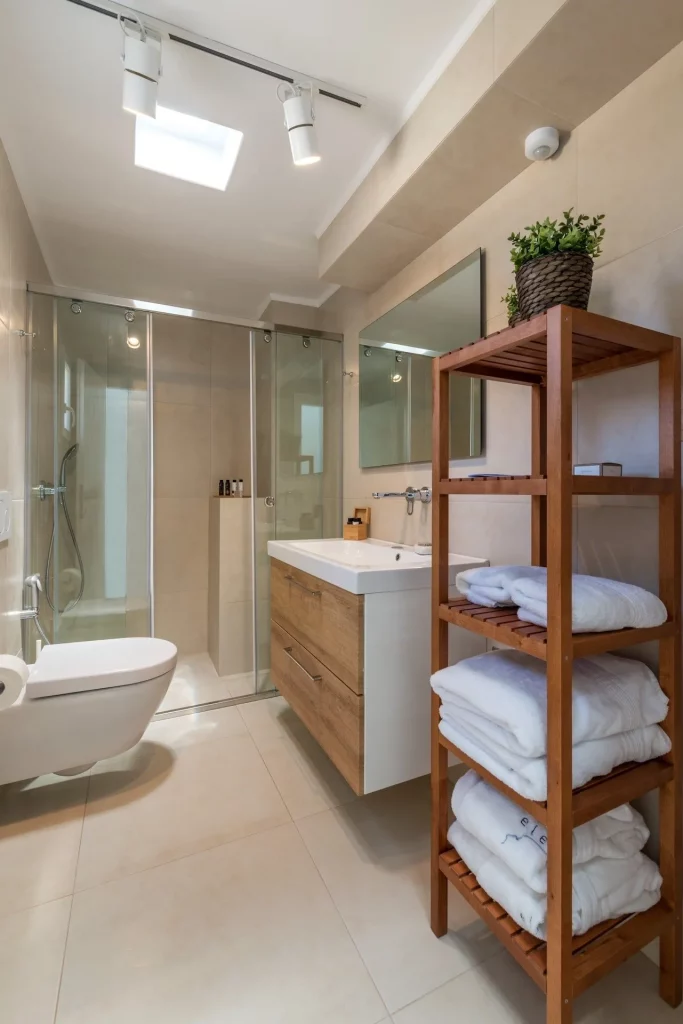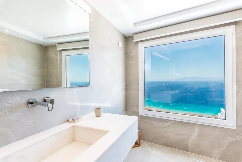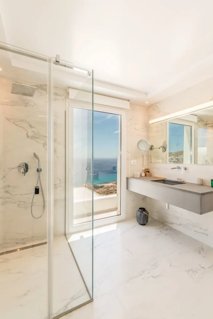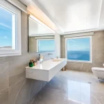 The main house boasts a spacious living area with minimalistic decor, comfortable sofas, a fireplace, and large windows that frame the stunning sea view. A fully equipped kitchen, an additional kitchenette, and a large dining area provide ample space for culinary creations and gatherings. The ground floor also features a state-of-the-art hammam and a guest WC, creating a serene haven for relaxation.