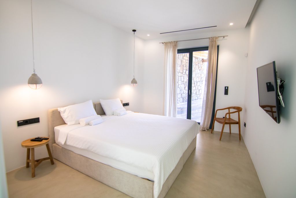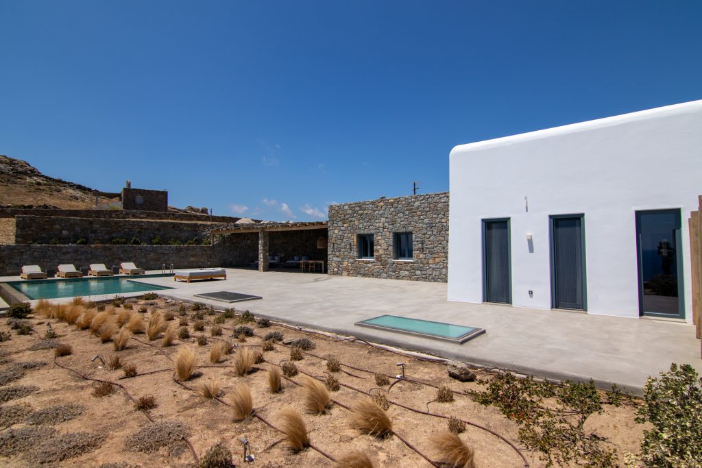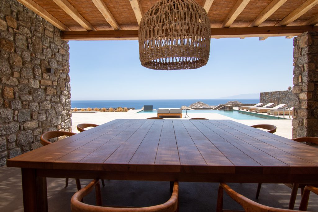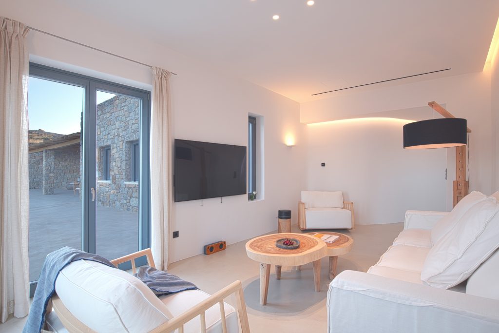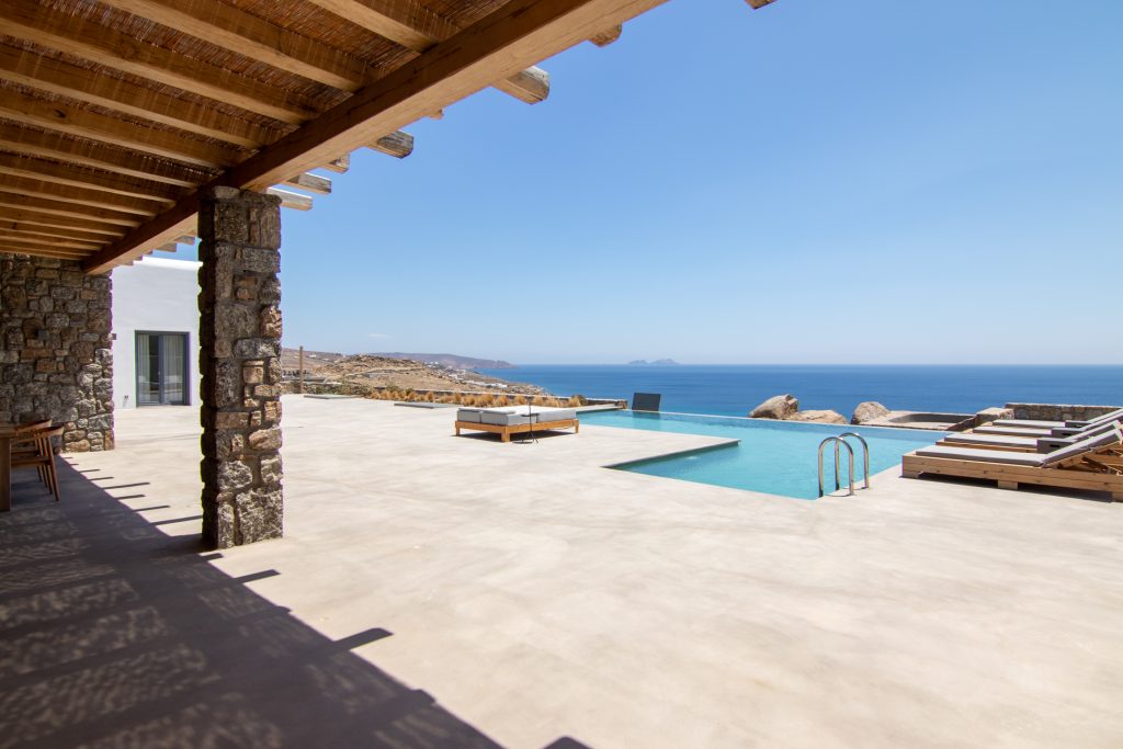 The villa’s outdoor area is a haven for relaxation and indulgence. The large infinity pool is surrounded by panoramic views of the Aegean, creating a mesmerizing backdrop for your stay. The spacious verandas and outdoor dining area invite you to savor meals and moments while soaking in the serene beauty of the island.