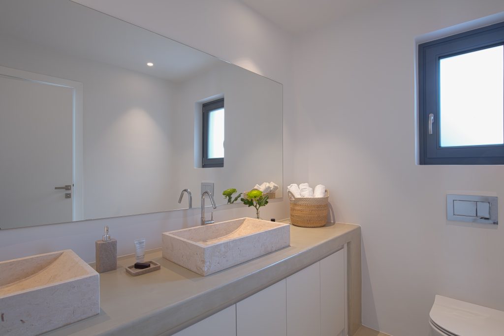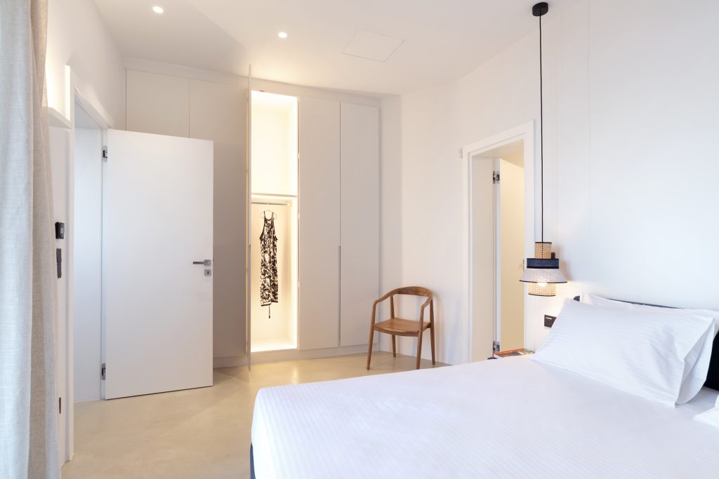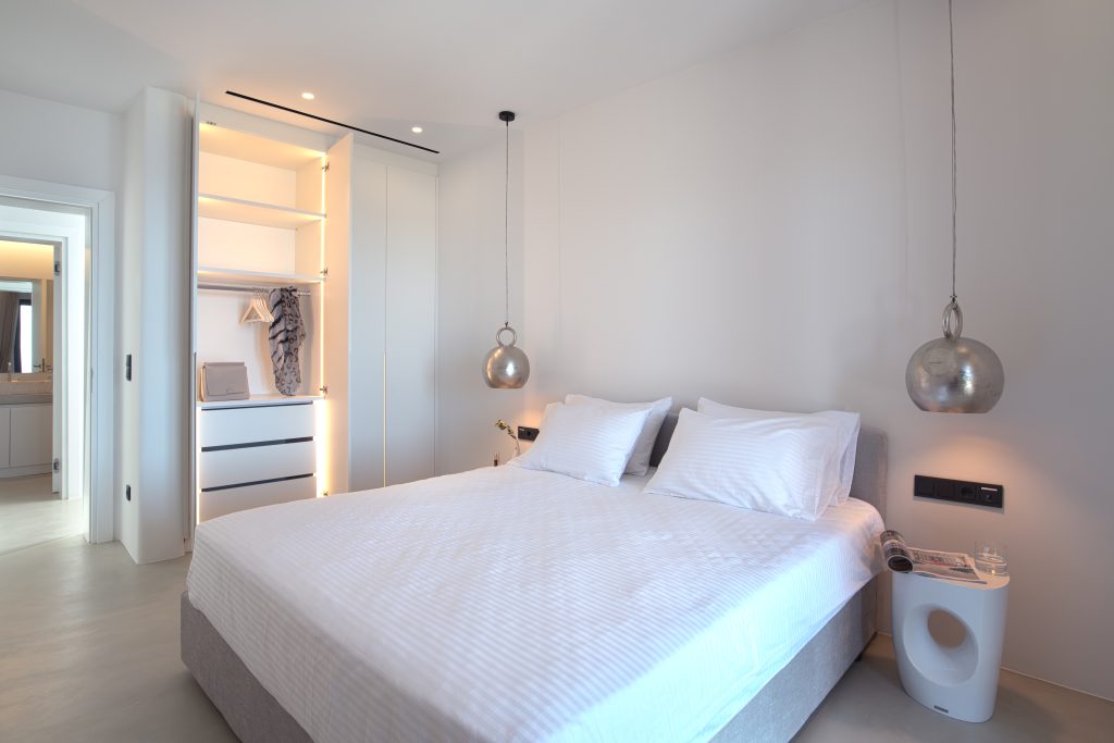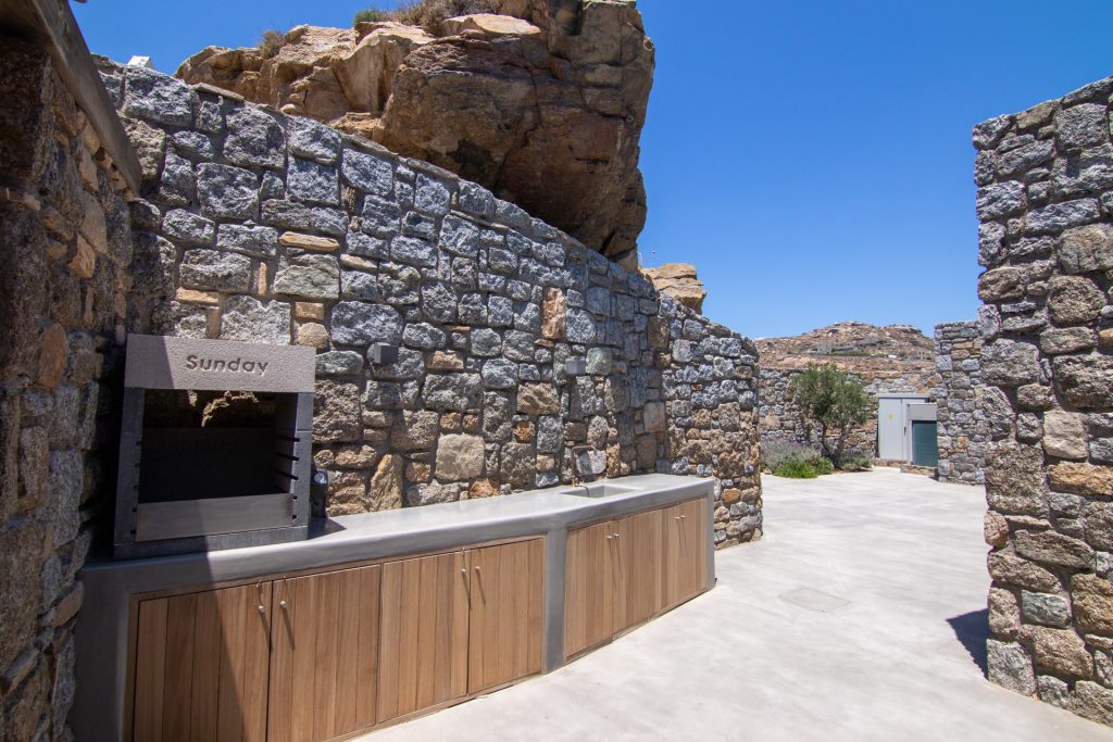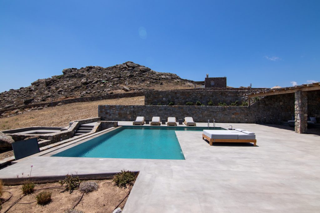 The villa’s outdoor area is a haven for relaxation and indulgence. The large infinity pool is surrounded by panoramic views of the Aegean, creating a mesmerizing backdrop for your stay. The spacious verandas and outdoor dining area invite you to savor meals and moments while soaking in the serene beauty of the island.