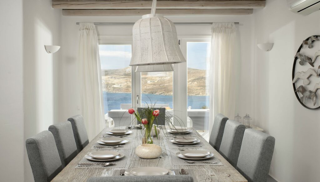 Set across two levels and spanning 200 m², the villa accommodates up to 10 guests in spacious comfort. Indoors, guests are welcomed into a bright open-plan living and dining area that flows effortlessly onto a sea-view veranda, ideal for sunset cocktails or leisurely breakfasts. The fully equipped kitchen invites in-villa dining and chef-prepared meals, while the Aegean Sea feels ever-present through large windows.