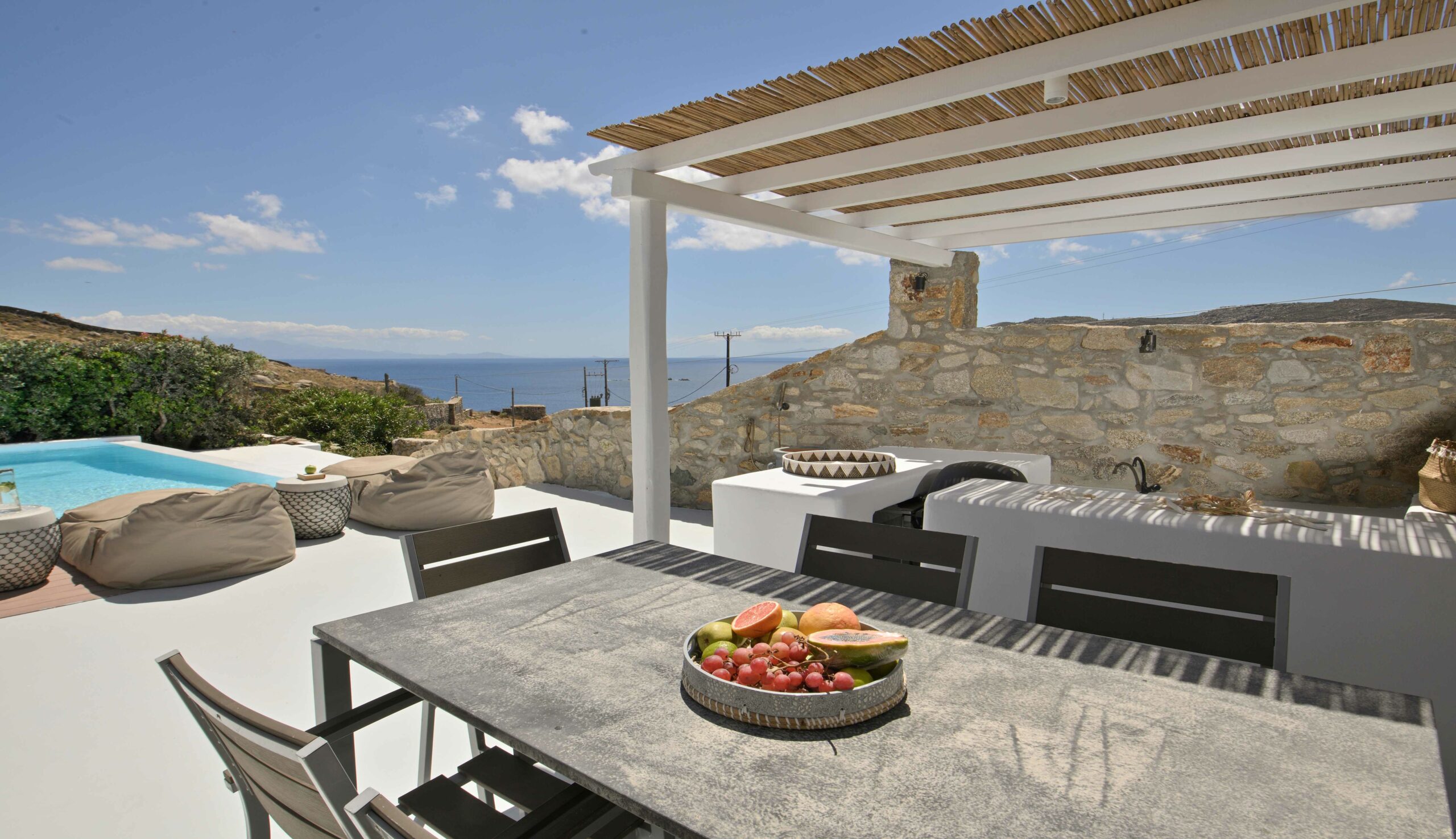 The outdoor spaces are designed for total indulgence: a refreshing swimming pool surrounded by comfy sunbeds, a shaded pergola lounge with coffee table, an alfresco bar with gas BBQ, and two dining areas—one by the pool and one on the upper veranda—all with expansive views of the sea.