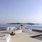 The villa’s architecture showcases traditional white stucco and stone construction, seamlessly blending with the natural landscape. Its elevated position provides unobstructed panoramic views of the Aegean Sea, including the enchanting islands of Delos and Rhenia, offering guests a front-row seat to mesmerizing sunsets.