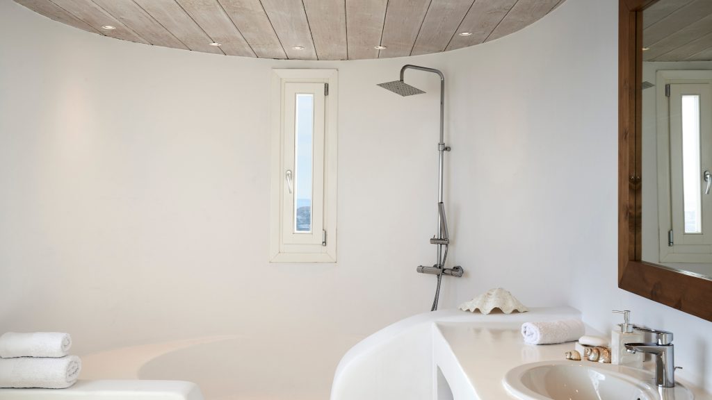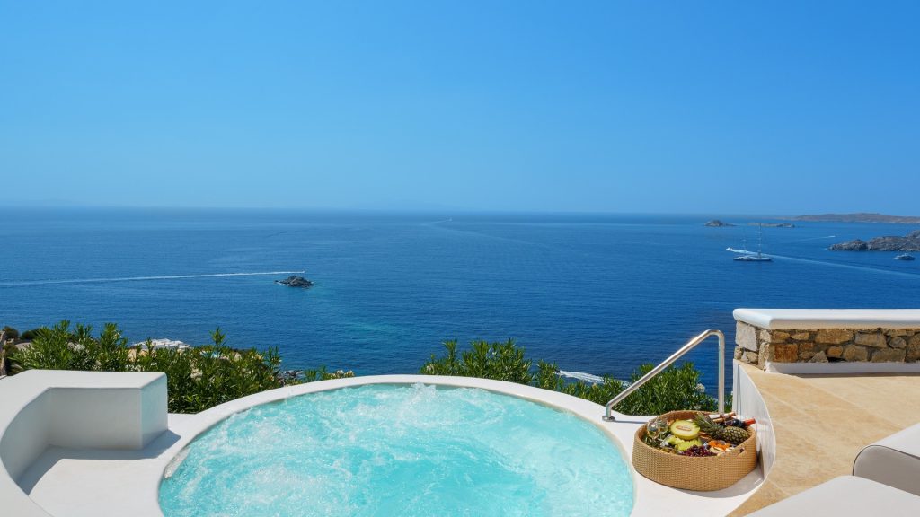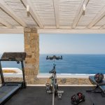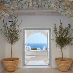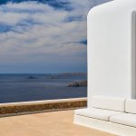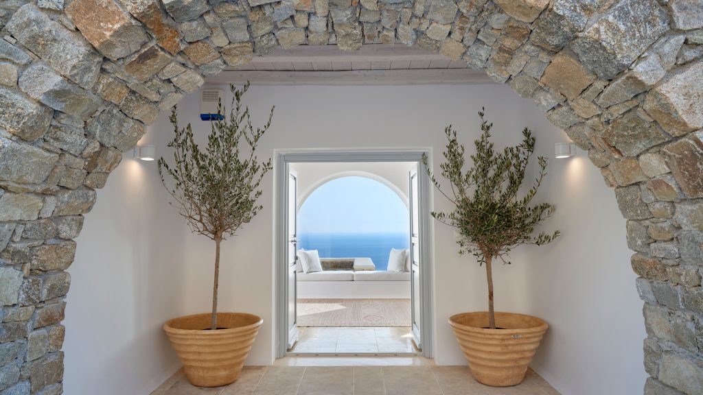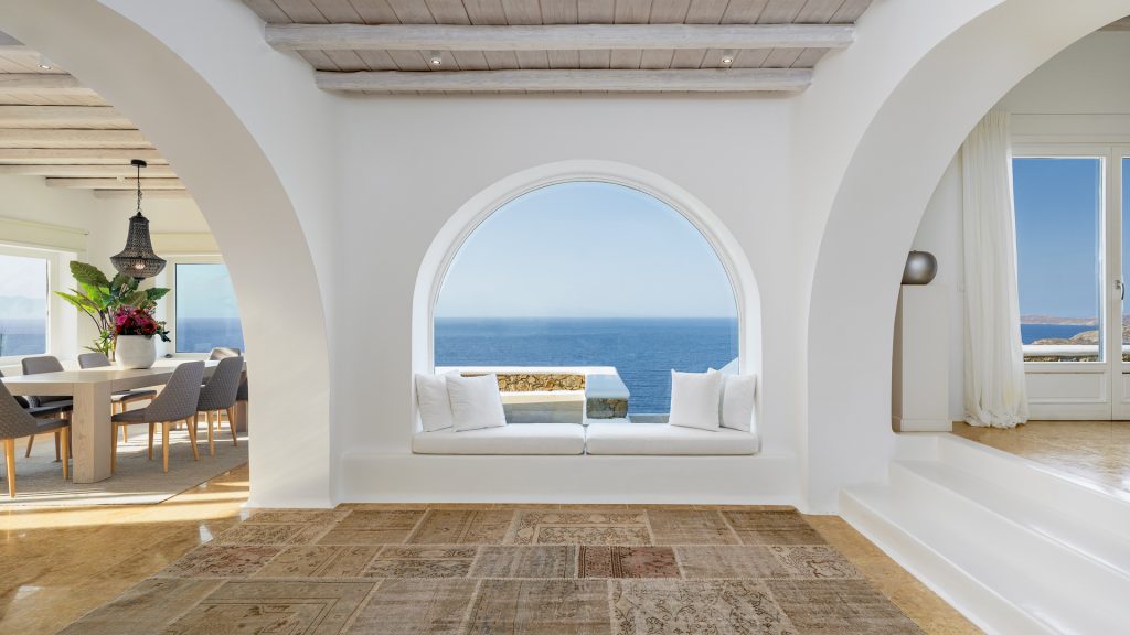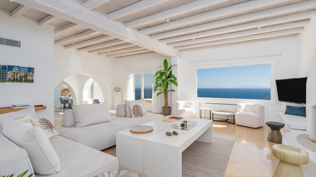 The villa is cleverly built into the landscape, offering multiple levels of indoor and outdoor living spaces. Its clean architectural lines, natural color palette, and handpicked artwork create an inviting atmosphere flooded with natural light. Guests can relax by the striking infinity pool, soak in the heated jacuzzi overlooking endless blues, or lounge in several shaded outdoor seating areas.