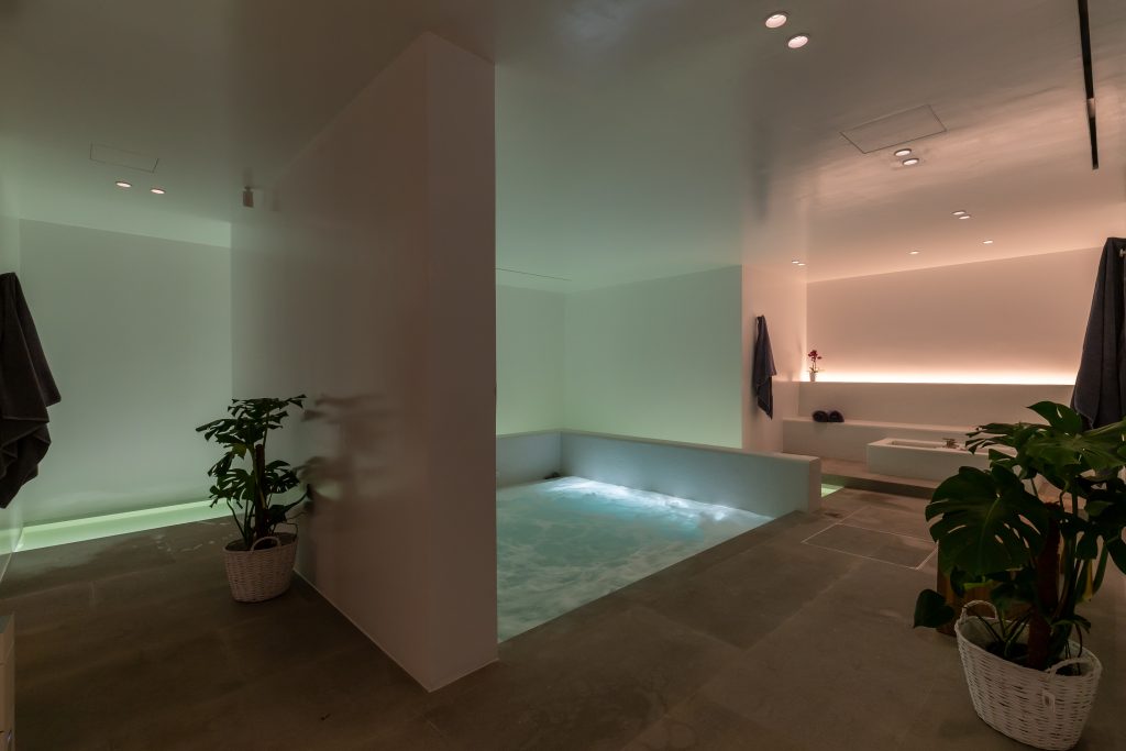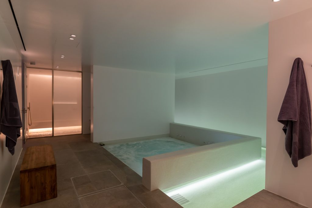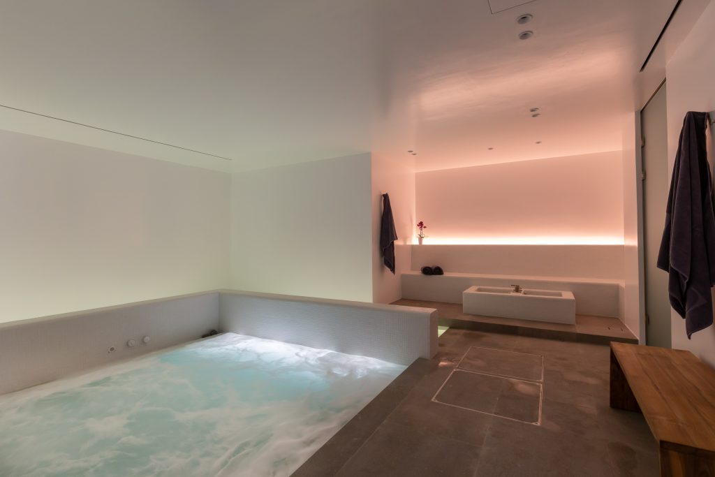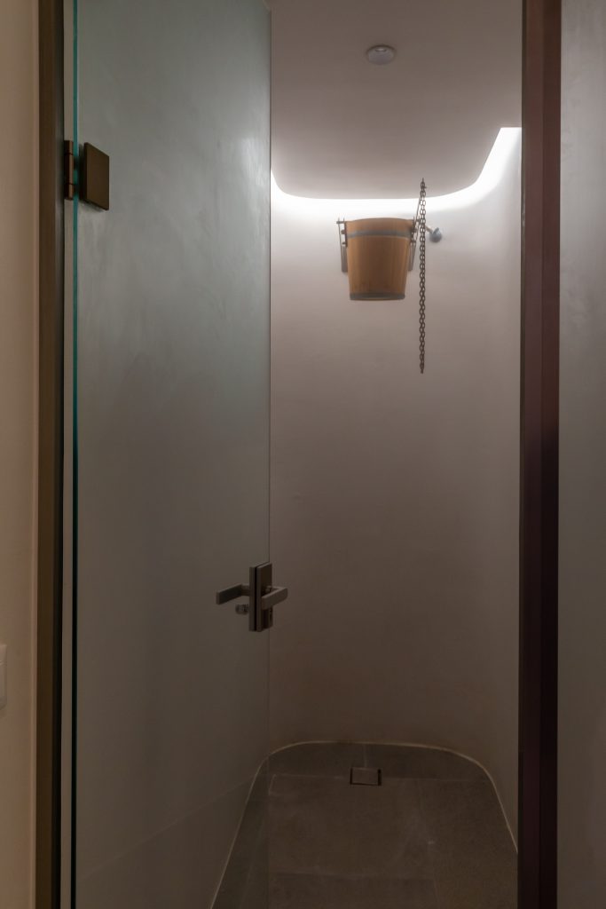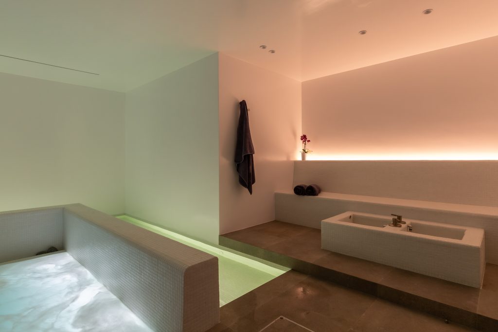 Spa with sauna, steam room, and massage area