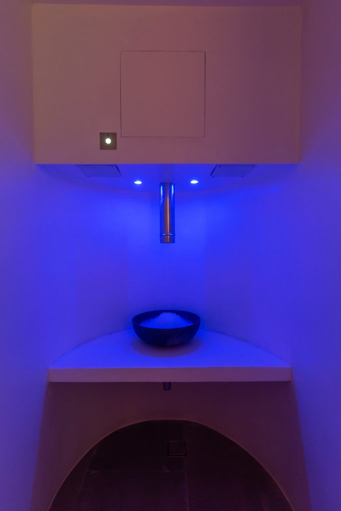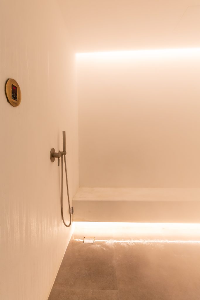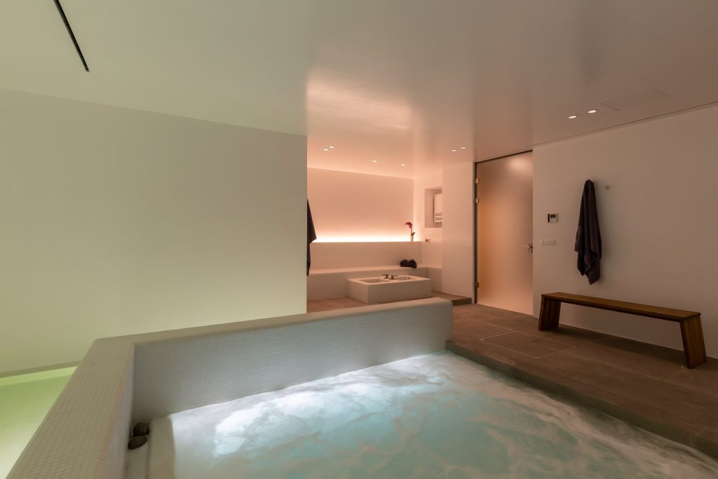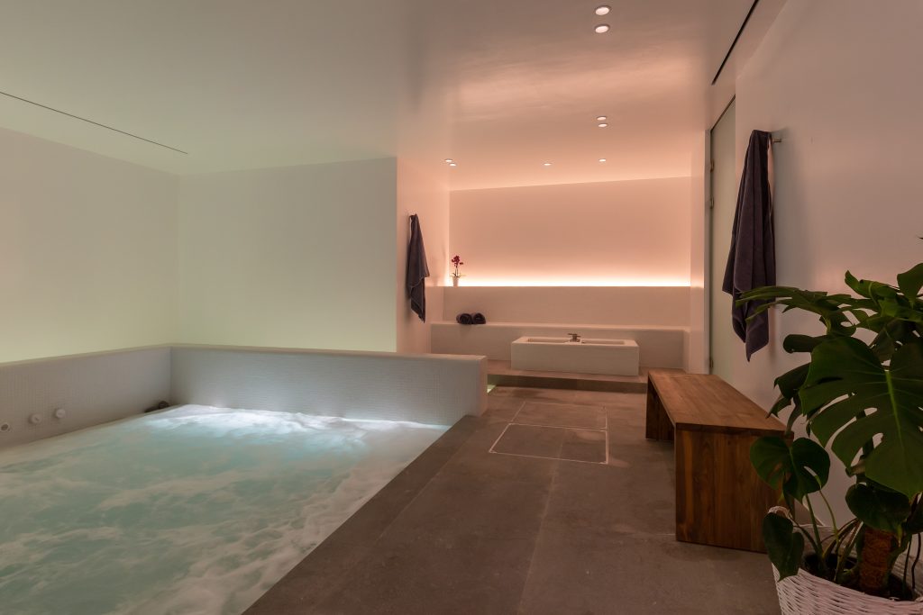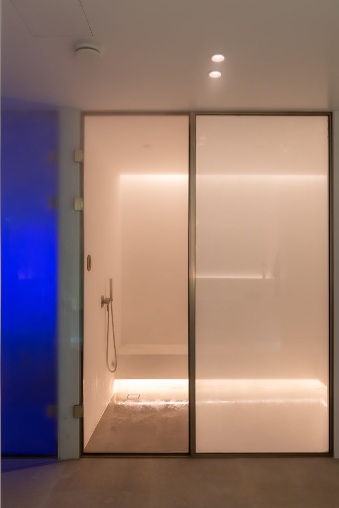 Spa with sauna, steam room, and massage area