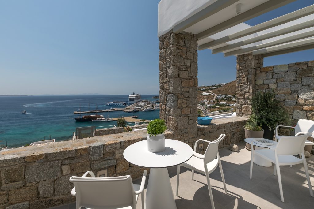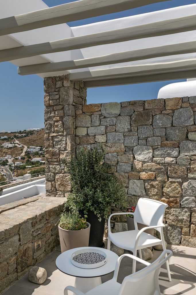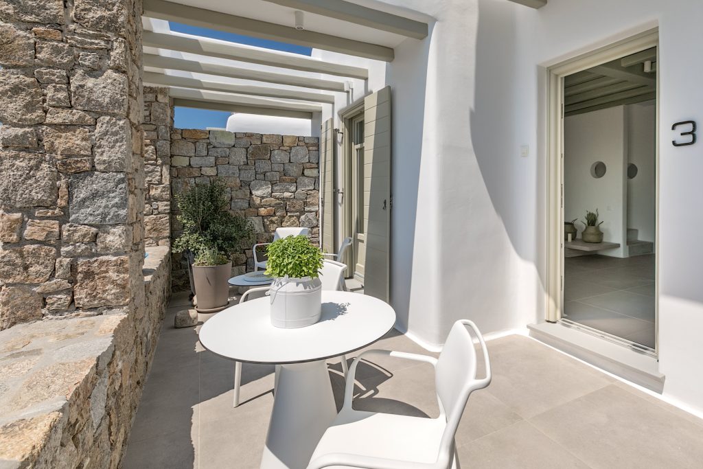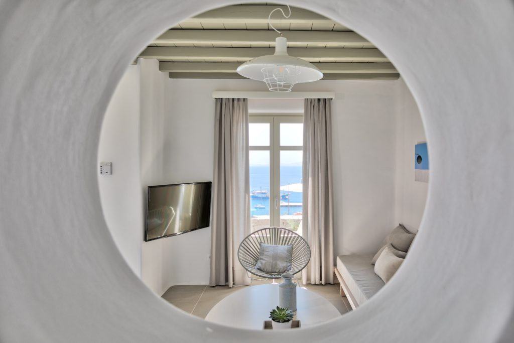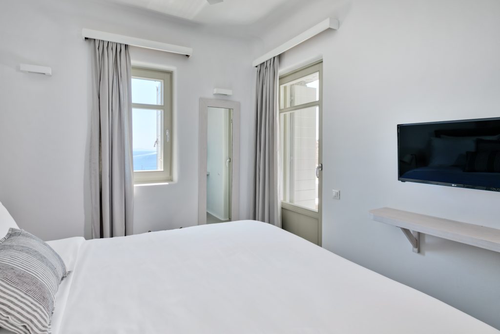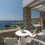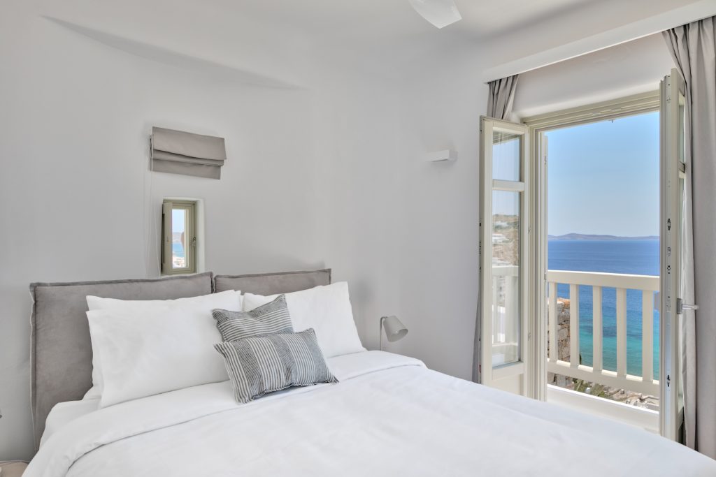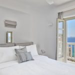 Welcome to Villa Vellum, a serene haven tucked away in the picturesque landscape of Mykonos, Tourlos. The entrance level of this elegant villa greets you with a fully equipped open-plan kitchen, a dining area for six, and a cozy living room featuring built-in sofas and a TV. Step outside through the balcony doors to admire the mesmerizing sea views and feel the gentle breeze of the Aegean Sea. The first bedroom, offering either a double bed or twin beds, boasts ceiling fans, A/C, and a private bathroom with a shower, providing a tranquil retreat with stunning vistas.