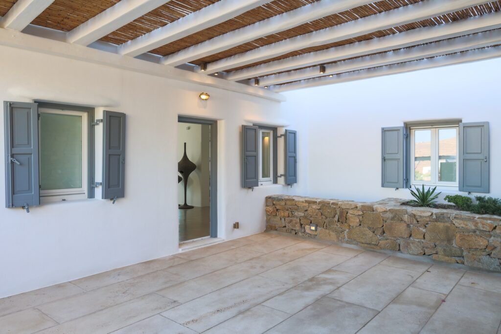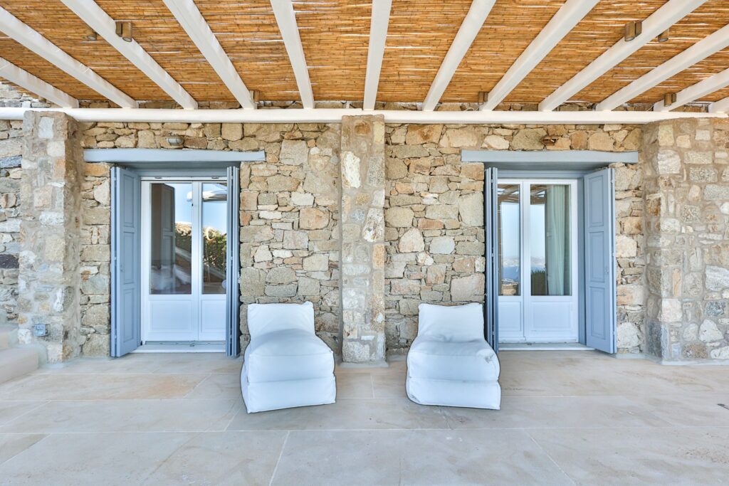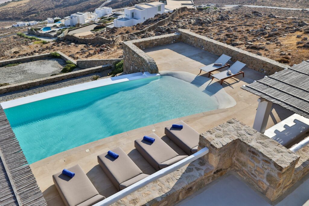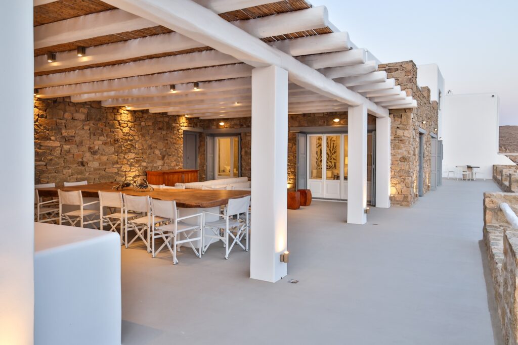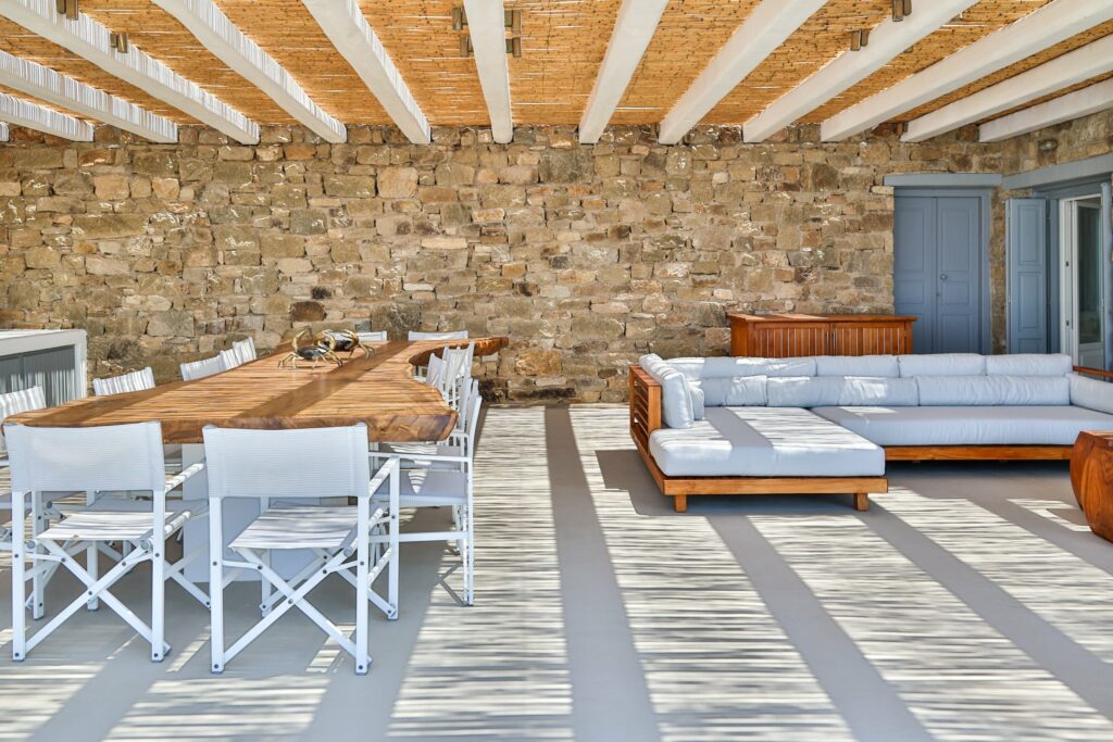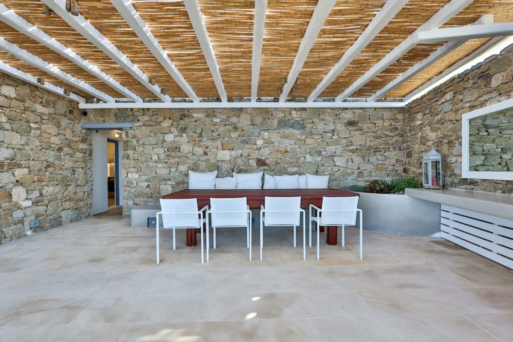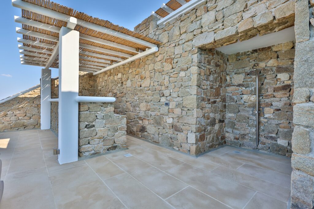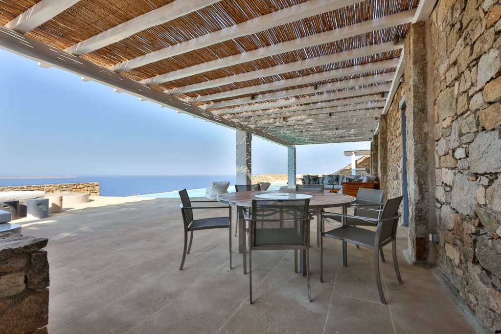 Outdoors, the villa truly comes to life. A heated swimming pool sits at the heart of the property, surrounded by expansive terraces designed for sunbathing, lounging, and alfresco dining. Guests can enjoy spectacular sunsets, unwind in the tranquil atmosphere, or host memorable gatherings under the Mykonian sky.