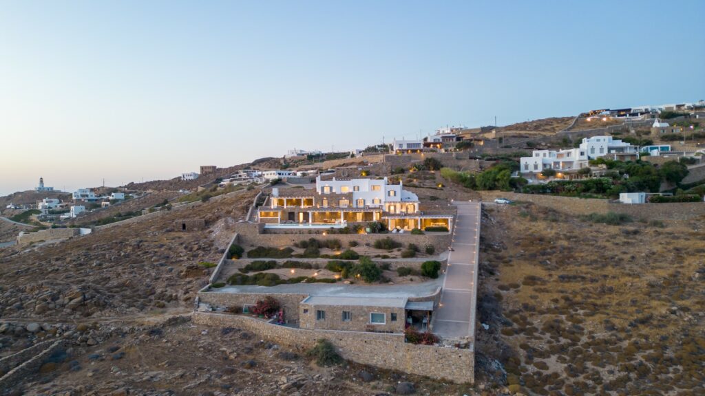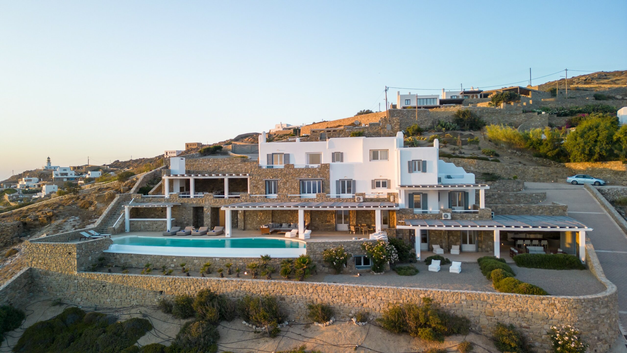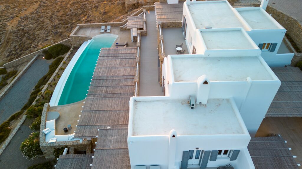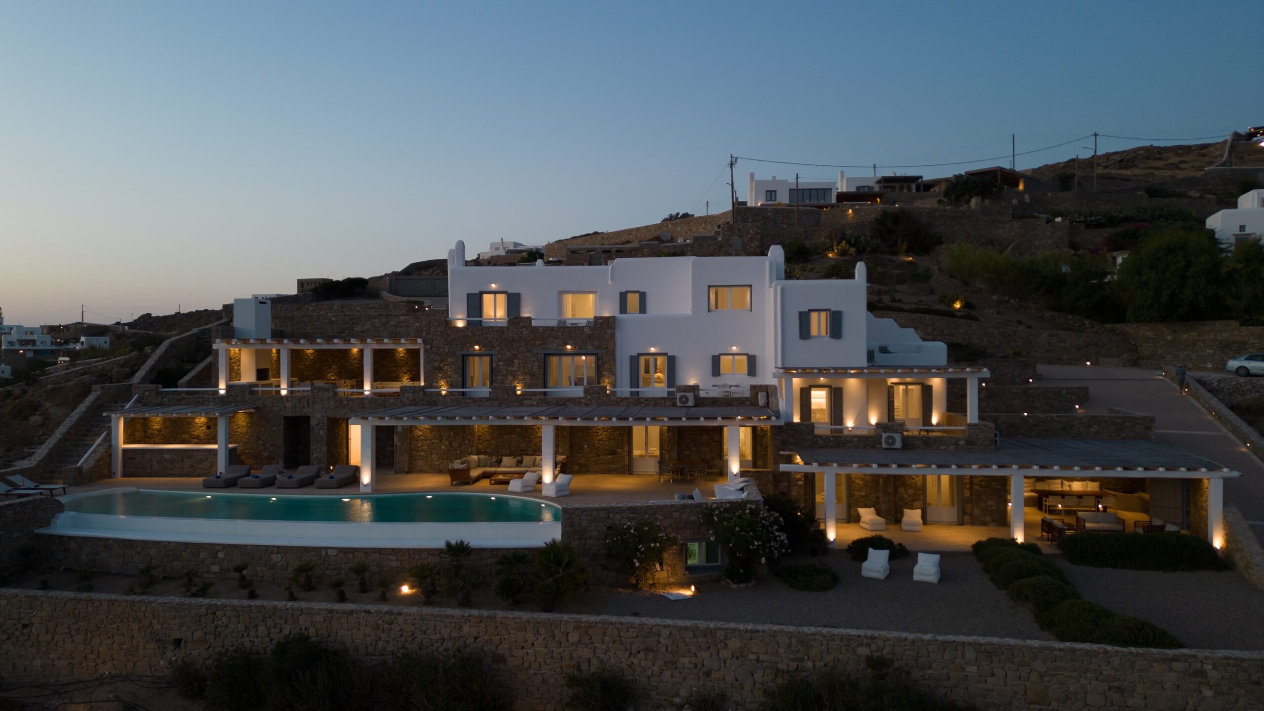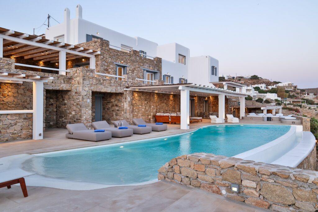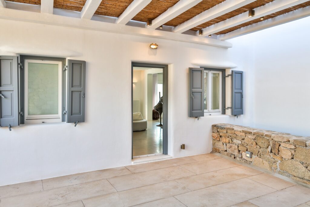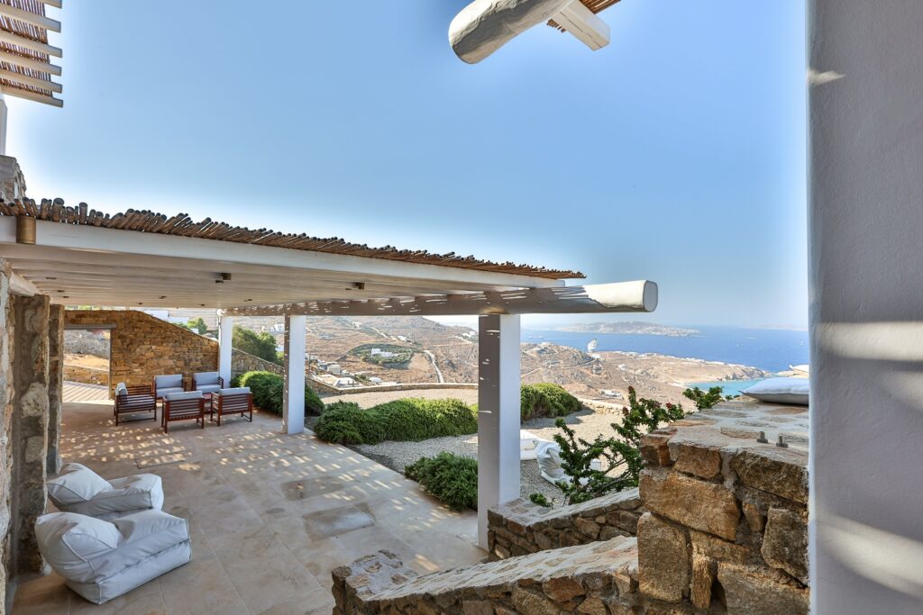 Outdoors, the villa truly comes to life. A heated swimming pool sits at the heart of the property, surrounded by expansive terraces designed for sunbathing, lounging, and alfresco dining. Guests can enjoy spectacular sunsets, unwind in the tranquil atmosphere, or host memorable gatherings under the Mykonian sky.