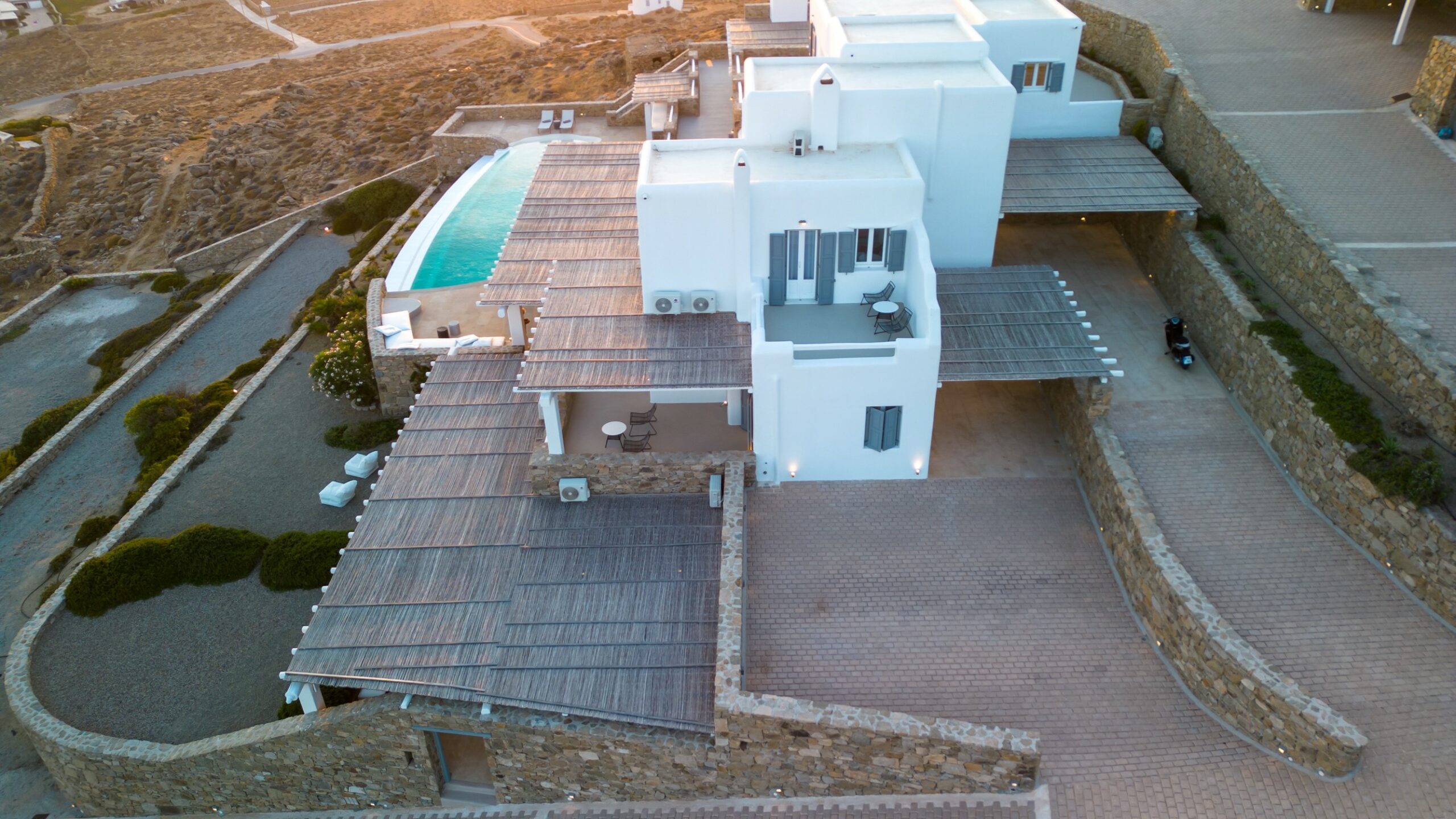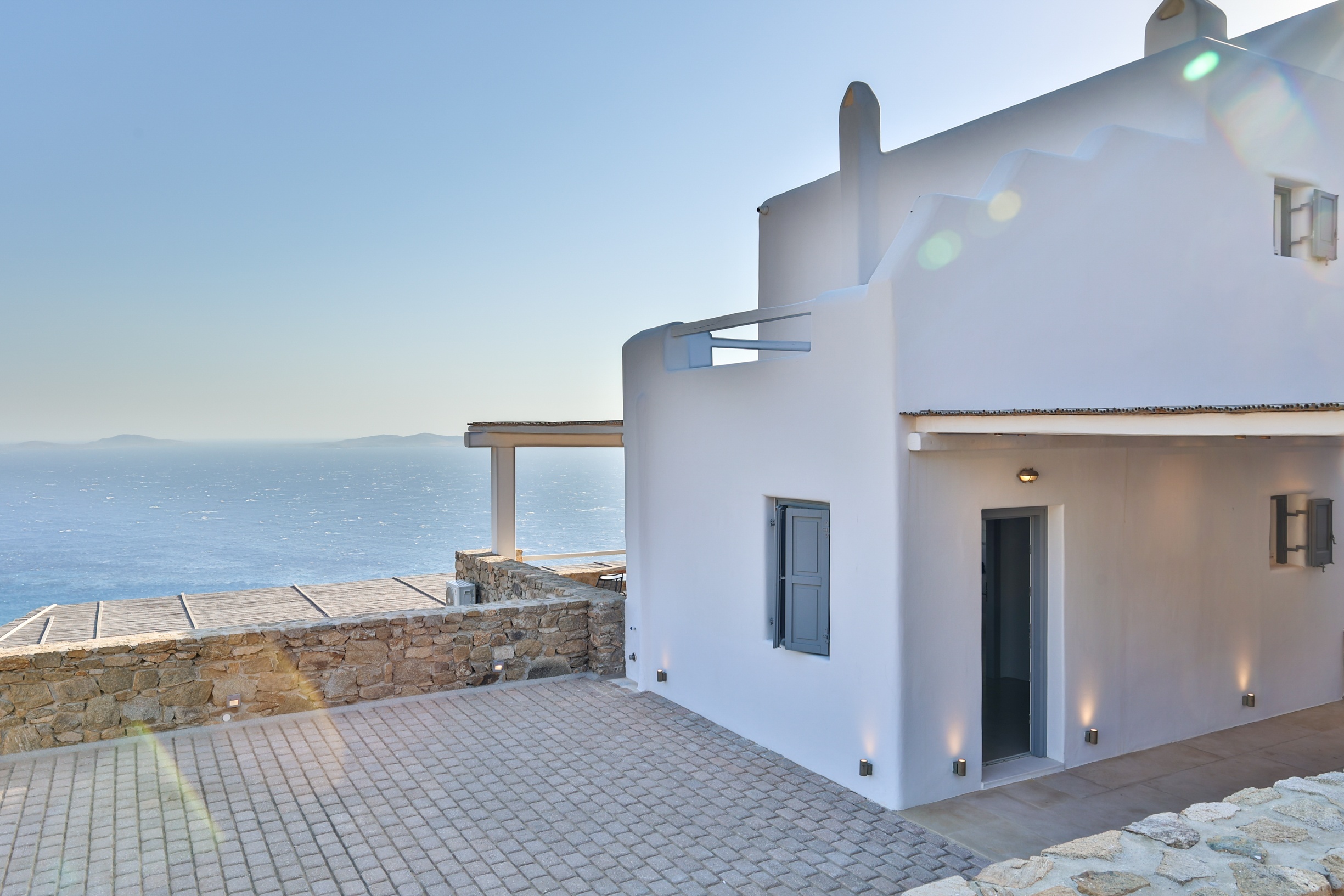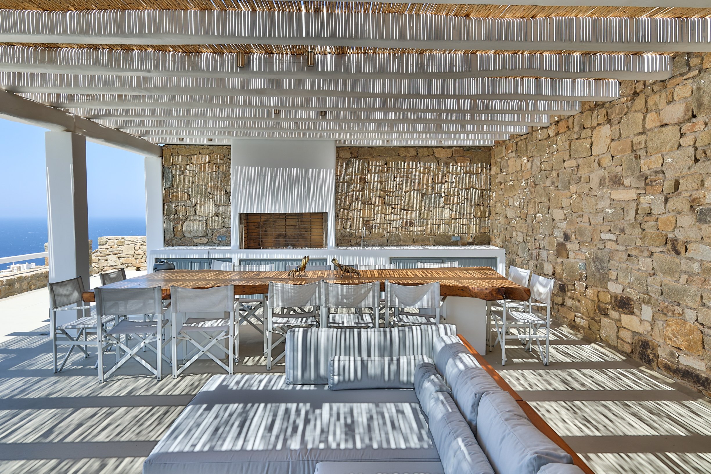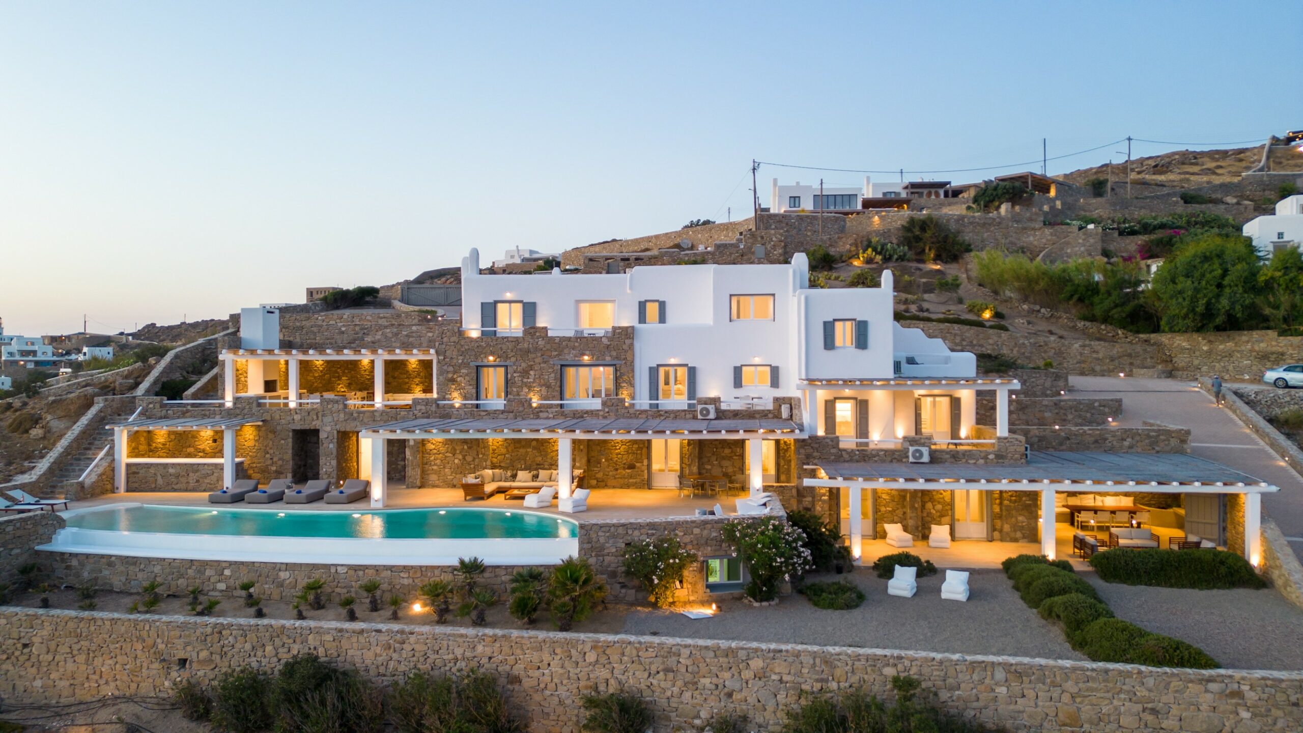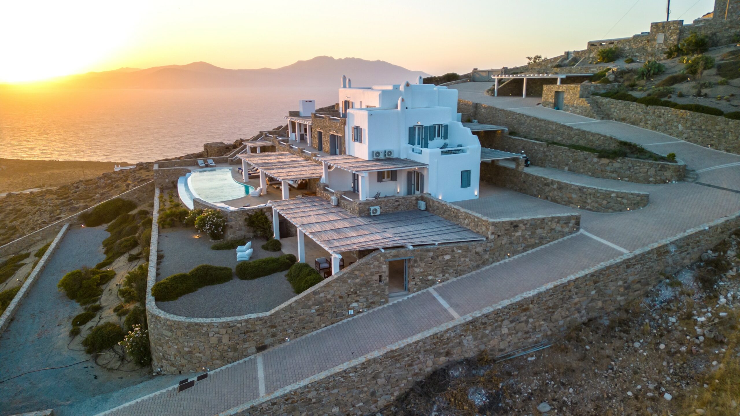Outdoors, the villa truly comes to life. A heated swimming pool sits at the heart of the property, surrounded by expansive terraces designed for sunbathing, lounging, and alfresco dining. Guests can enjoy spectacular sunsets, unwind in the tranquil atmosphere, or host memorable gatherings under the Mykonian sky.