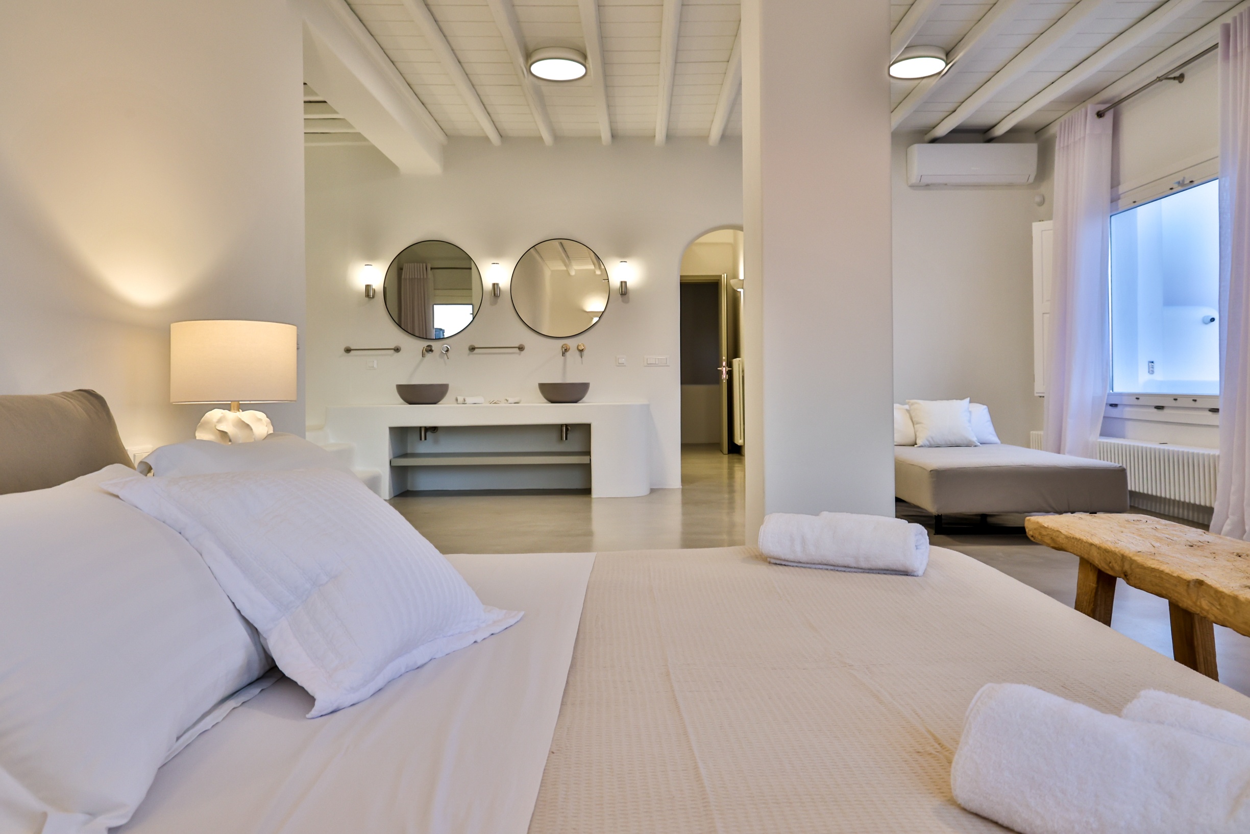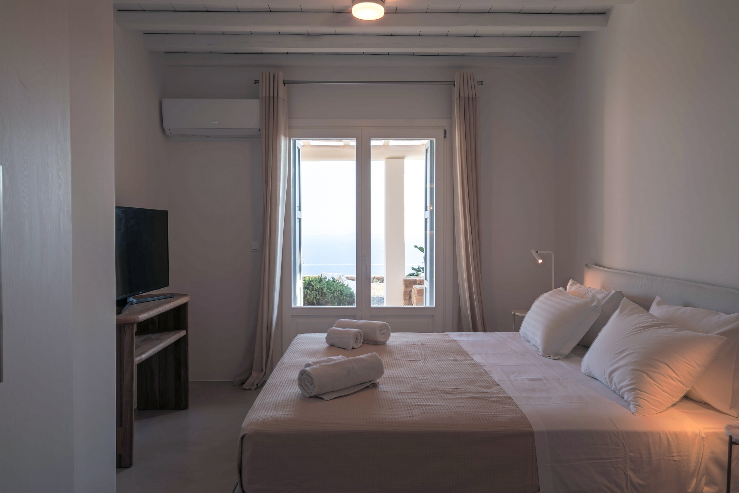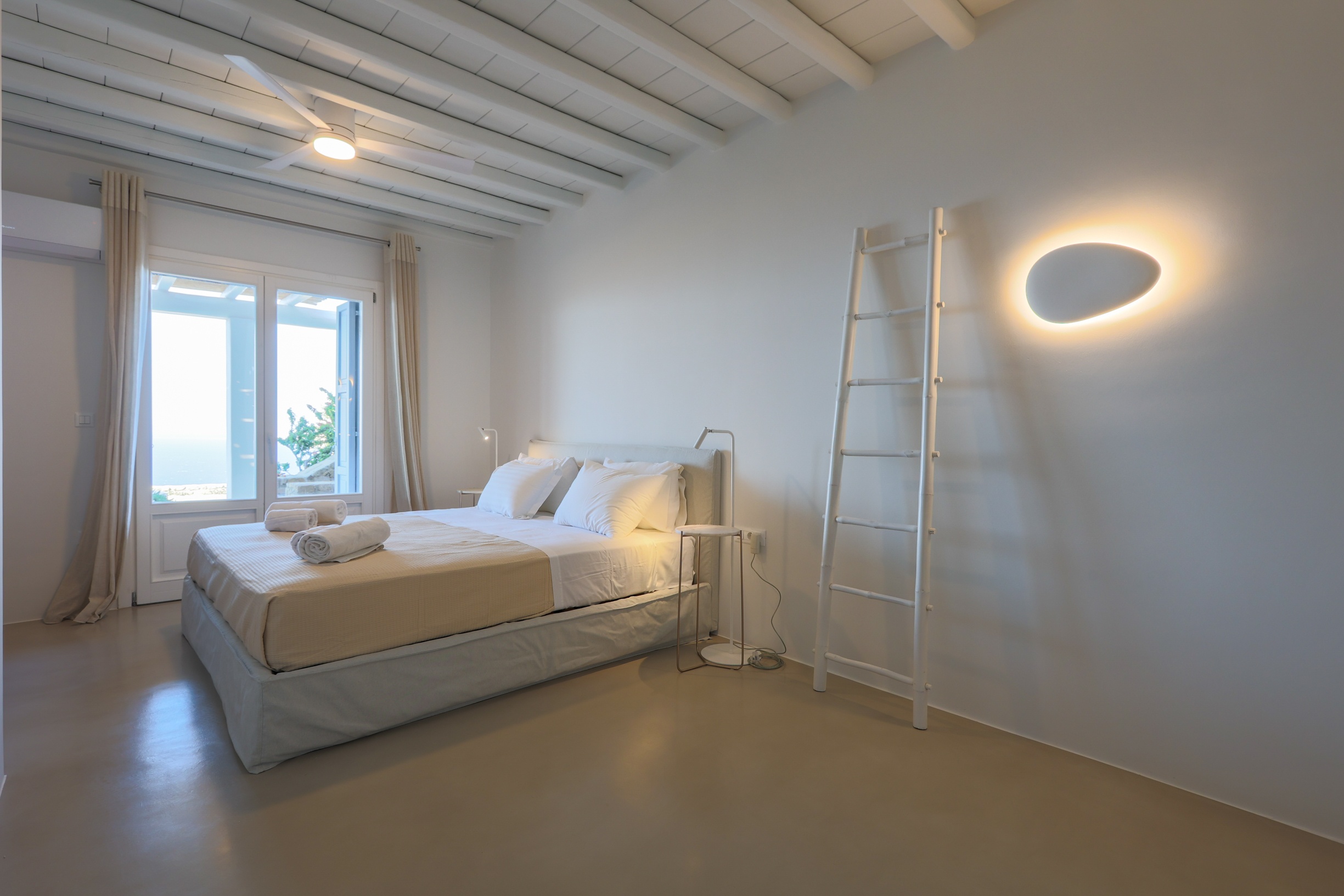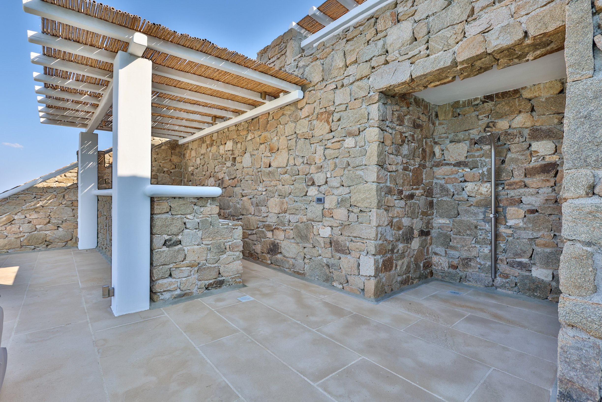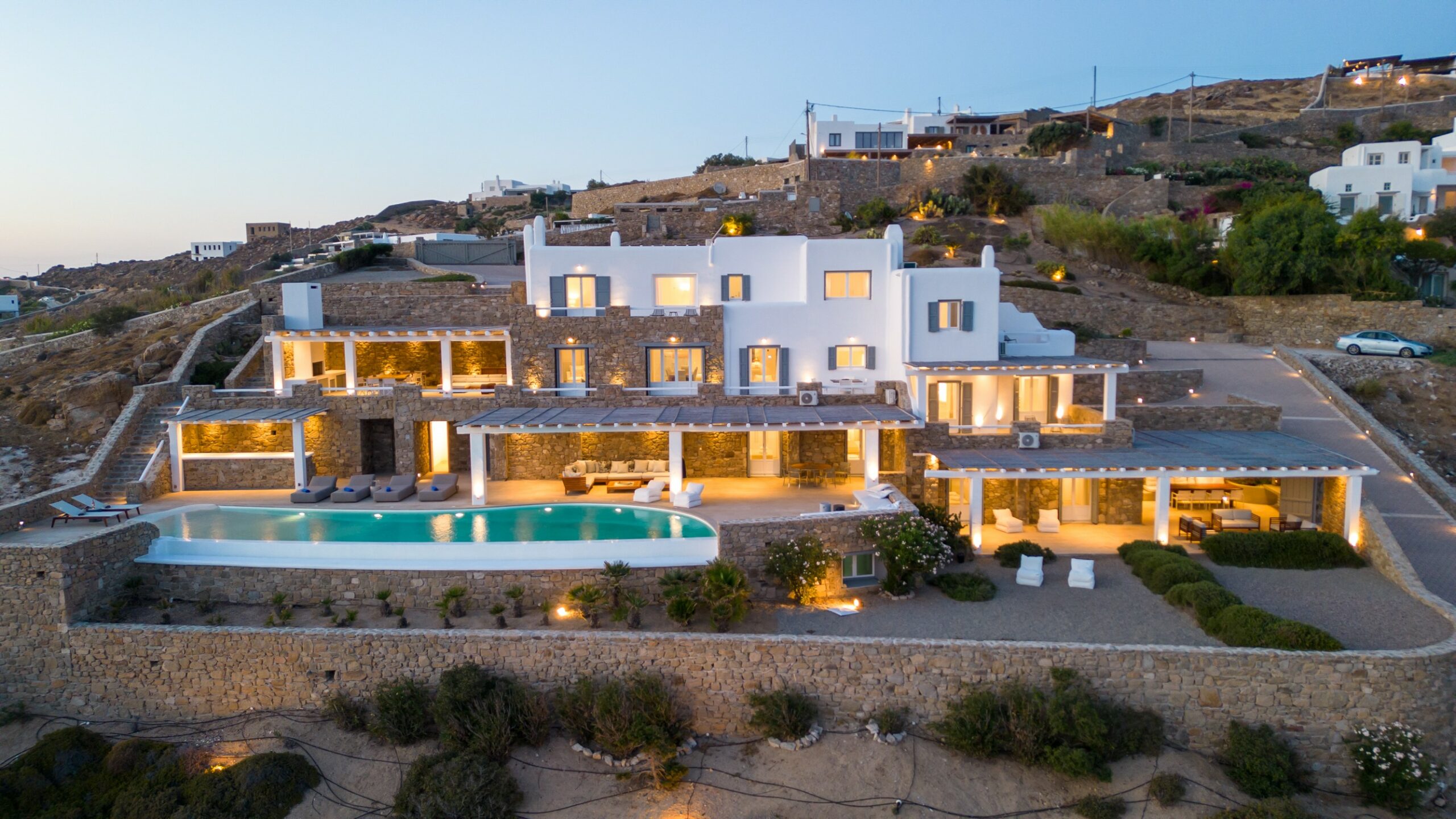 Outdoors, the villa truly comes to life. A heated swimming pool sits at the heart of the property, surrounded by expansive terraces designed for sunbathing, lounging, and alfresco dining. Guests can enjoy spectacular sunsets, unwind in the tranquil atmosphere, or host memorable gatherings under the Mykonian sky.