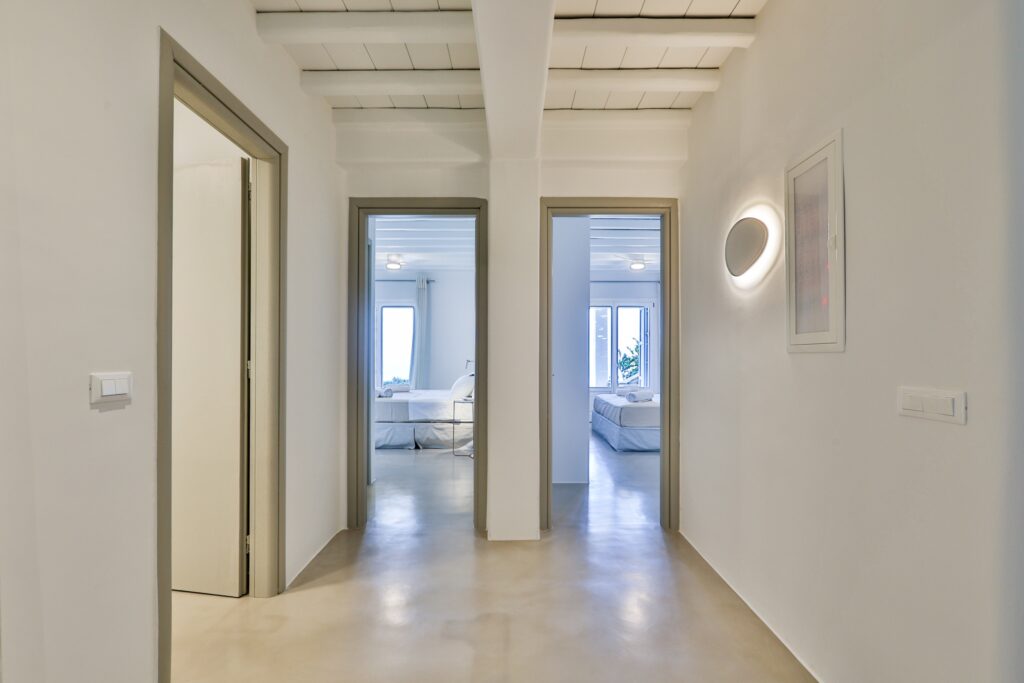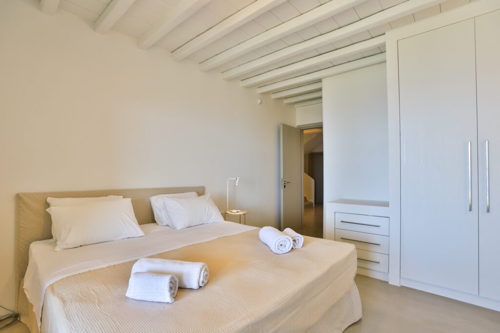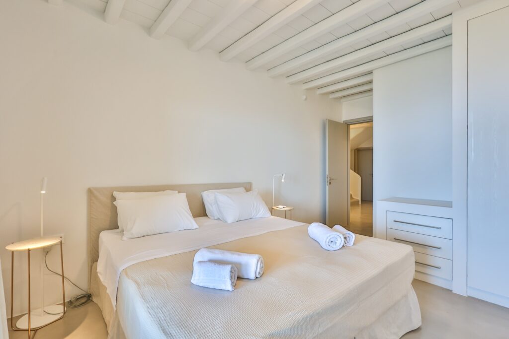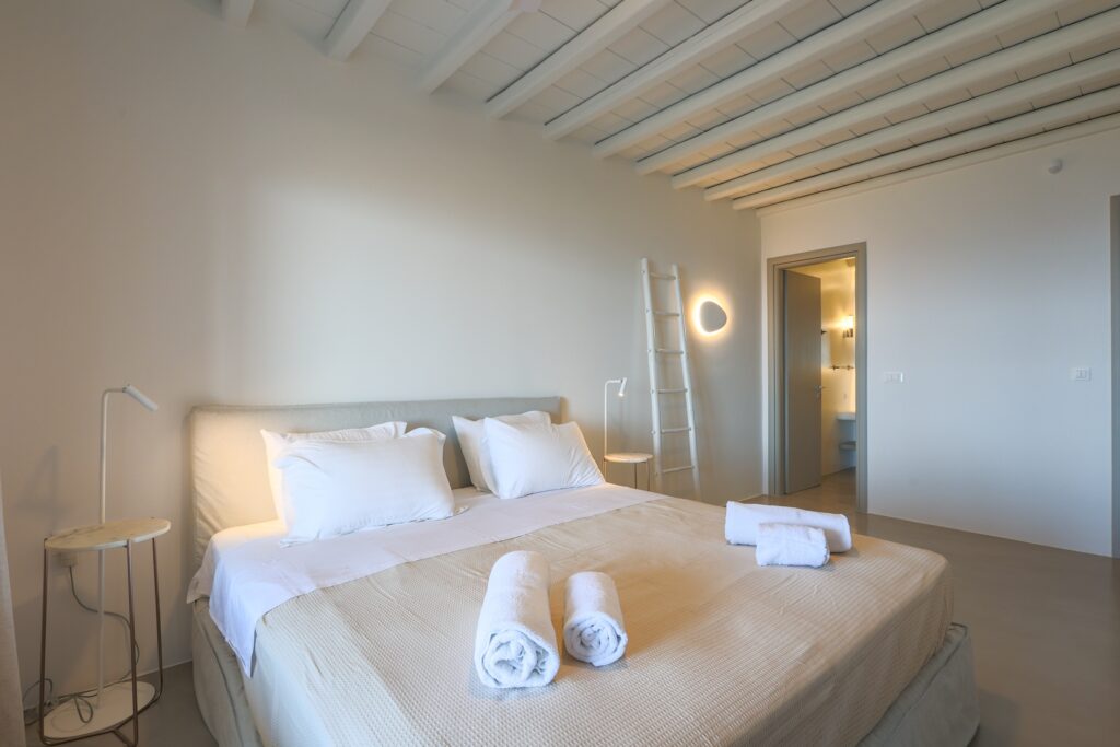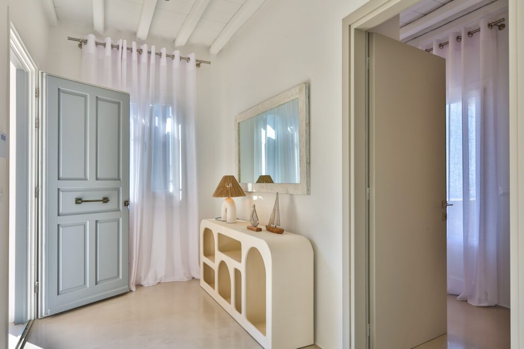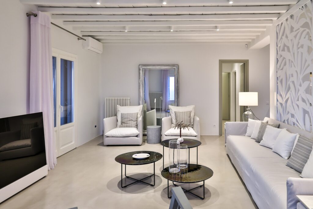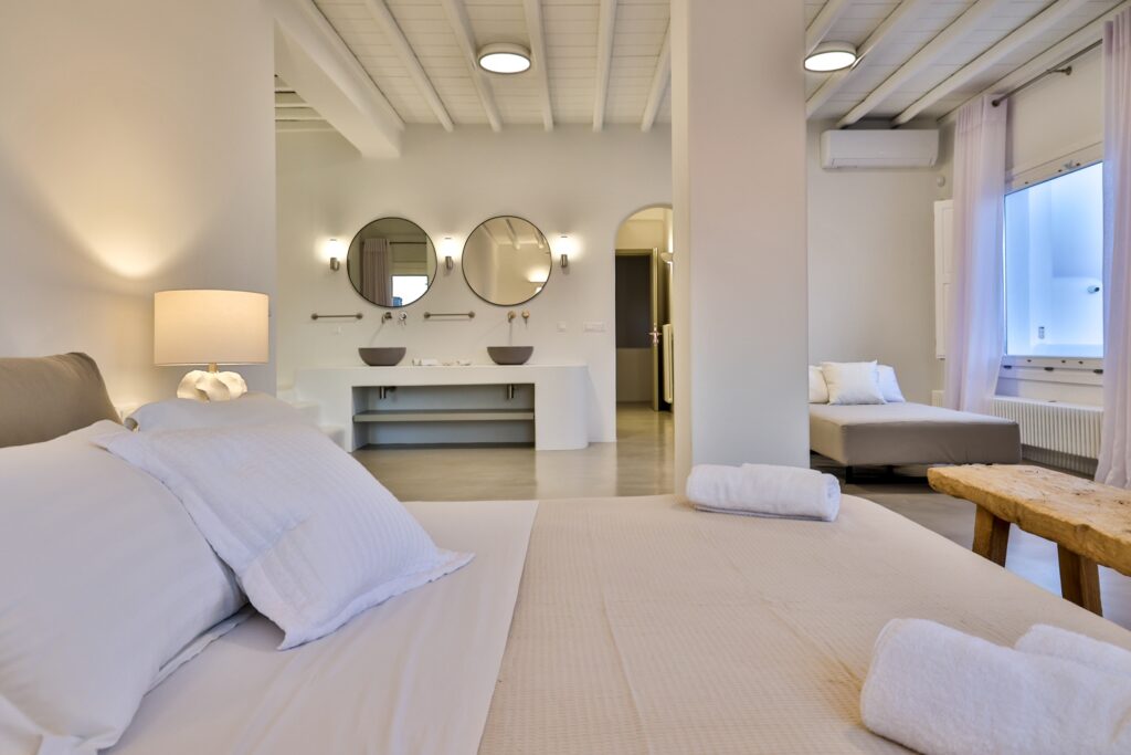The villa’s interior spaces reflect a seamless blend of Cycladic charm and modern elegance. A fully equipped kitchen allows for effortless dining experiences, whether preparing casual meals or hosting private chef dinners. Spacious living and dining areas provide welcoming environments for relaxation, social gatherings, and entertainment.