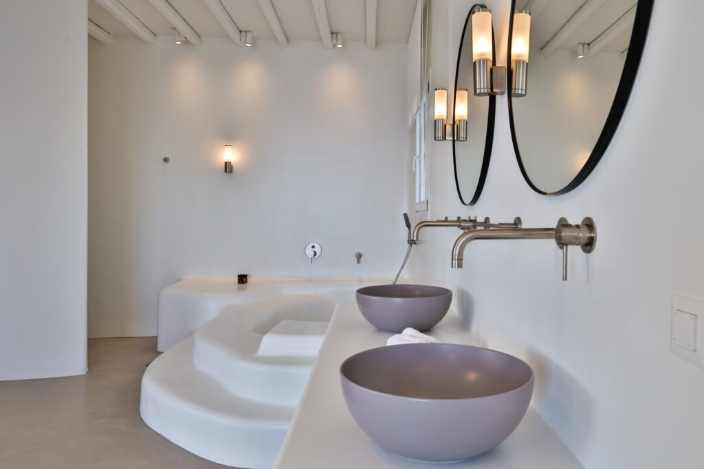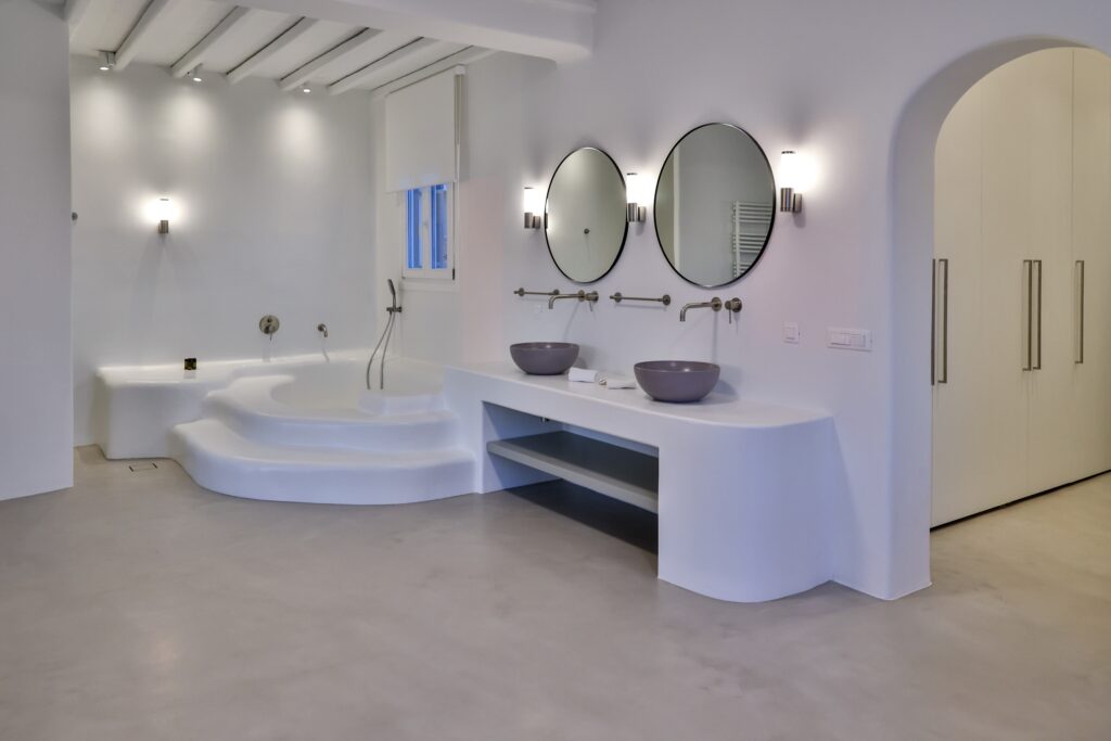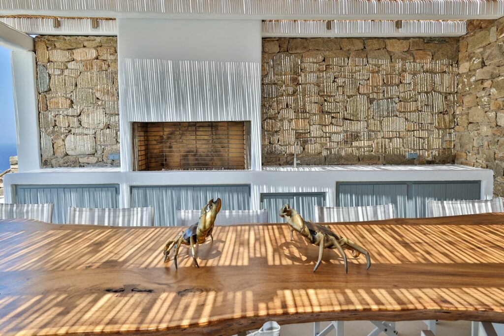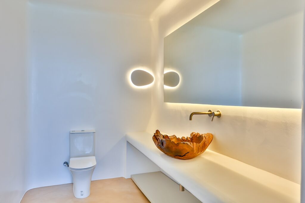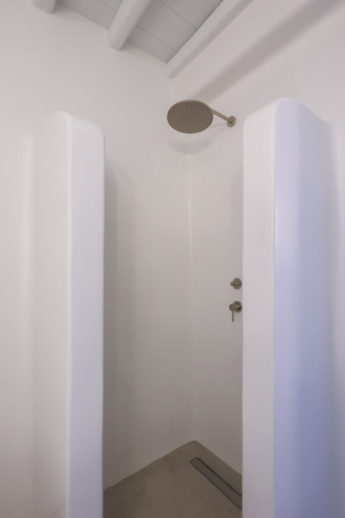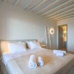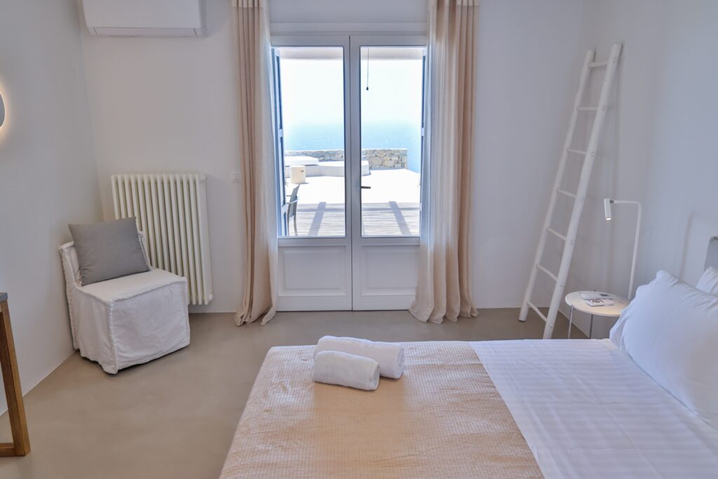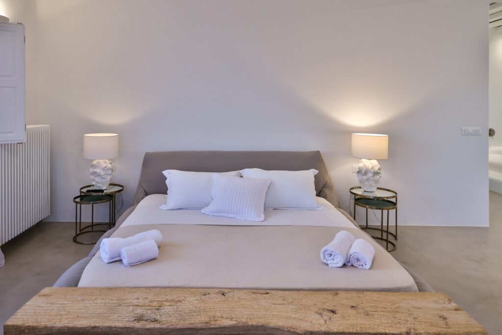 The villa’s interior spaces reflect a seamless blend of Cycladic charm and modern elegance. A fully equipped kitchen allows for effortless dining experiences, whether preparing casual meals or hosting private chef dinners. Spacious living and dining areas provide welcoming environments for relaxation, social gatherings, and entertainment.