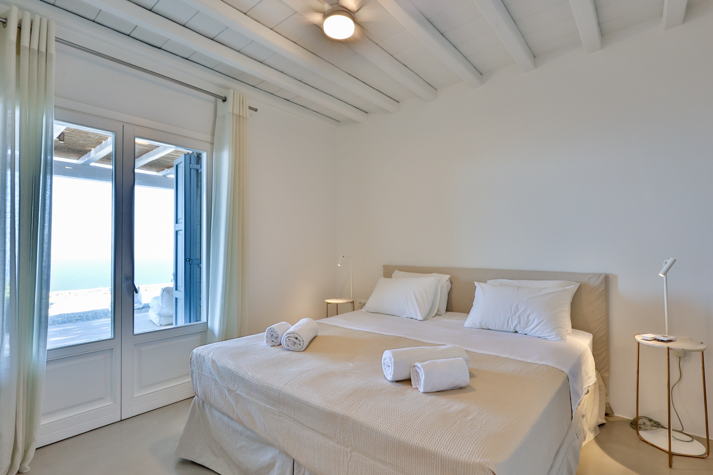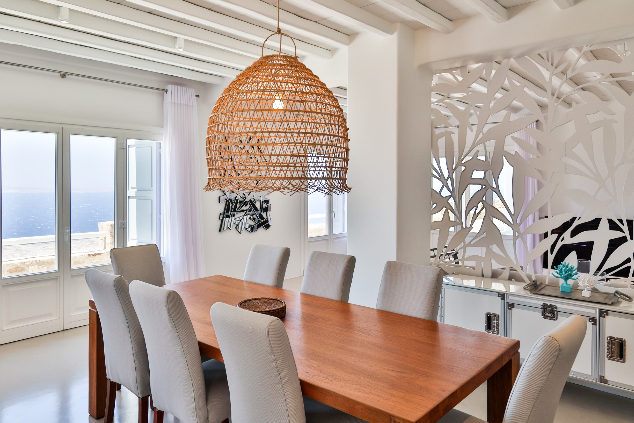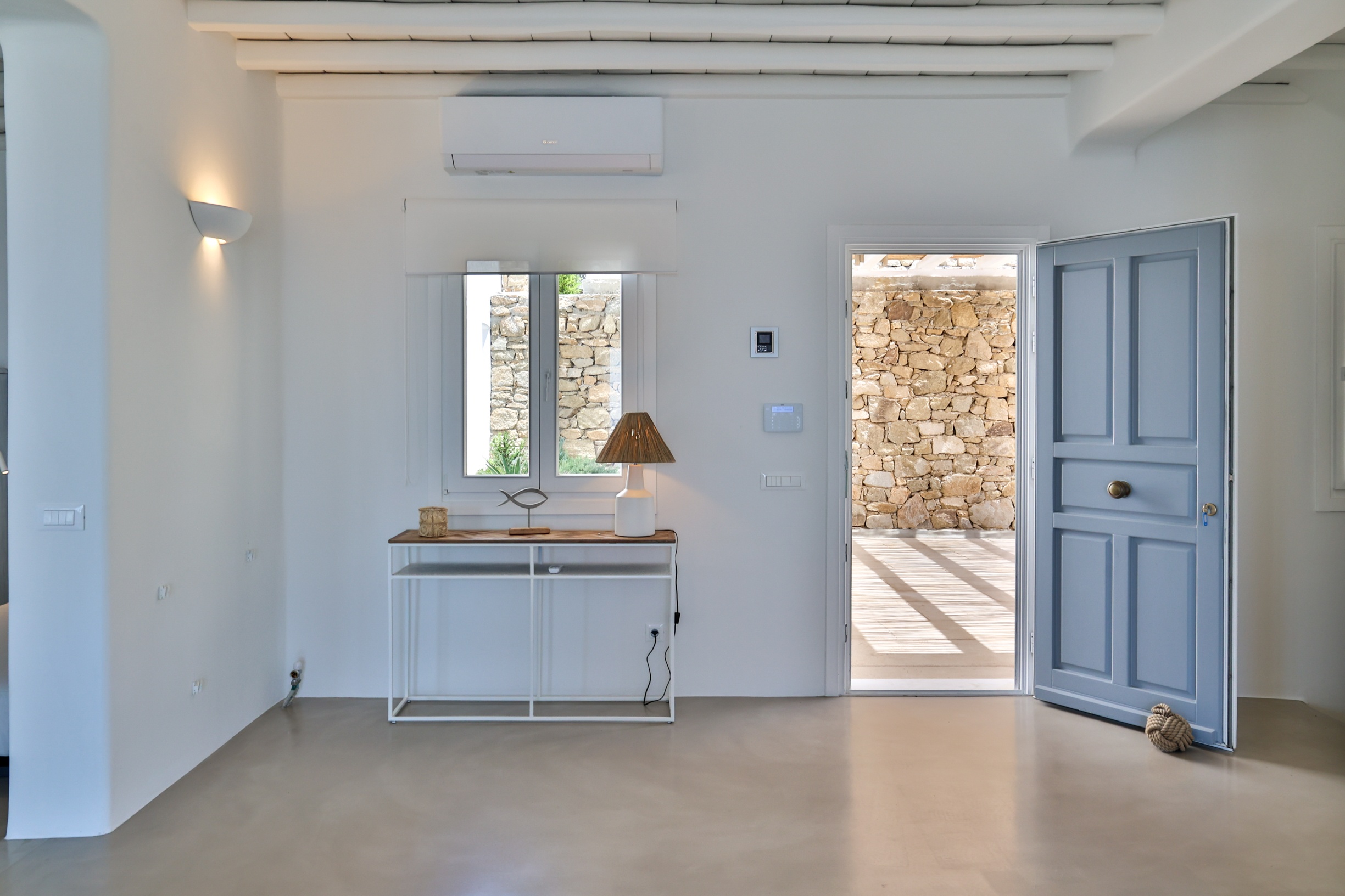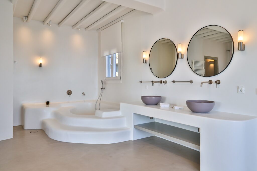 The villa’s interior spaces reflect a seamless blend of Cycladic charm and modern elegance. A fully equipped kitchen allows for effortless dining experiences, whether preparing casual meals or hosting private chef dinners. Spacious living and dining areas provide welcoming environments for relaxation, social gatherings, and entertainment.