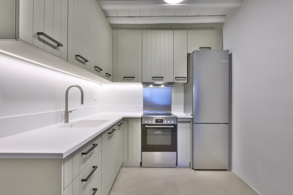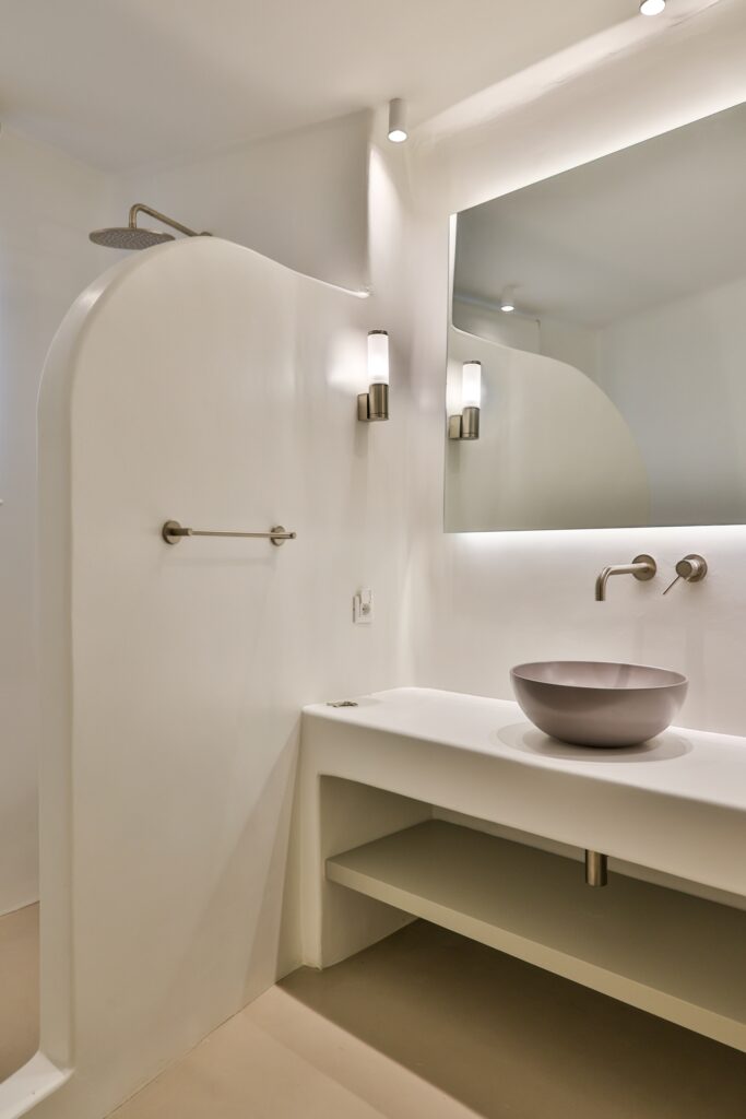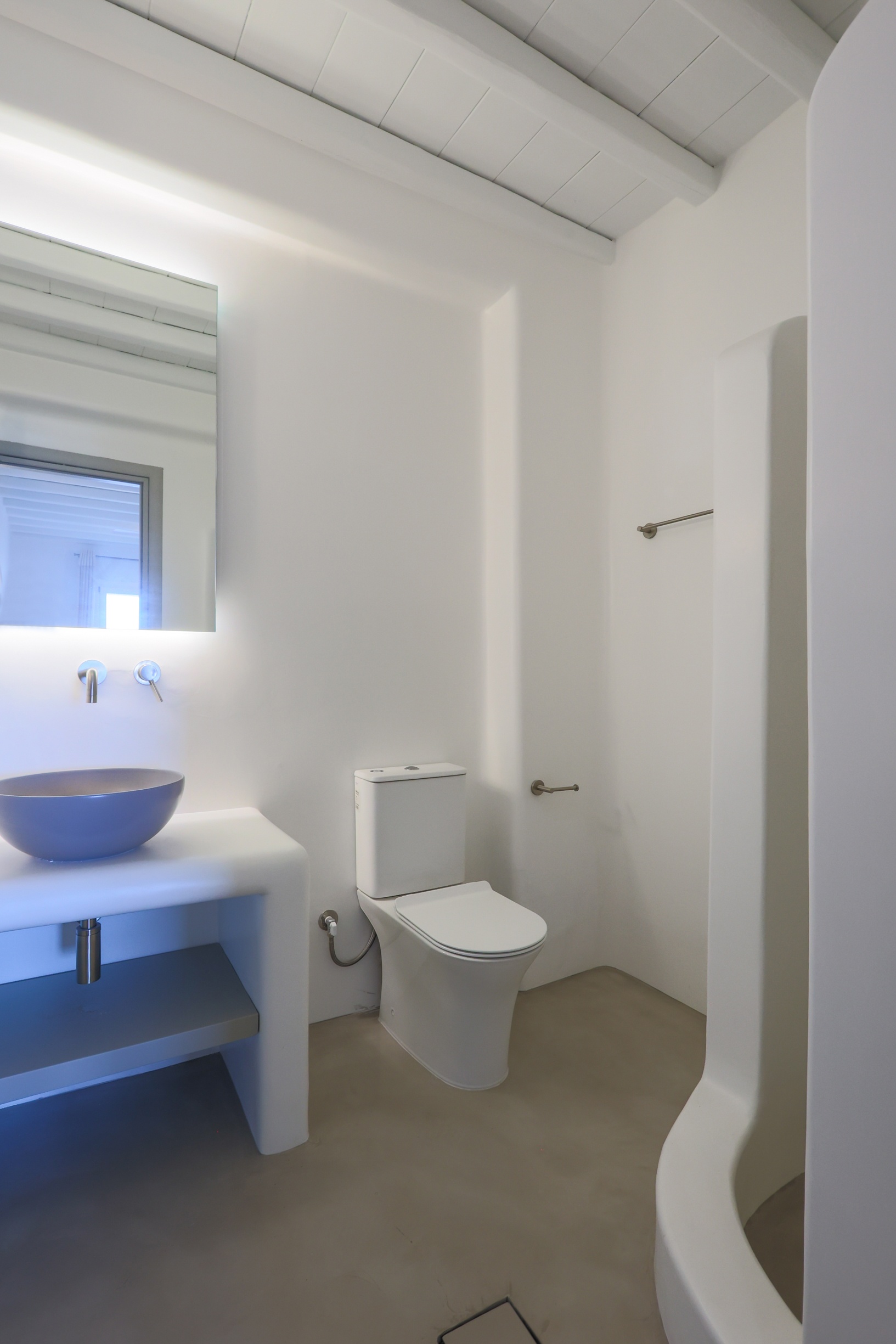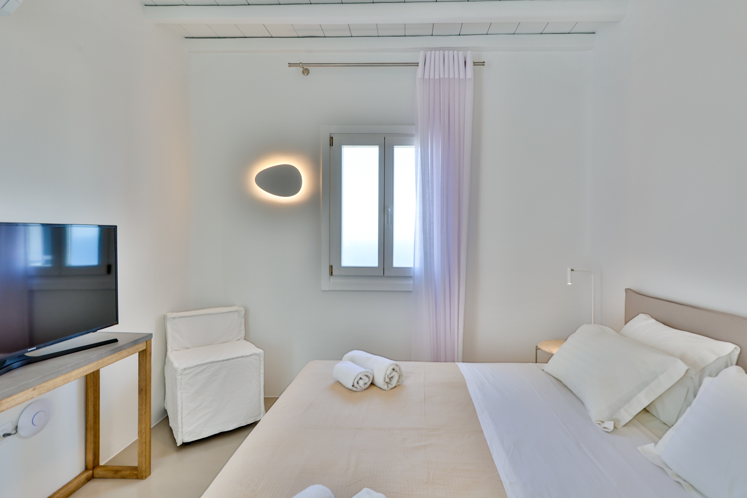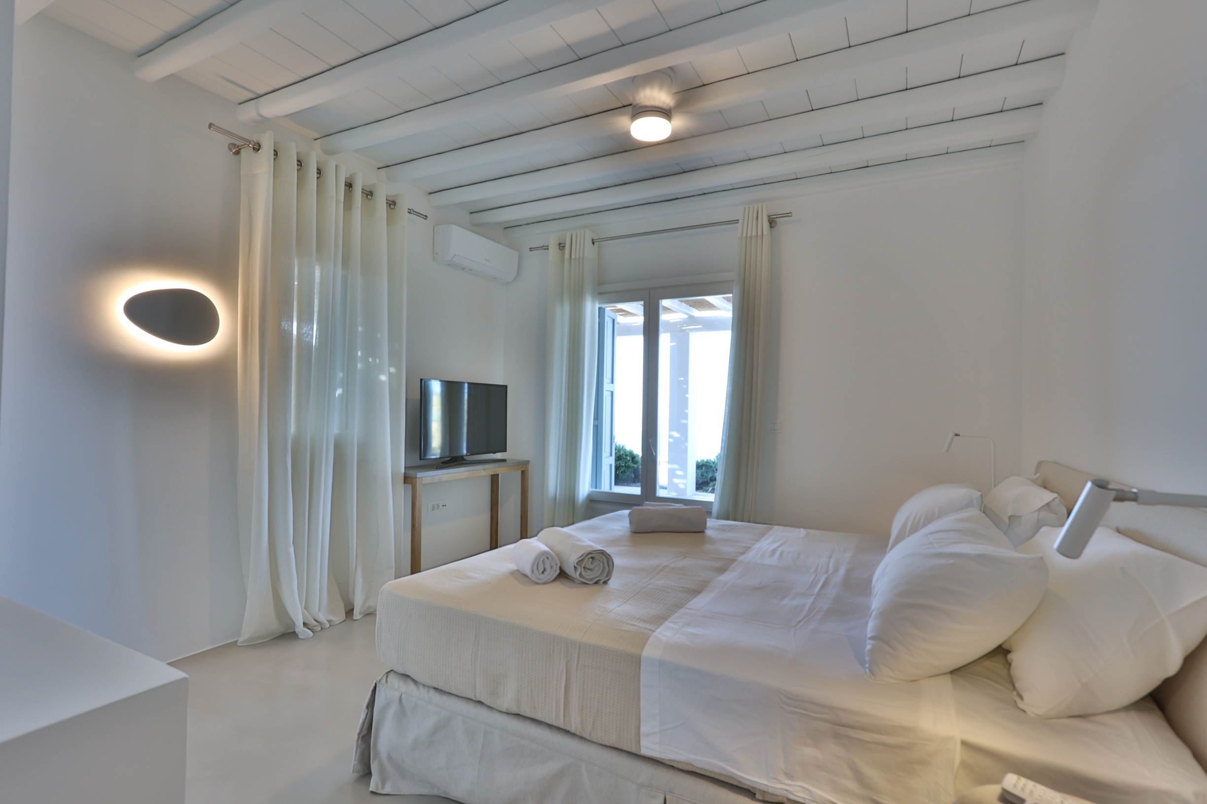 The villa’s interior spaces reflect a seamless blend of Cycladic charm and modern elegance. A fully equipped kitchen allows for effortless dining experiences, whether preparing casual meals or hosting private chef dinners. Spacious living and dining areas provide welcoming environments for relaxation, social gatherings, and entertainment.